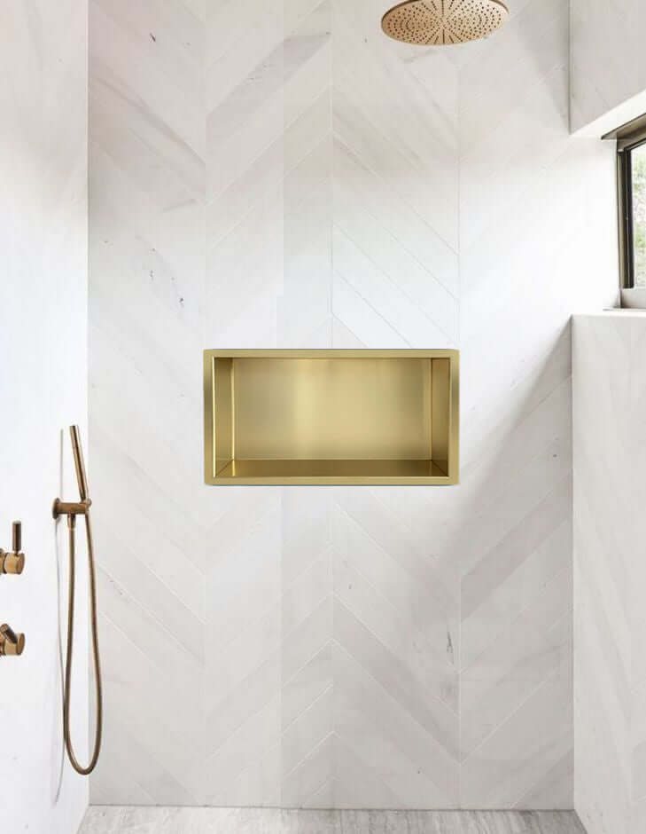 Deze inbouwnis is 10 cm diep en is geborsteld messing, daardoor is hij goed te combineren met andere geborsteld messing producten van Wiesbaden Sanitair.