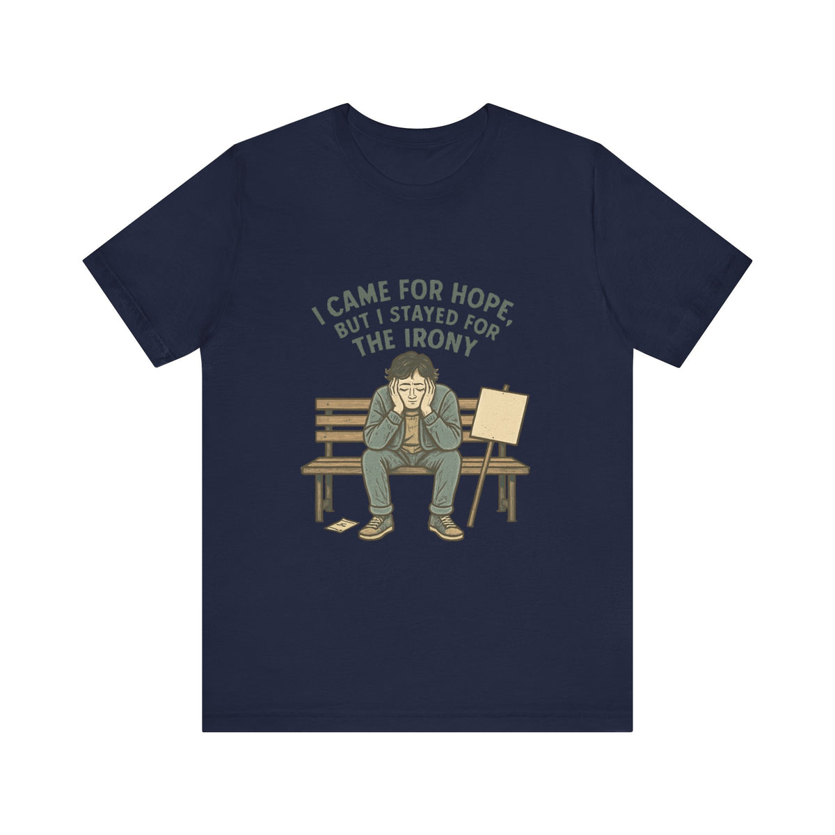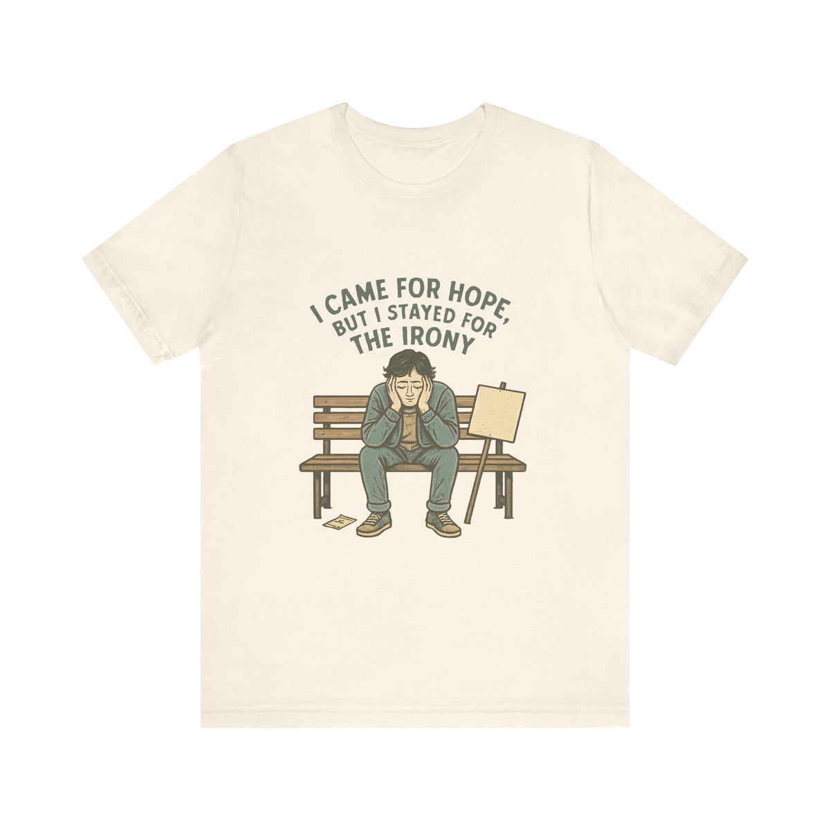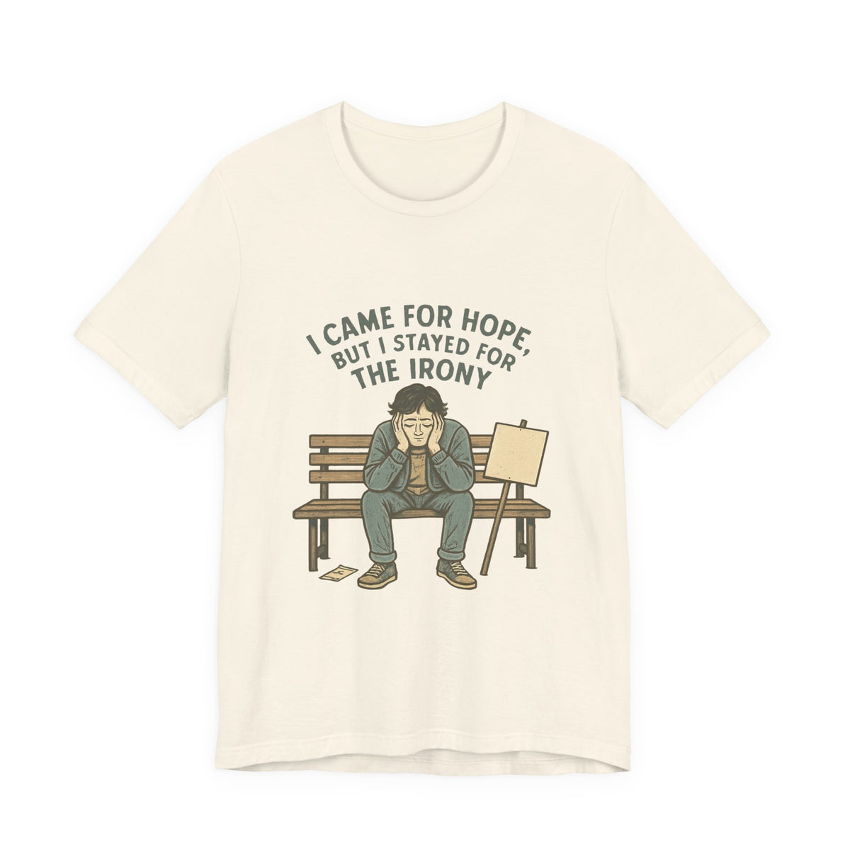 A soft, lightweight jersey tee that speaks to quiet humor and worn-in honesty. The shirt shows a lone figure on a park bench beneath the words “I came for hope, but I stayed for the irony,” blending deadpan wit with gentle illustration. It layers easily under jackets or wears solo on warm days. The breathable Airlume combed cotton feels cool against skin while the crew neckline and retail fit keep the silhouette clean and simple. Subtle details — ribbed collar, shoulder tape, and tear-away label — make it comfortable for everyday wear without fuss. This tee settles into daily routines: walking city streets, meeting friends at a café, or staying in with sketchbooks and quiet sarcasm. It’s crafted to hold shape through washes and to showcase crisp sleeve and label prints thanks to modern DTF/DTG printing methods, all from a responsibly made Bella+Canvas base.