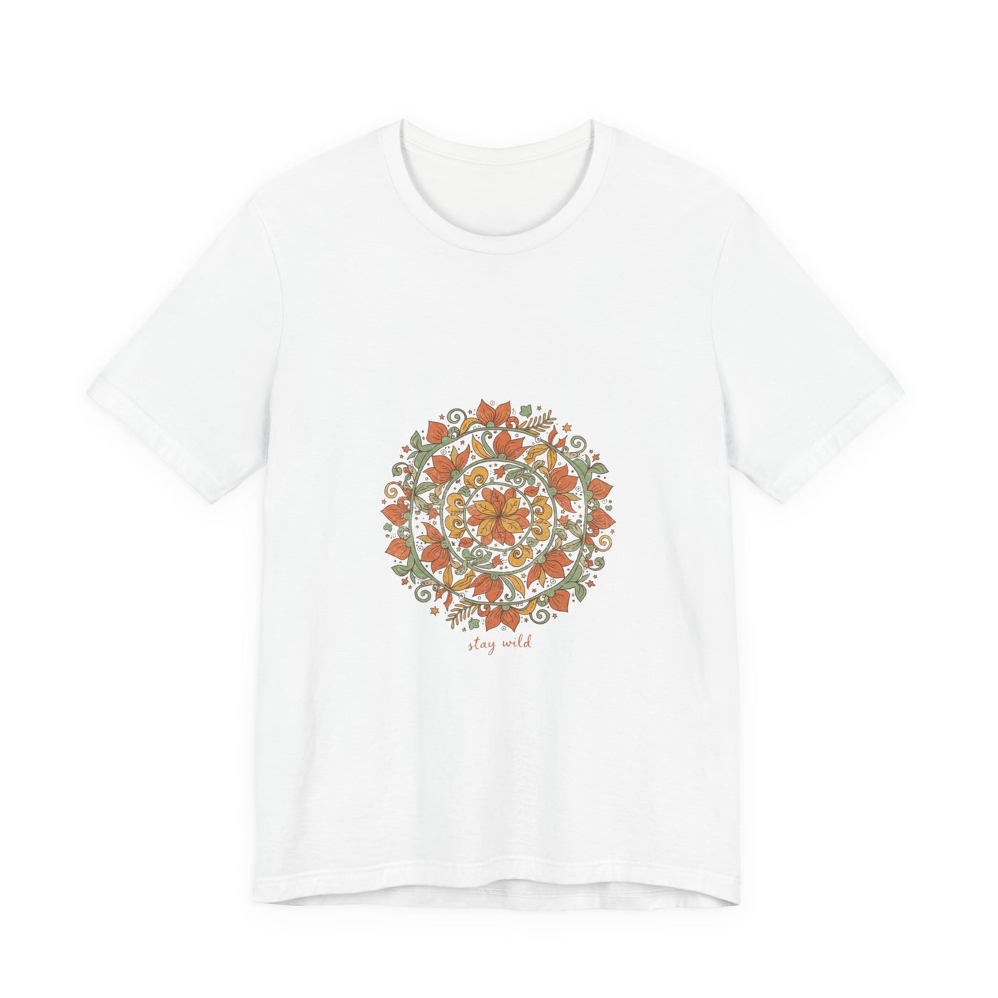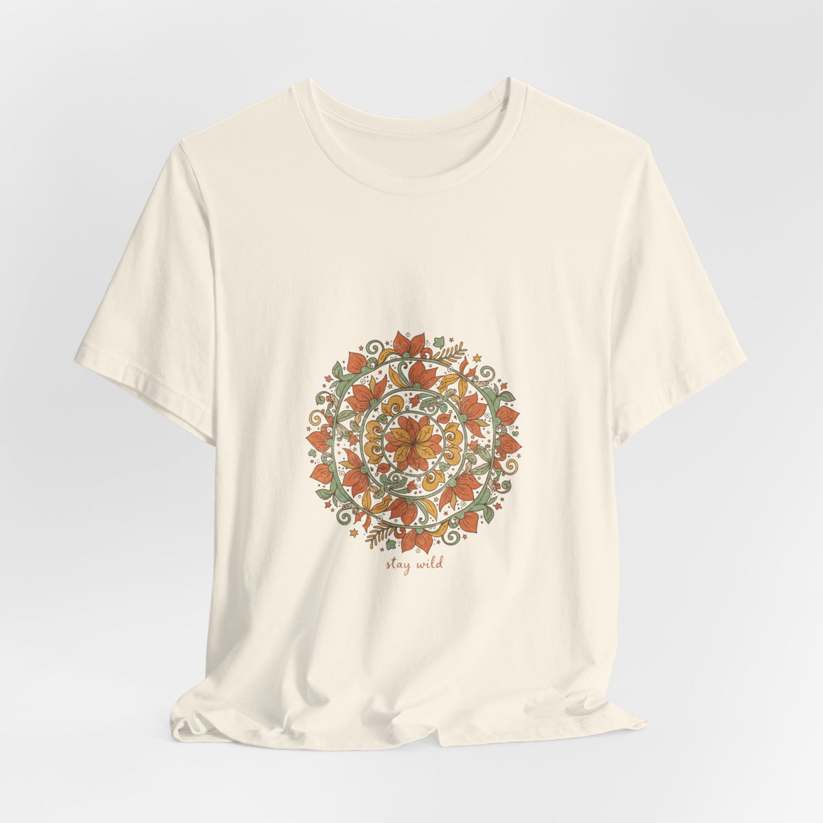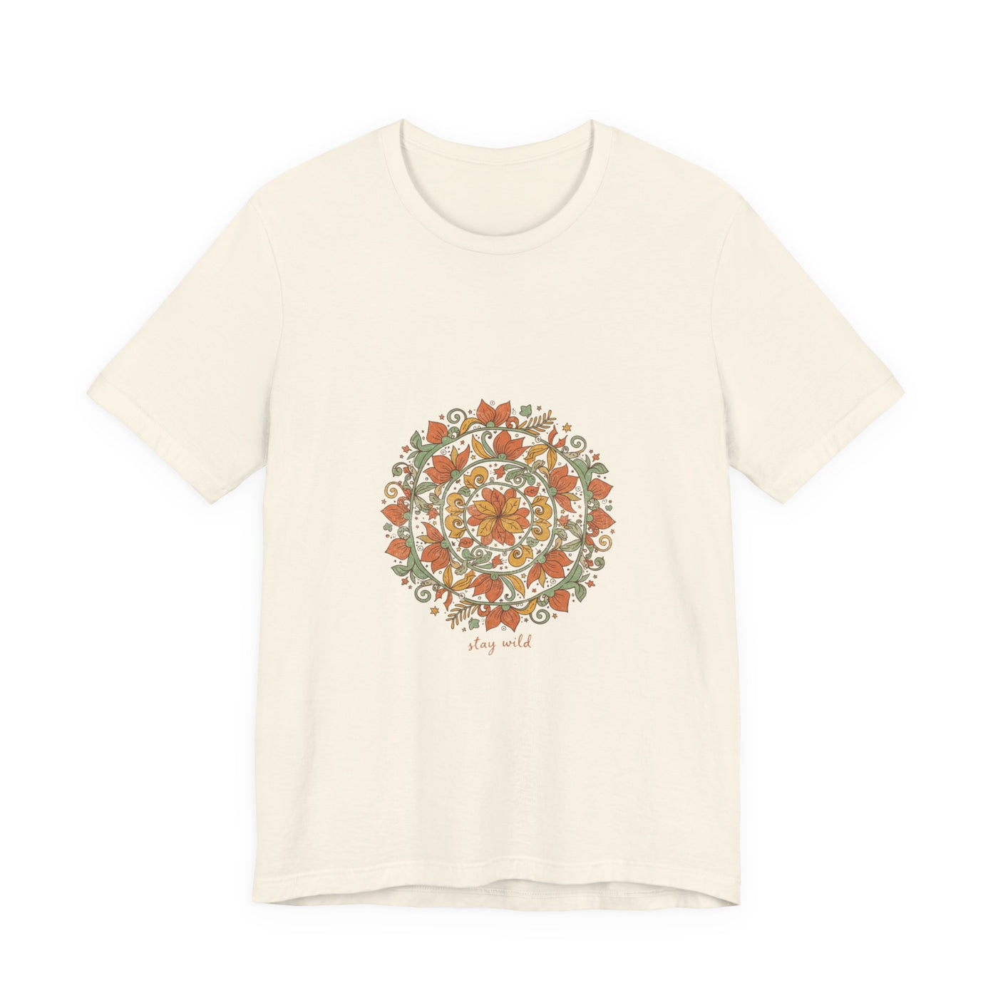 Warm, hand-drawn mandala print centered on a soft unisex tee that channels artisanal boho vibes. Earthy rusts, olive greens, and muted golds form an imperfect, textured mandala with ornamental paisley and sunburst details, giving a crafted, tapestry-like look suited to relaxed, festival-ready wardrobes. Fits into the boho aesthetic by prioritizing pattern and natural tones over type, appealing to shoppers seeking wearable, handmade-feeling pieces.