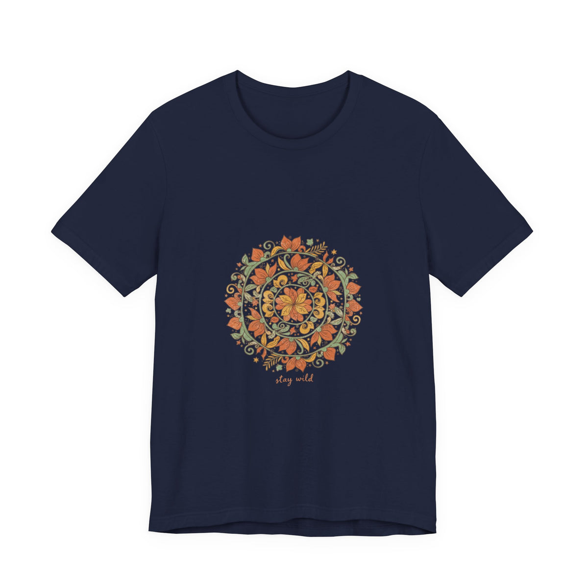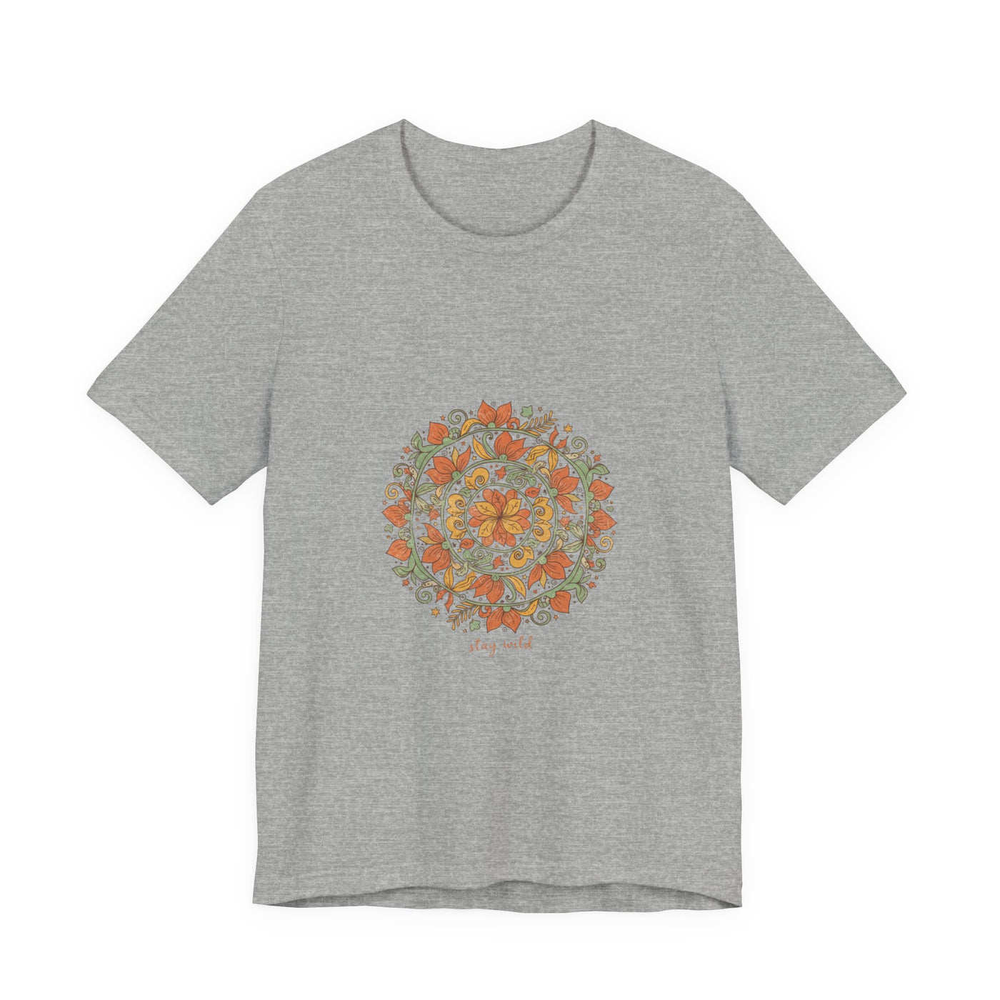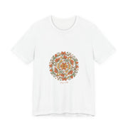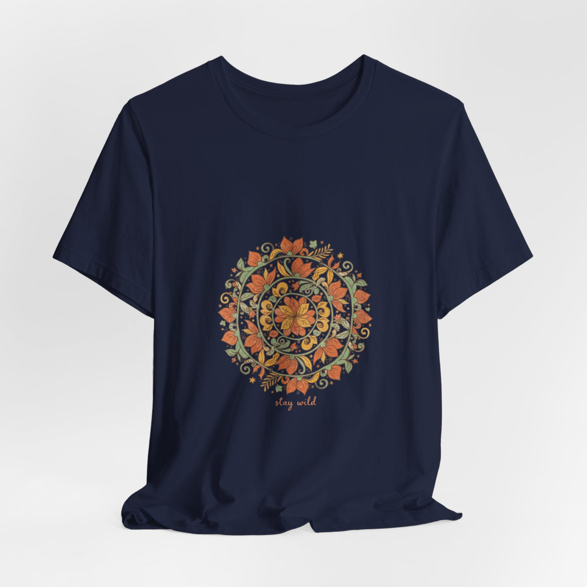 Warm, hand-drawn mandala print centered on a soft unisex tee that channels artisanal boho vibes. Earthy rusts, olive greens, and muted golds form an imperfect, textured mandala with ornamental paisley and sunburst details, giving a crafted, tapestry-like look suited to relaxed, festival-ready wardrobes. Fits into the boho aesthetic by prioritizing pattern and natural tones over type, appealing to shoppers seeking wearable, handmade-feeling pieces.