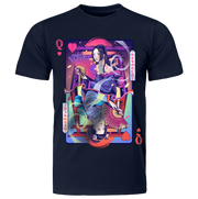 The Hāto no Joō (Queen of Hearts) design is a striking fusion of tradition and cyberpunk aesthetics, embodying the duality of past and future with a distinctly Japanese twist. Inspired by the classic playing card, this artwork presents a mirrored Queen—one side reflecting the grace of ancient Japan, the other infused with a futuristic edge.
