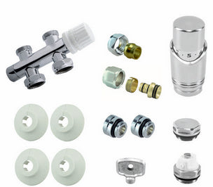 - - 2 rozetten, wit, 15 mm - 2 rozetten, wit, 16 mm - 1 radiateur blindstop, 1/2 - 1 radiateur draaibare ontluchter, 1/2 - 1 radiateur ontluchtingssleutel