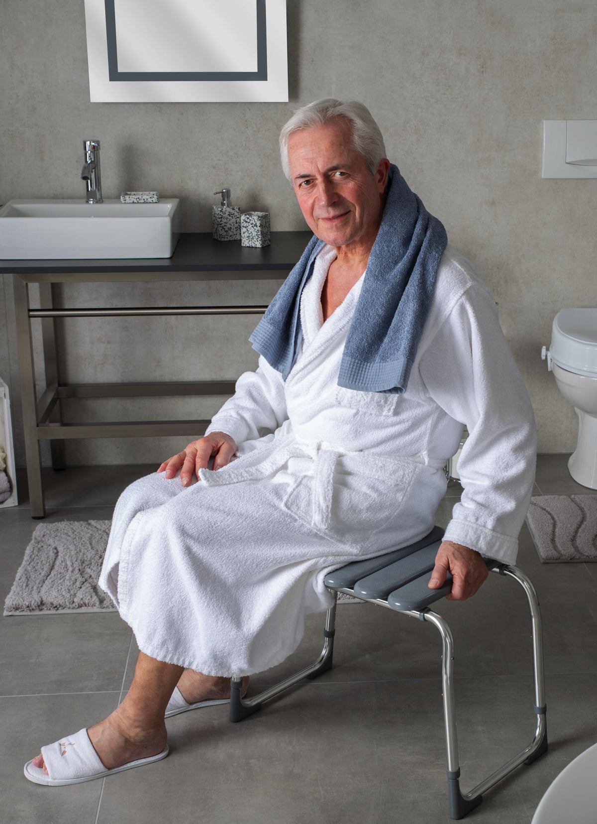 Veiligheidsinformatie: zorg ervoor dat de pootjes hoorbaar op hun plaats klikken en op dezelfde hoogte zijn voordat je de badkamerkruk gebruikt. Schommel de badkamerkruk niet en verplaats deze niet terwijl je erop zit.