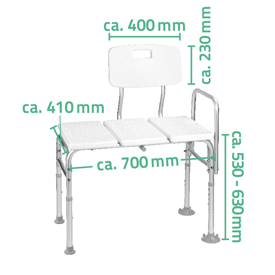 Met de bad-transferbank word het in- en uitstappen van de badkuip gemakkelijk en veilig. Het verstelbare hulpmiddel heeft een royaal zitvlak en is verstelbaar in hoogte. Plaats de transferbank over de rand van de badkuip. Neem plaats op het zitgedeelte buiten de badkuip, til je benen in het bad en hou de armleuning vast. Vanuit deze positie kun je jezelf in het bad plaatsen. De bad-transferbank heeft een draagvermogen van maximaal 150 kg.