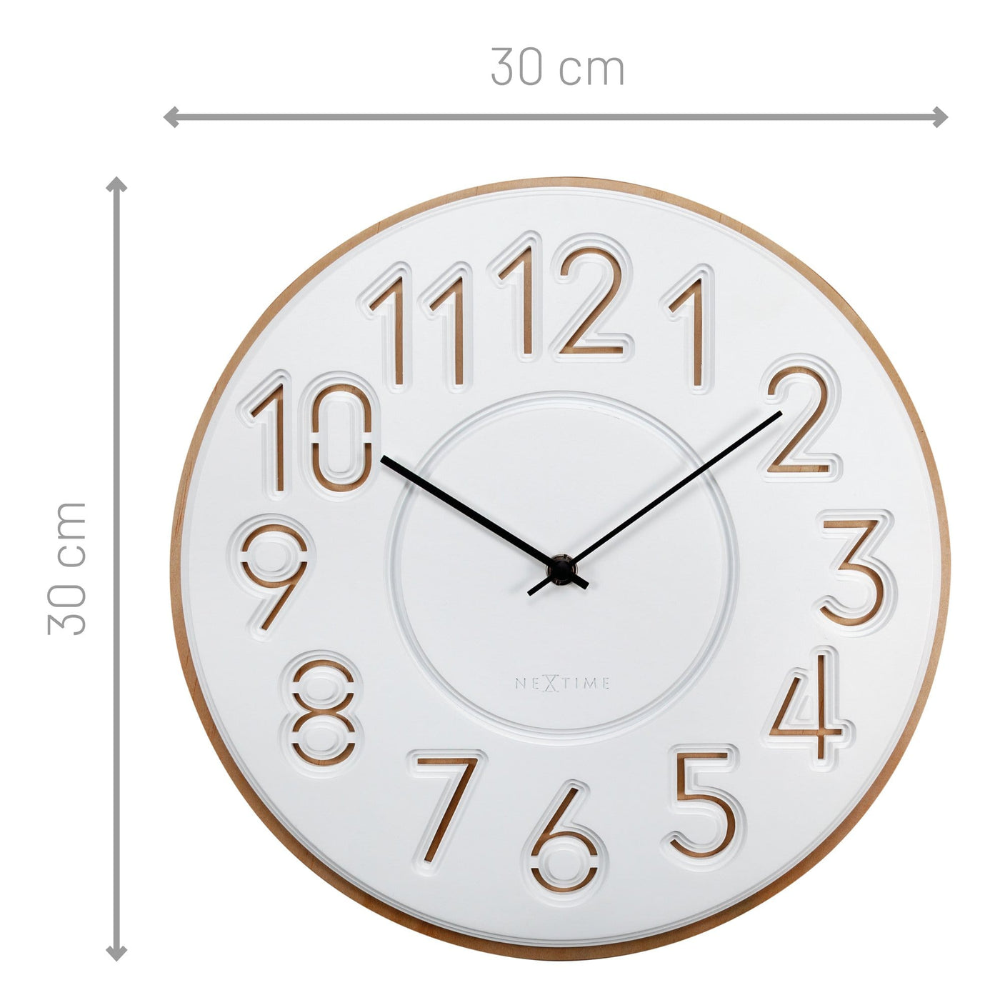 Product specifications: • Material: Concrete/ Wood • Color: White • Clock type: Wall clock • Size: Ø30cm • Battery Type: 1x AA battery, not included • Movement: Silent, so no ticking sound! • Warranty: 2 years factory warranty