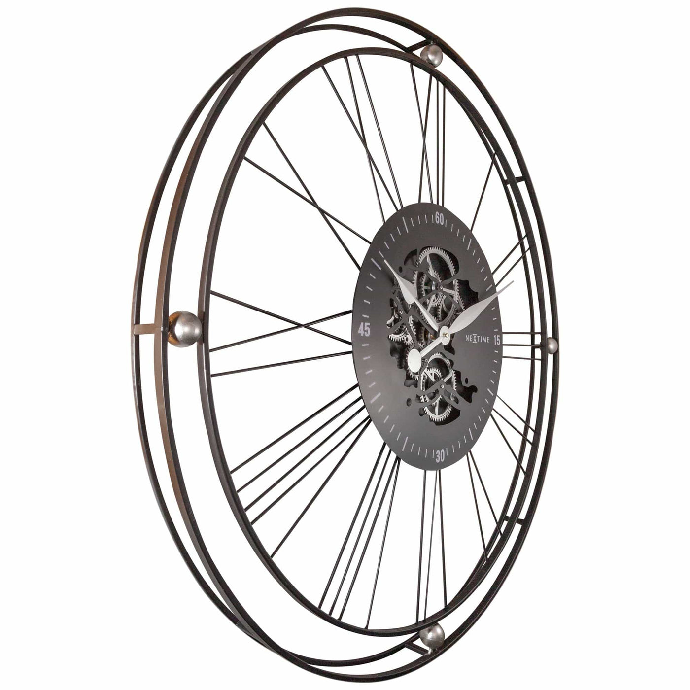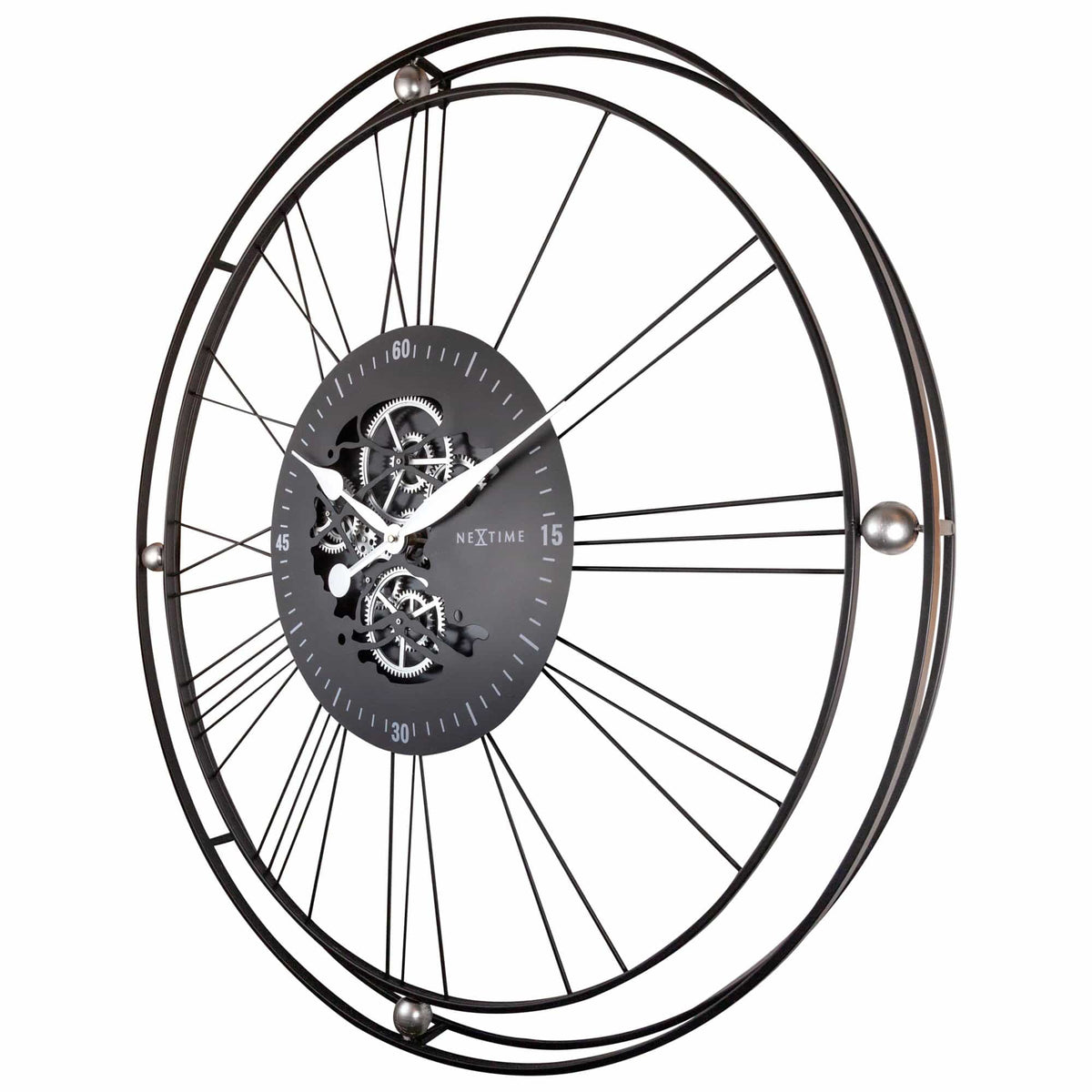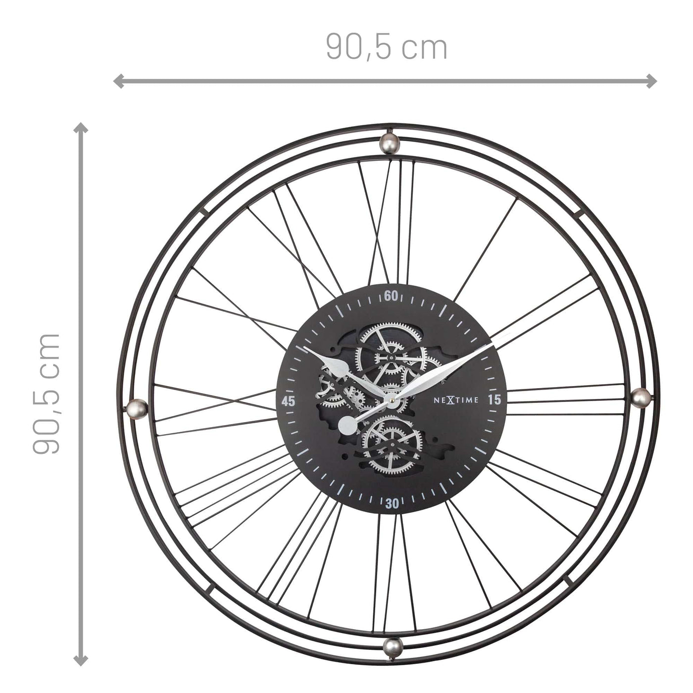 The NeXtime "Roman Gear Clock XXL" oversized (90.5cm) black metal gear clock with classic roman numbers brings an industrial style into your home.The stunning real moving gears matches perfectly with the romantic style hands.This open-faced design is a perfect addition to your room. The moving gears are separately controlled from the clock and can be easily switched off. This large clock is available in Silver of Copper and runs on 3x AA battery (not included).