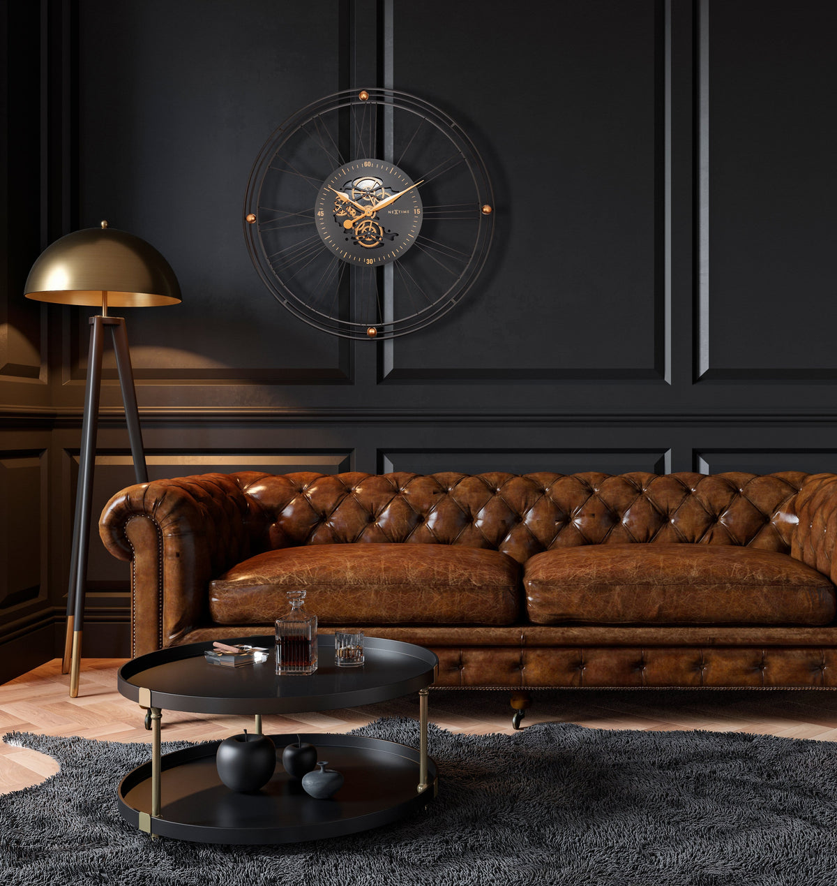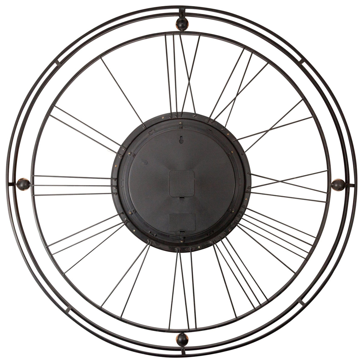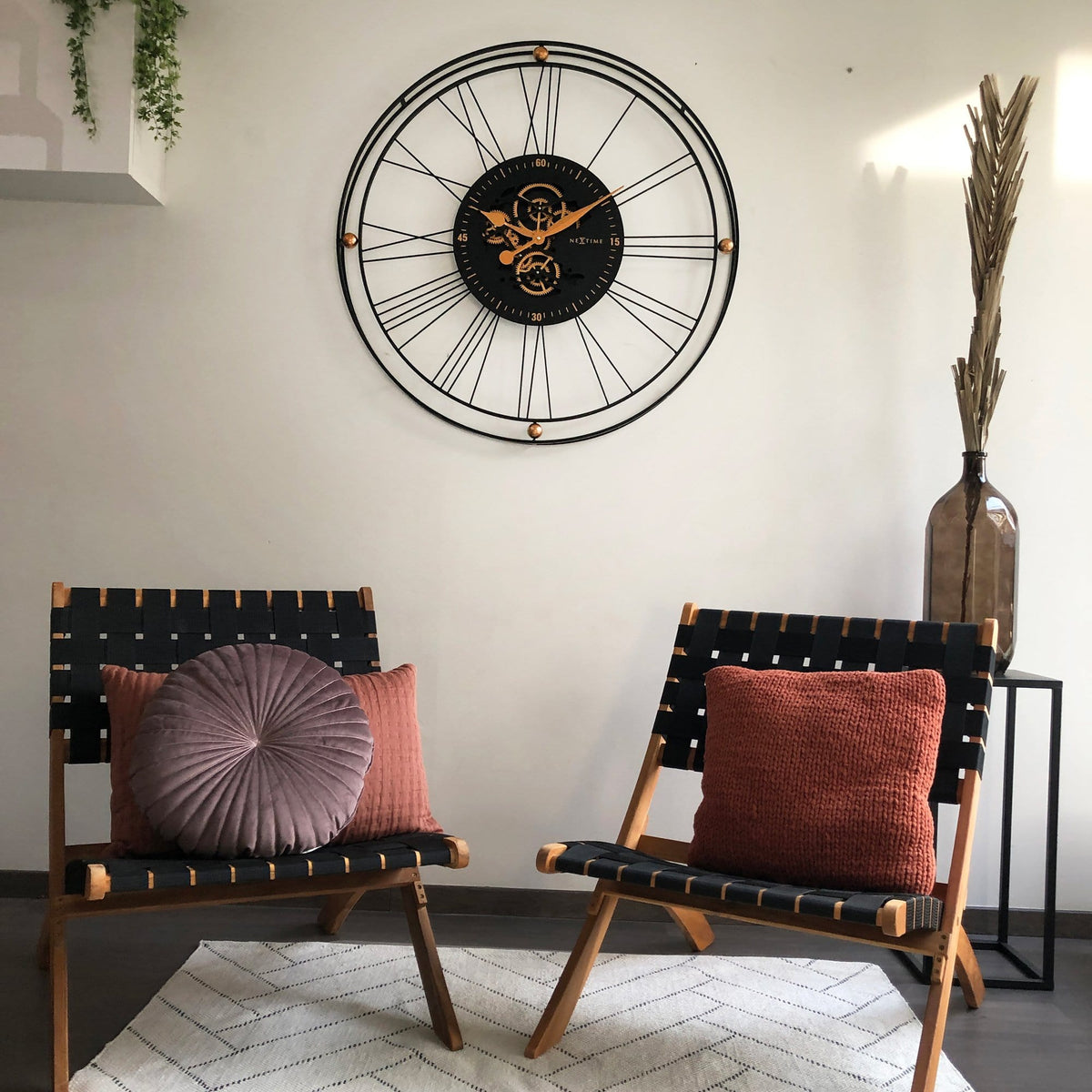 The NeXtime "Roman Gear Clock XXL" oversized (90.5cm) black metal gear clock with classic roman numbers brings an industrial style into your home.The stunning real moving gears matches perfectly with the romantic style hands.This open-faced design is a perfect addition to your room. The moving gears are separately controlled from the clock and can be easily switched off. This large clock is available in Silver of Copper and runs on 3x AA battery (not included).