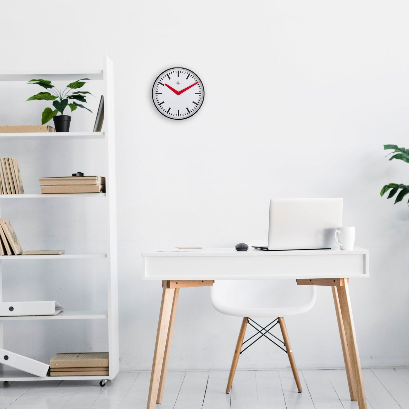 nXt’s Newcastle silent wall clock is a minimalistic design features striking red clock hands on a simple white dial, contrasting with its black case. A simple and bold wall clock that can easily fit for any interior. This clock runs on 1 x AA battery (not included)