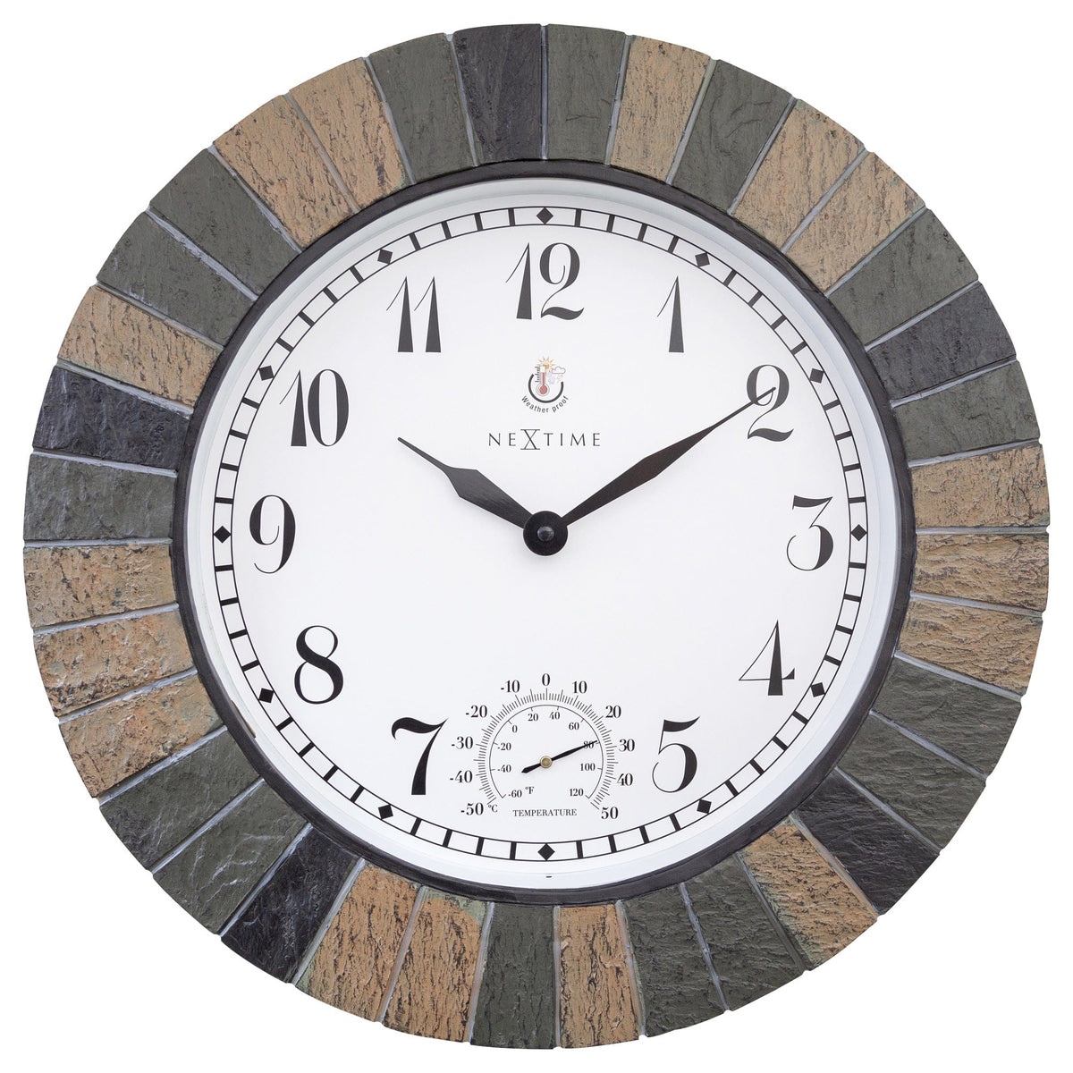 The NeXtime Aster Large wall clock shows you, besides time, also the current temperature in Celsius and Fahrenheit. The clock's raw stone material and colour blends very well with any exterior décor. The clock runs on 1 x AA battery (not included).