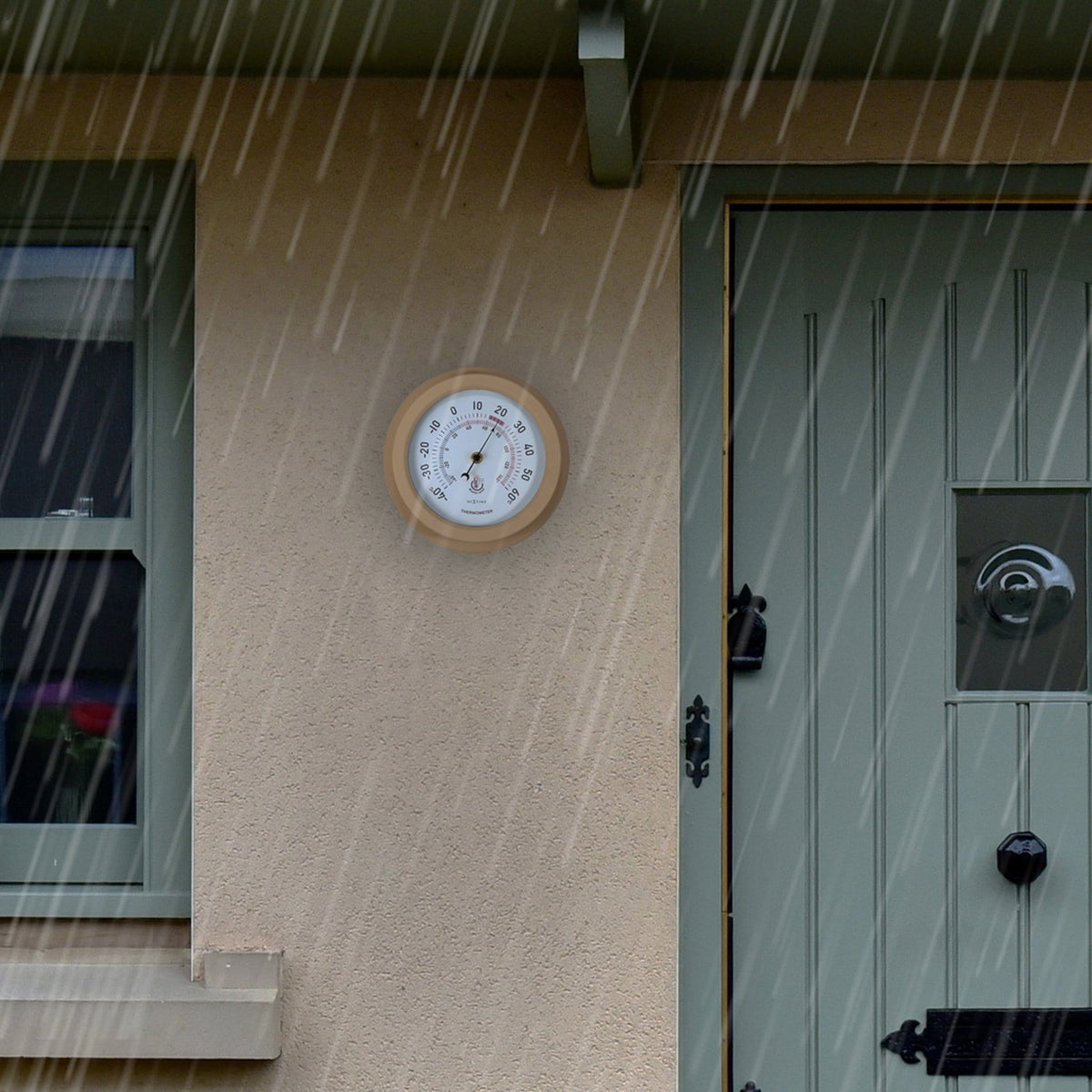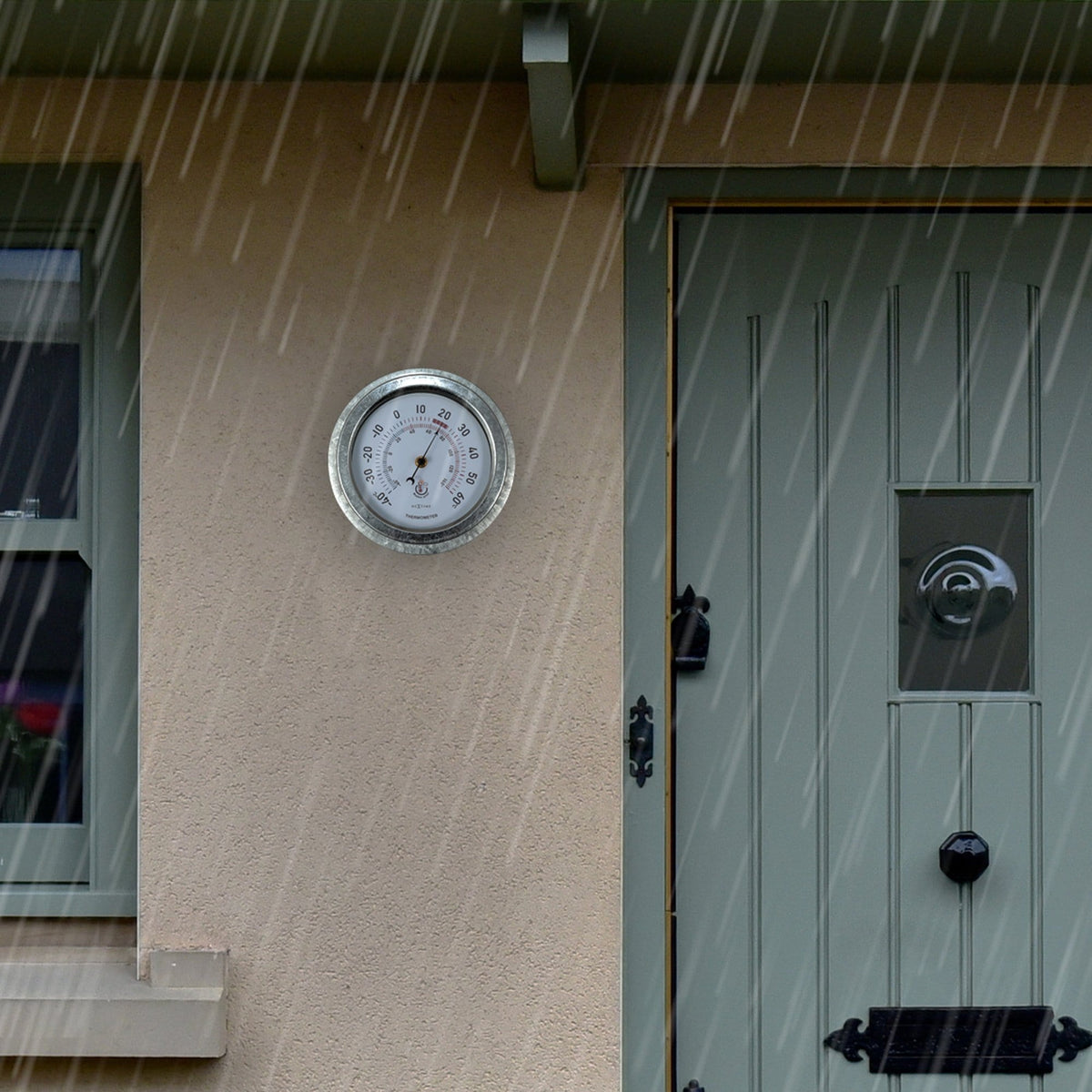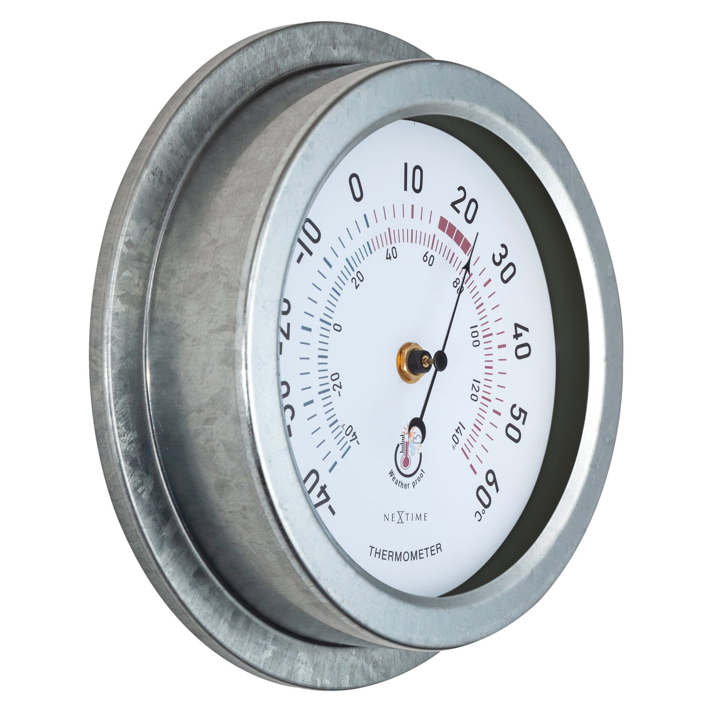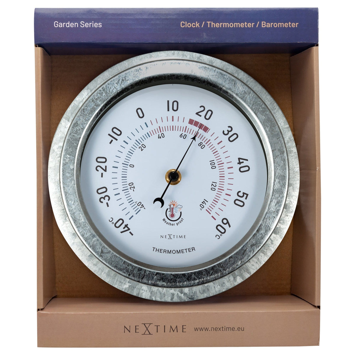 The NeXtime "Lily" is a metal garden thermometer that can be used outside. The use of extra rubber rings to protect the water from reaching the delicate parts of the thermometer is making this meter special and weather proof. The thermometer is robust and from metal and with Ø 22cm it will fit everywhere. The dial is white and has big numbers and blue and red colors for easy understanding of the current temperature. Because of the black hand, the meter is easy to read. The meter doesn't need any batteries.