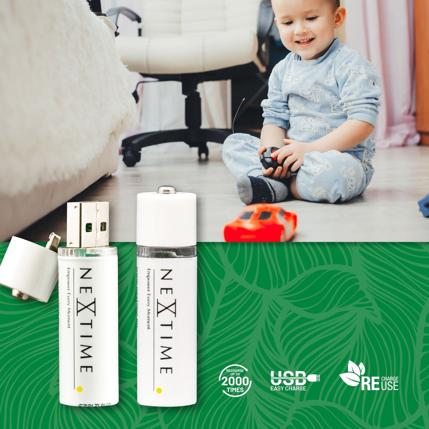 The white USB AA battery is a rechargeable Lithium battery and stays at 1,5V its entire lifespan. It is reusable, so it will help stop wastin batteries.The USB battery comes in a set of 2pcs or 4pcs in a handy storage box. The battery is very easy to charge in any USB port and will be fully charged within 2 to 3 hours!