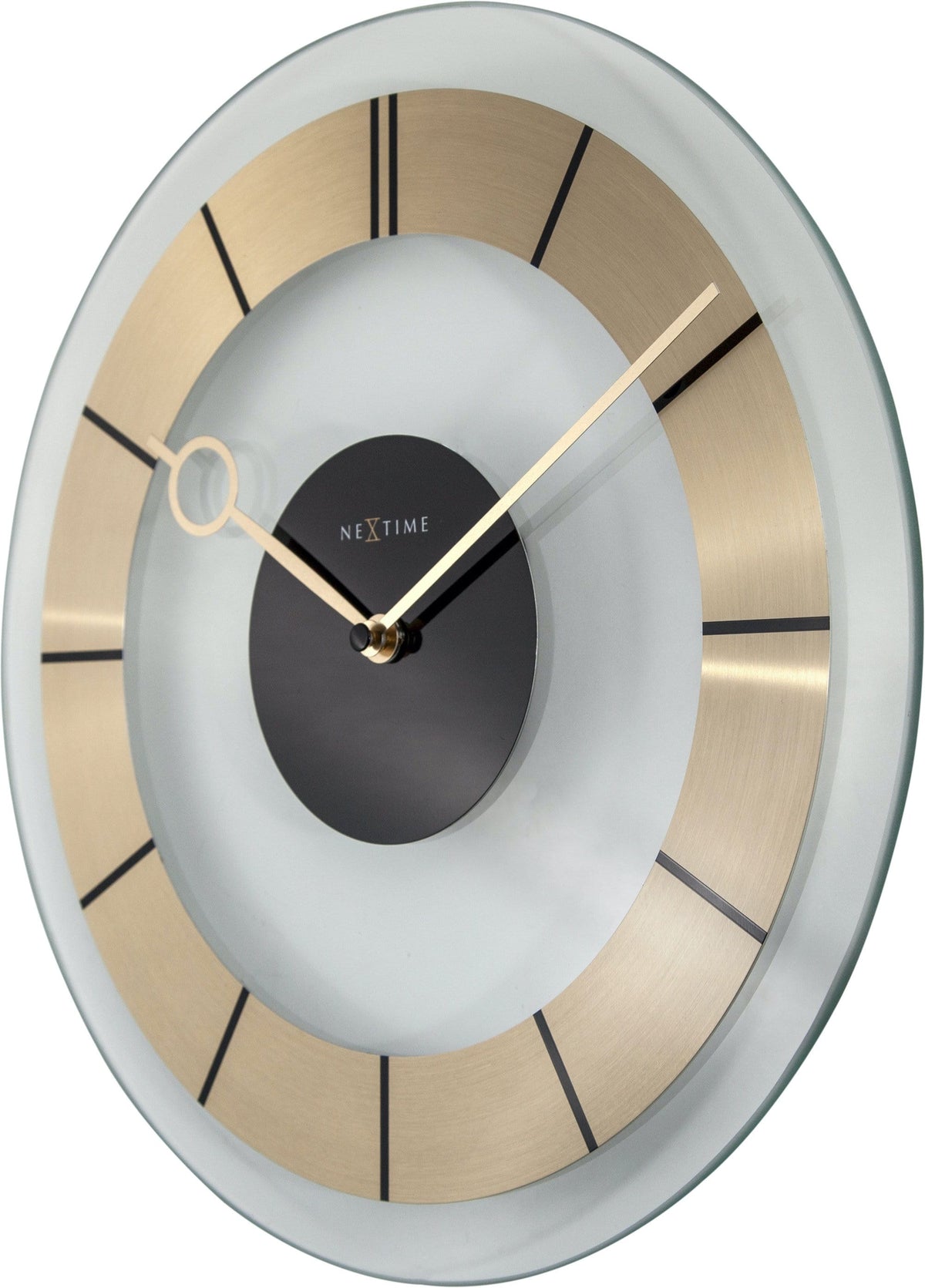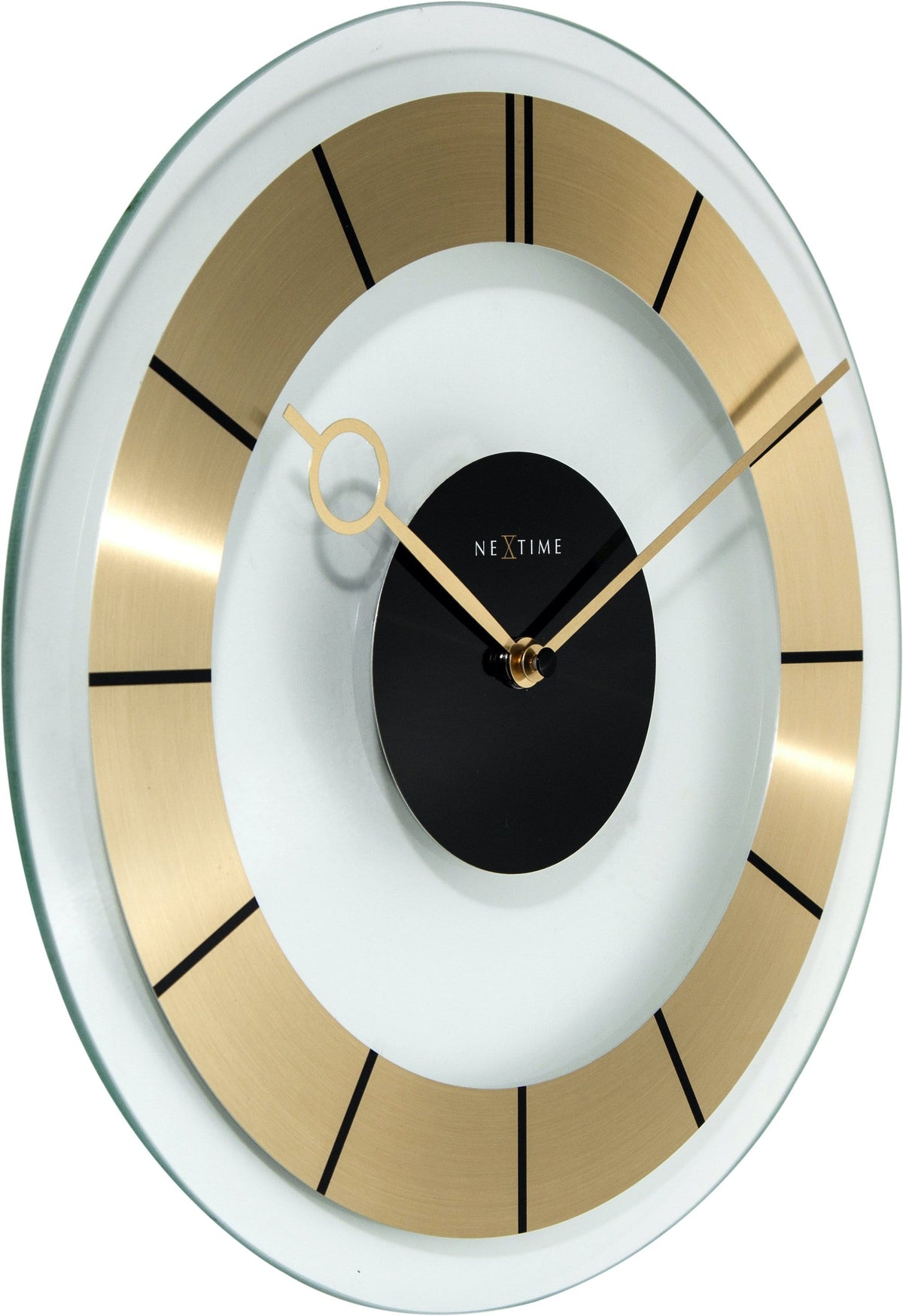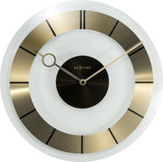 The NeXtime "Retro" wall clock is a trendy version of an old time best-seller. The combination of transparent glass and the golden stainless steel circle with a black centerpiece of the clock ensures a classic 60's design. The golden hands have a polished finish and the hour hand has a fish-eye shape which gives the clock a luxurious feeling. It runs on 1 AA battery (not included)
