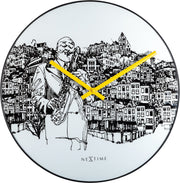The NeXtime "Sax City" is a wall clock (¯ 40 cm) designed by Tim Schoonhoven. The dial is made of glass and has a slim elegant metal edge. This clock has yellow hands and shows an image of a man playing saxophone with a city view for a touch of jazz in your room. The clock is silent and runs on 1x AA batterty (not included).