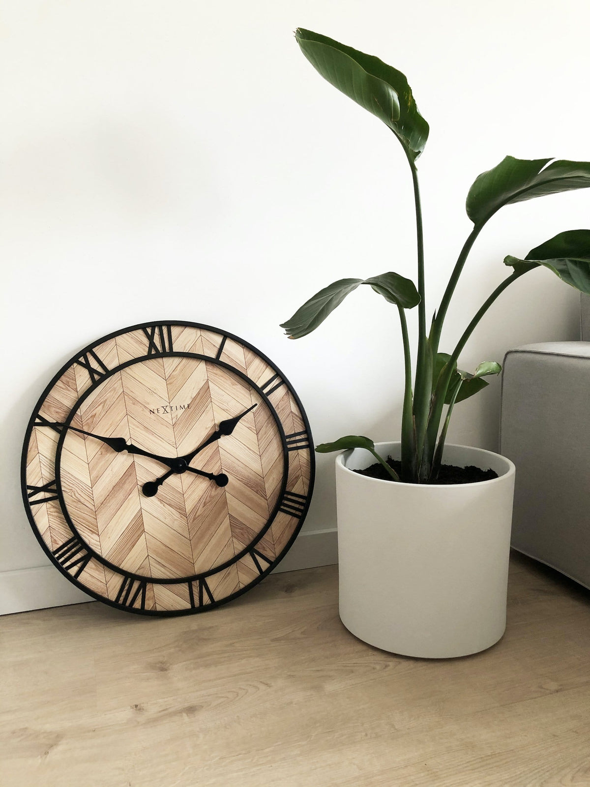The NeXtime "Roman Vintage" is s large round wall clock (Ø58cm). This light brown, wooden clock has a black metal roman index numbers and elegant black hands. The combination of different quality materials and a decorative fish bone pattern gives this clock a special touch of Design. The clock runs on 1x AA battery (not included).