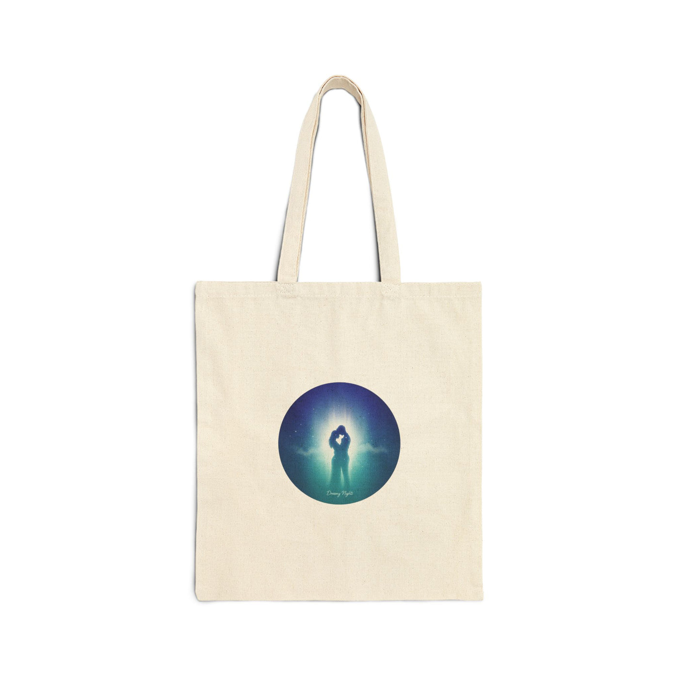 A moody cotton canvas tote featuring a luminous circular nightscape that blends deep teal and indigo glows with a silhouetted figure at its center. The artwork channels the Afterlight Atmospheric Prints trend—quiet, cinematic, and slightly otherworldly—so the tote reads like a wearable vignette for late-night romantics and visual-art collectors. Subtle, minimal composition and rich, luminous colors make it a statement accessory for everyday carry or gallery visits.