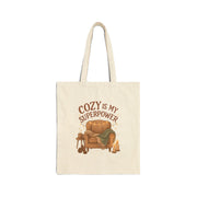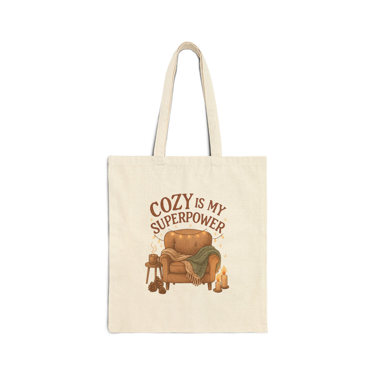 A warm, quietly playful cotton canvas tote that celebrates slow afternoons and small comforts. The front shows a cozy armchair draped with a blanket beside a stack of books and flickering candles, with the phrase “Cozy is my superpower” arcing above. It carries a homemade, lived-in vibe — like bringing your favorite reading nook along for errands, library trips, or weekend markets. The heavy 12 oz canvas holds shape and weight, while the reinforced handles make it easy to sling over your shoulder. Choose natural for a soft, vintage look or black for a low-key contrast that hides everyday marks.