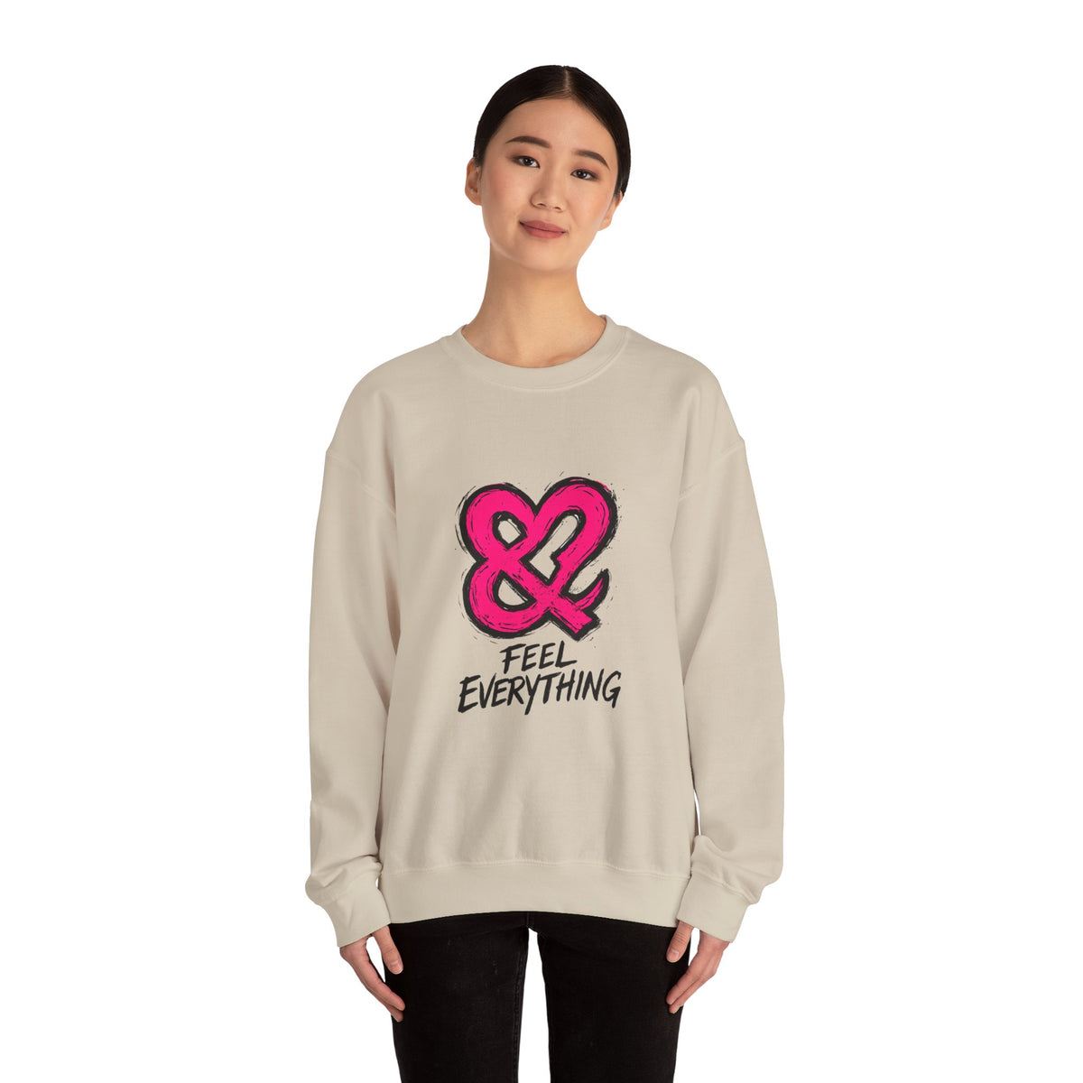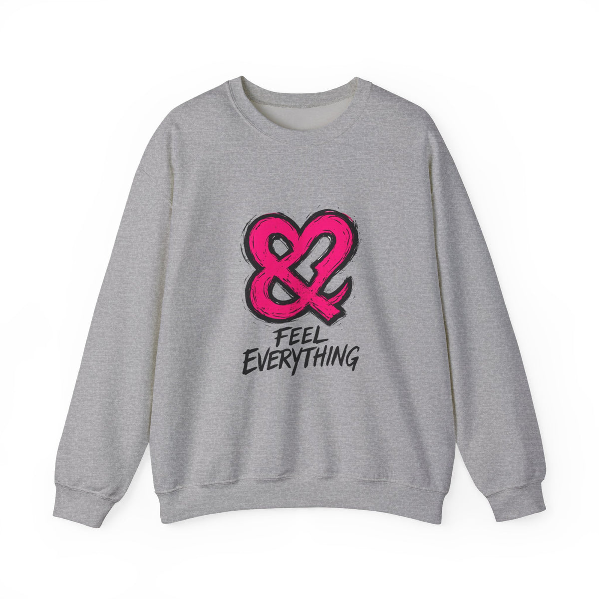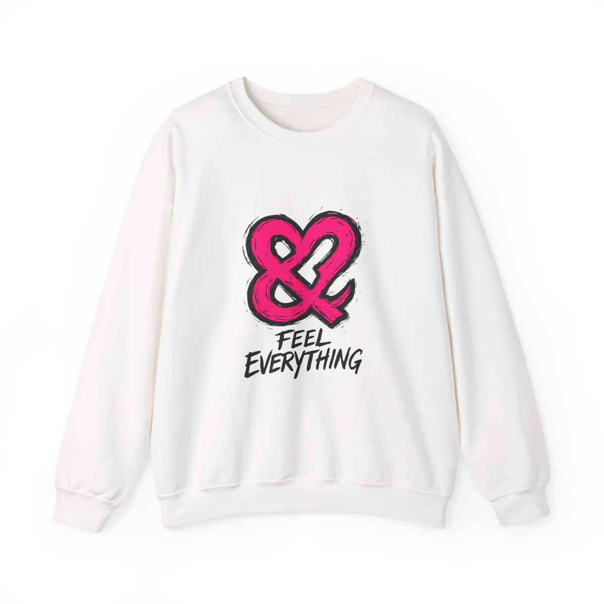 A soft, midweight crewneck sweatshirt with a bold, hand-drawn ampersand and the phrase “FEEL EVERYTHING” across the chest. The neutral white canvas and relaxed classic fit make the graphic pop while keeping the overall vibe calm and wearable. Built with a 50/50 cotton-poly blend and double-needle stitched seams, this sweatshirt feels sturdy without being stiff. Small, thoughtful details — a tear-away neck label, ribbed collar and cuffs, and options for subtle embroidery placement — add purposeful comfort and personalization. Wear it on slow mornings, late-night city walks, or long studio sessions when you want something that says emotional openness without shouting.