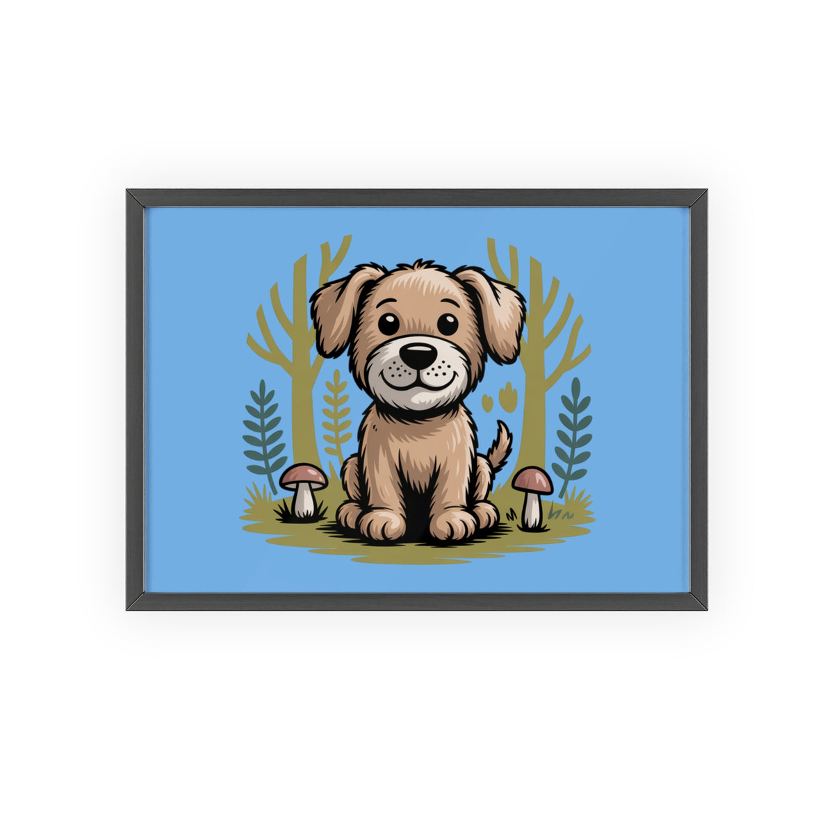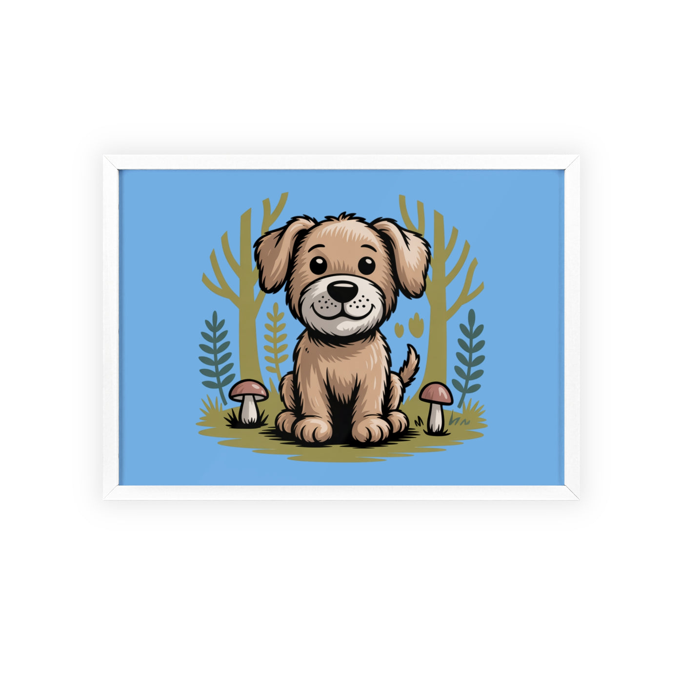 Bring a little everyday joy to walls with this framed poster featuring an affectionate, cartoon puppy set against soft woodland motifs. The warm pinewood frame and protective acrylic glass give the piece a finished, gallery-ready look — it arrives ready to hang so you can brighten a nursery, playroom, or cozy reading corner in minutes. Choose satin or matte paper finishes and pick the frame color that suits your space: Natural Wood for a rustic touch, Black for modern contrast, or White for a light, airy feel. Available in multiple sizes and orientations so the artwork fits a shelf, cluster wall, or lone focal point with equal charm.
