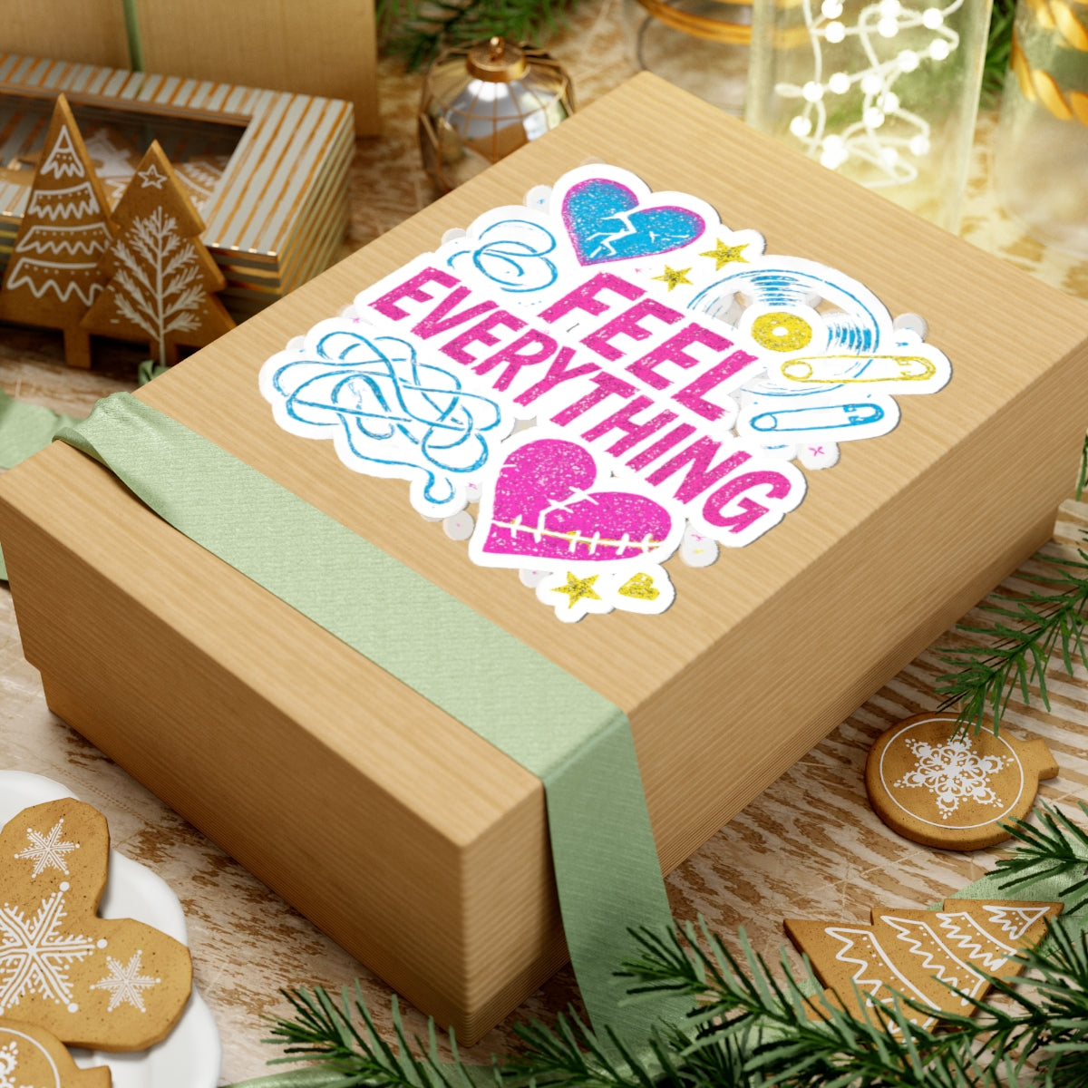 This glossy kiss-cut sticker celebrates emotional honesty with poppy, hand-drawn imagery: bright pink block letters reading “FEEL EVERYTHING” surrounded by glittery hearts, stars, a vinyl record and safety pins. The glossy finish makes colors pop and adds a sleek, tactile shine that catches light on laptops, journals, phone cases, and more. Peel-and-stick application is smooth and bubble-free, and the durable vinyl and permanent acrylic adhesive keep it in place on flat indoor surfaces. Choose between white or transparent back, and from four sizes to suit your space. It speaks to anyone who wears their heart on their sleeve and wants a bold, playful reminder to embrace feeling — a little burst of color and attitude for the things they carry every day.