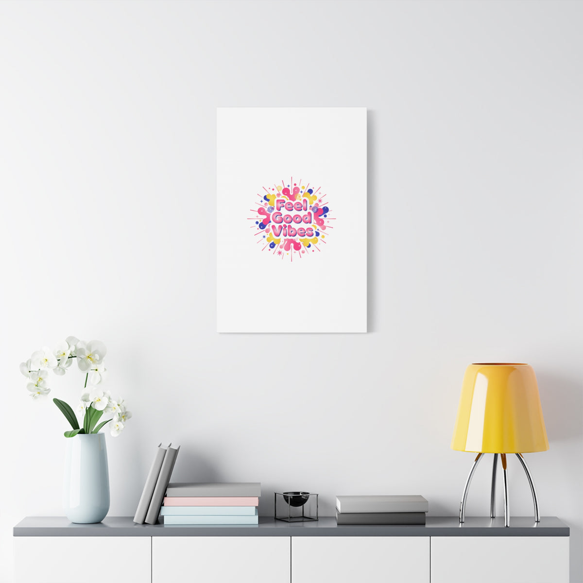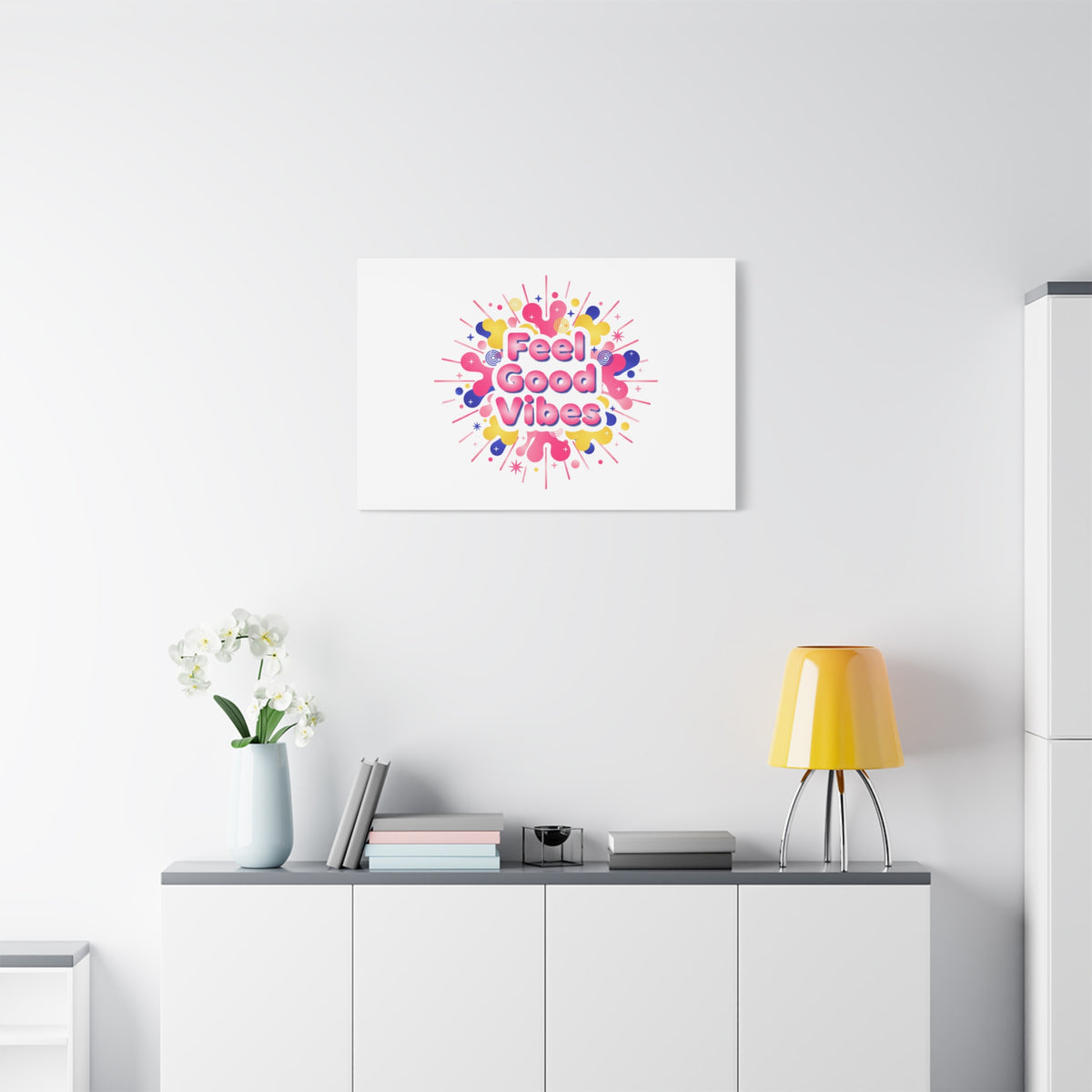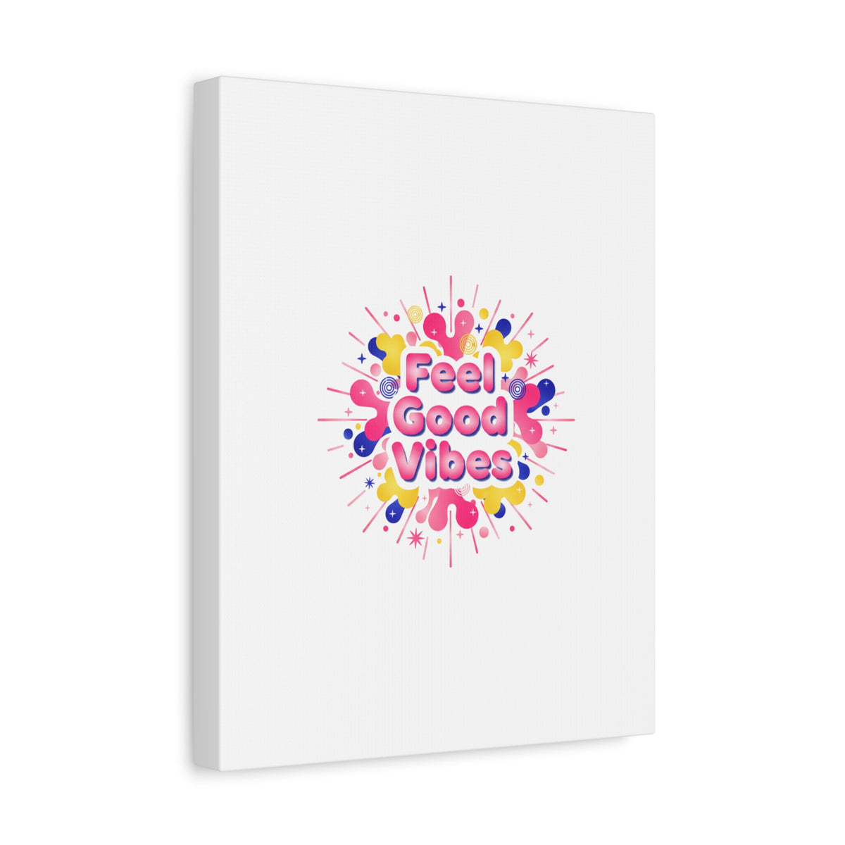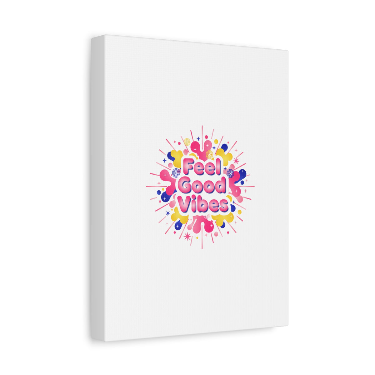 Bright, squishy neon canvas print that channels the Dopamine Decor mood with rounded, glossy lettering and playful 3D-like blobs in electric pinks, lemon yellow and cobalt. The design reads as a burst of sensory comfort — retro Y2K shapes and shiny gradients arranged around a short, upbeat phrase to lift a room’s energy. Sized and finished for wall display, it reads well in small or large formats for color-focused home and self-care corners.