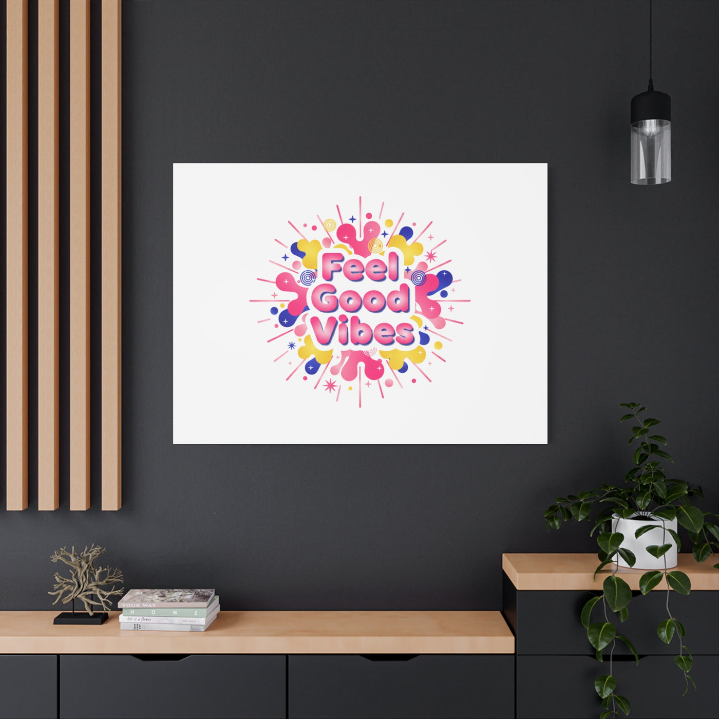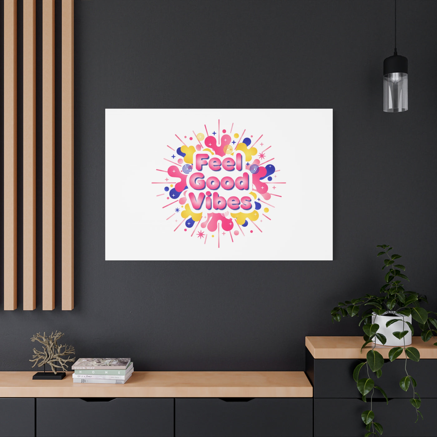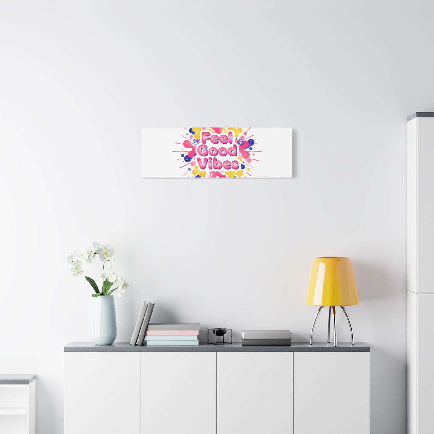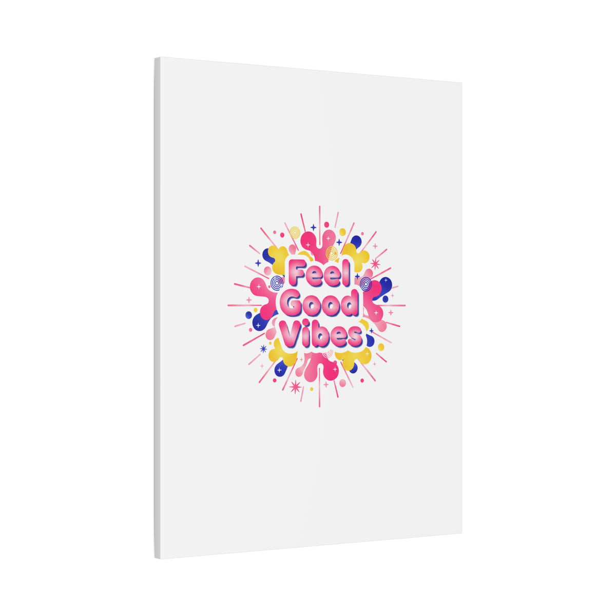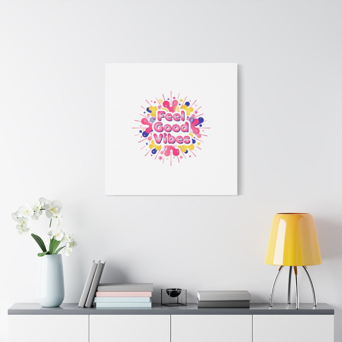 Bright, squishy neon canvas print that channels the Dopamine Decor mood with rounded, glossy lettering and playful 3D-like blobs in electric pinks, lemon yellow and cobalt. The design reads as a burst of sensory comfort — retro Y2K shapes and shiny gradients arranged around a short, upbeat phrase to lift a room’s energy. Sized and finished for wall display, it reads well in small or large formats for color-focused home and self-care corners.
