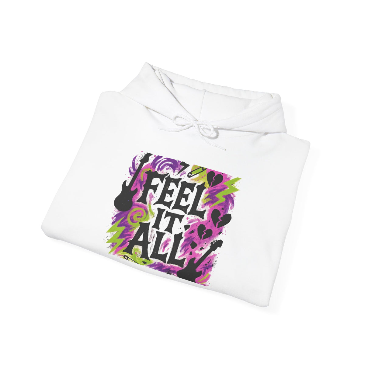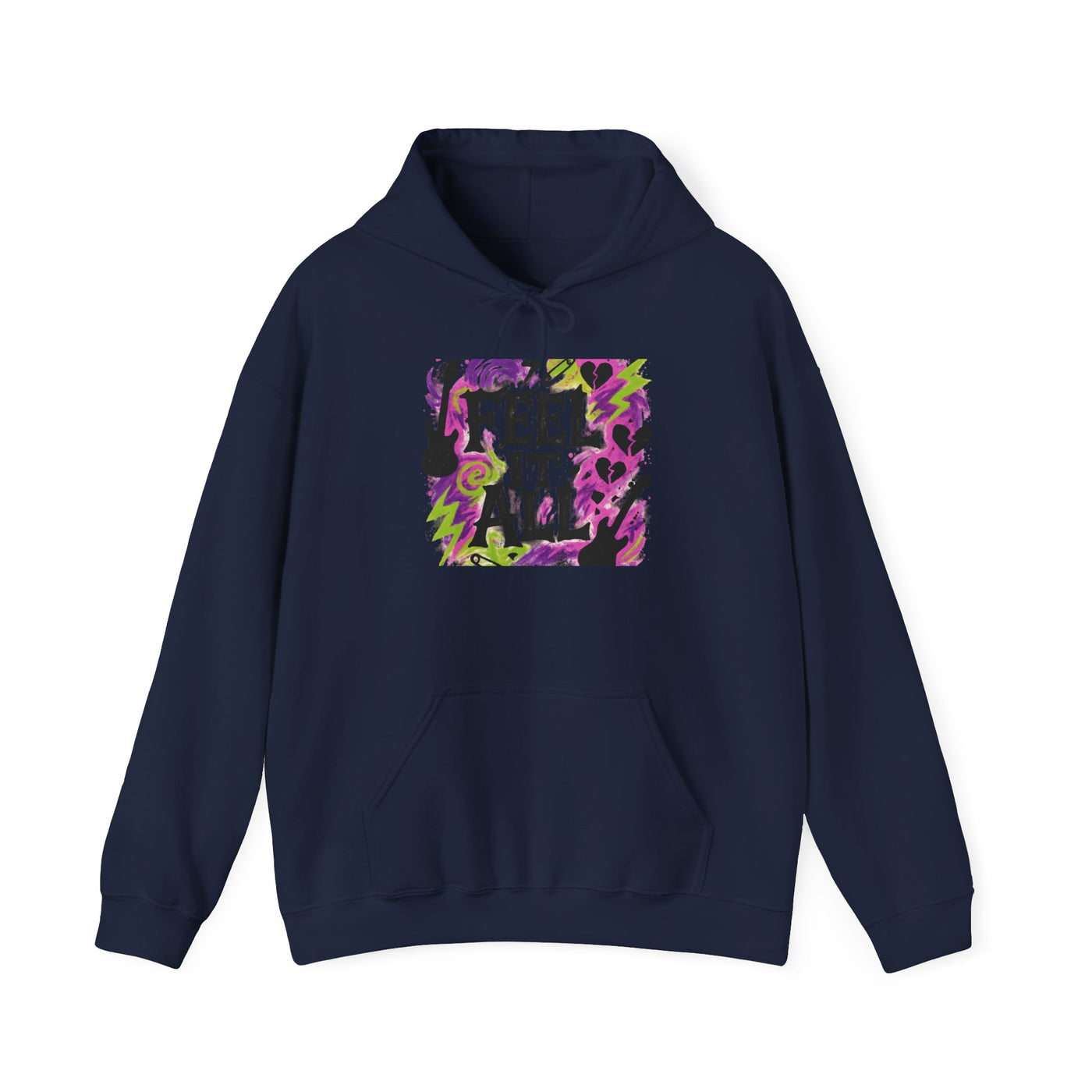 This cozy hooded sweatshirt carries a bold, expressive print that reads “FEEL IT ALL,” set against a vibrant, abstract floral wash of purples, pinks, lime, and black. It wraps you in soft, medium-weight warmth while the roomy kangaroo pocket and adjustable drawstring hood invite quiet moments and honest conversation. Wear it on slow mornings, late-night walks, or when you need a visual reminder to embrace every feeling. The lack of side seams gives a clean silhouette, and the durable 50/50 cotton-poly blend keeps colors vivid and the fabric resilient. Thoughtful production details — tear-away DTF neck label options and OEKO-TEX–rated dyes — keep comfort and care in mind.