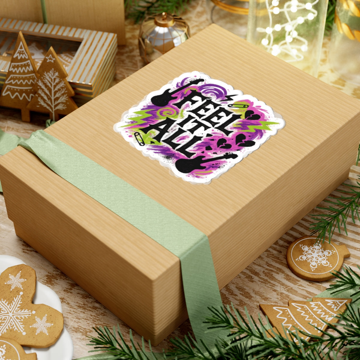 Lively and rebellious, this gloss-finish kiss-cut sticker shouts energy: electric guitars, neon lightning bolts, and bold brush-stroked lettering that reads “FEEL IT ALL.” It sticks cleanly to laptops, journals, and windows, adding a splash of punk-rock color wherever it goes. The vibrant eco-solvent inks give punchy purples and chartreuse highlights, while the durable vinyl and permanent acrylic adhesive keep the design looking fresh through everyday wear. Choose white or transparent backing and from four sizes to get the right scale for your space. This sticker brings a raw, expressive vibe to any surface — a compact statement piece for anyone who wears their feelings loud and proud.