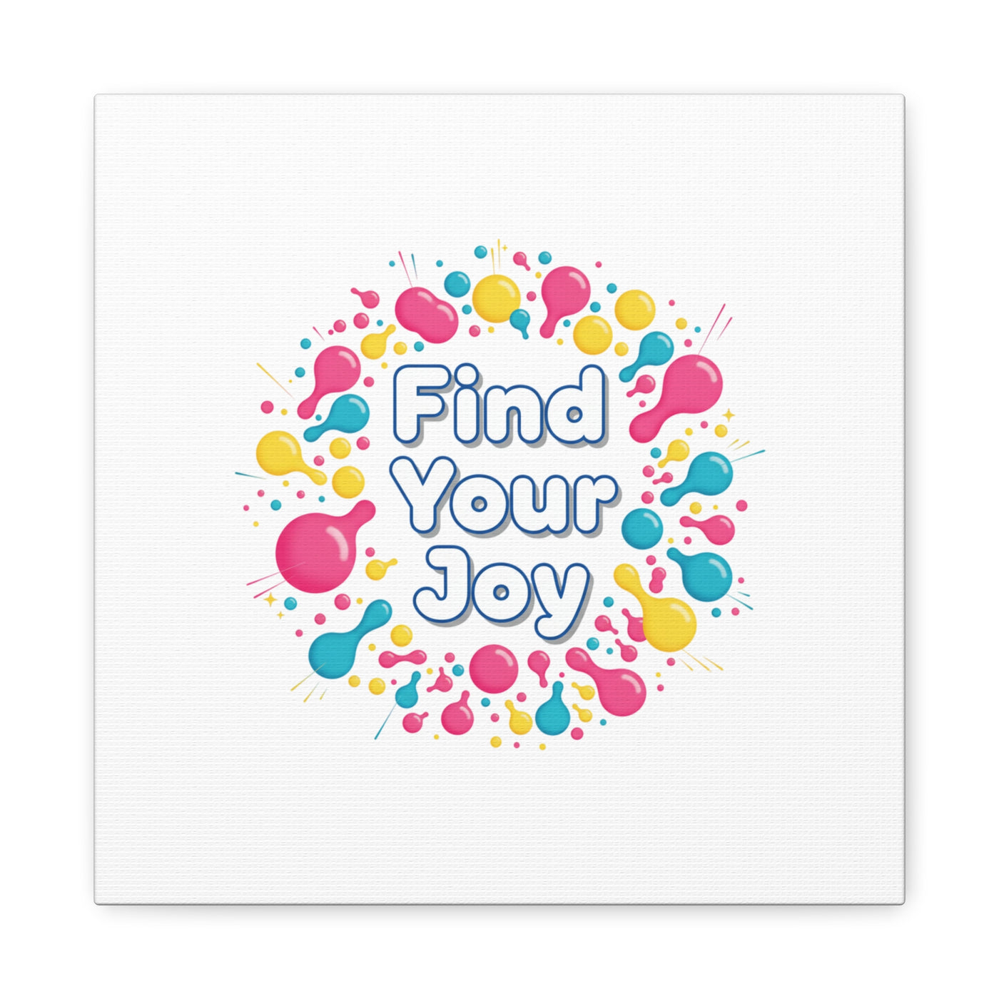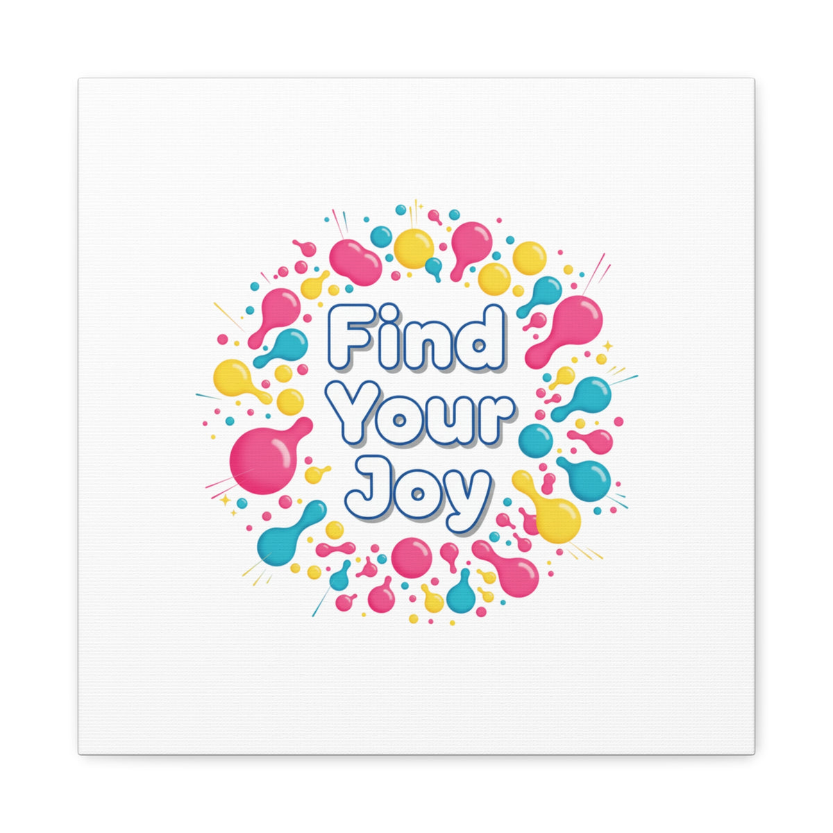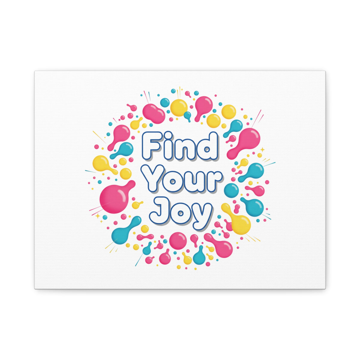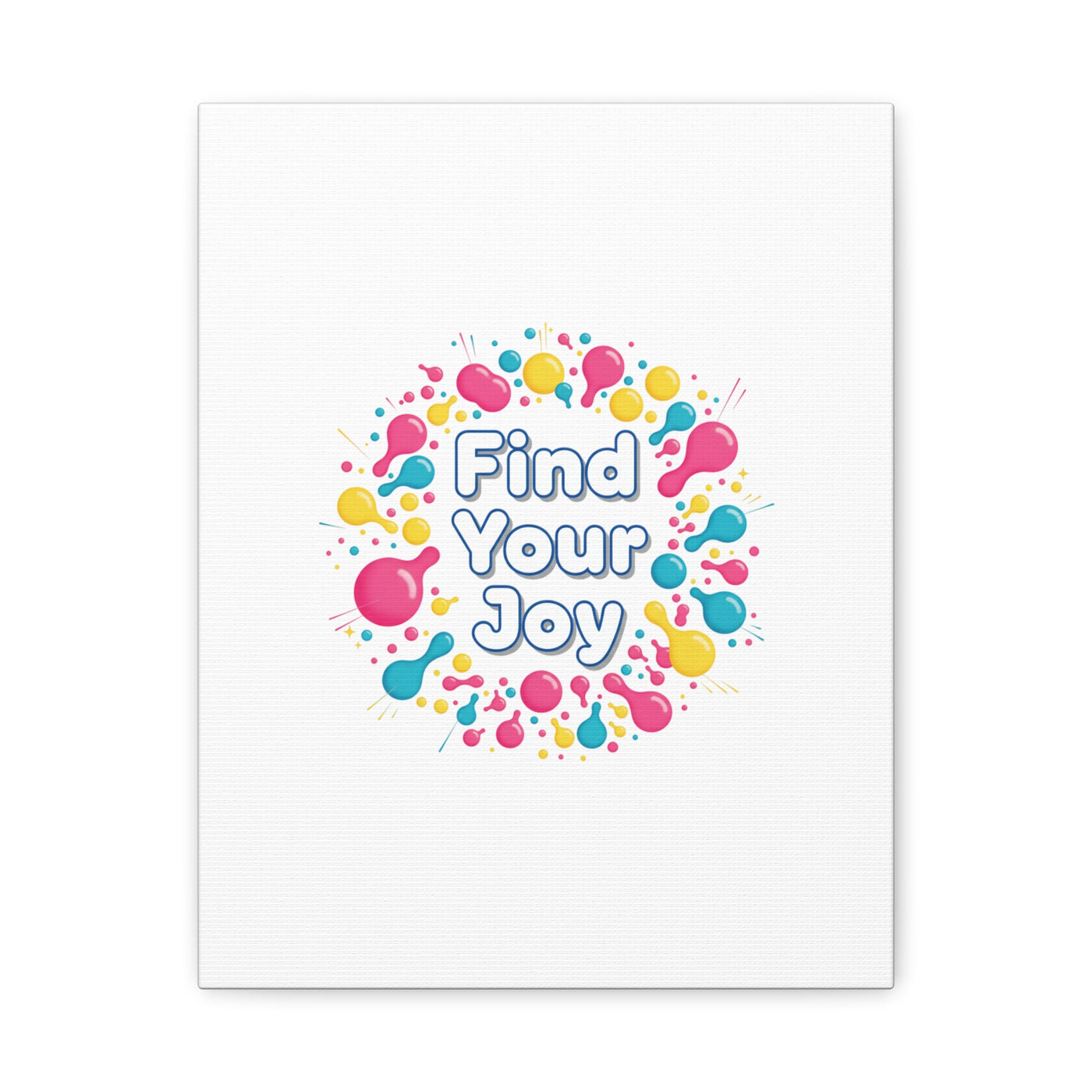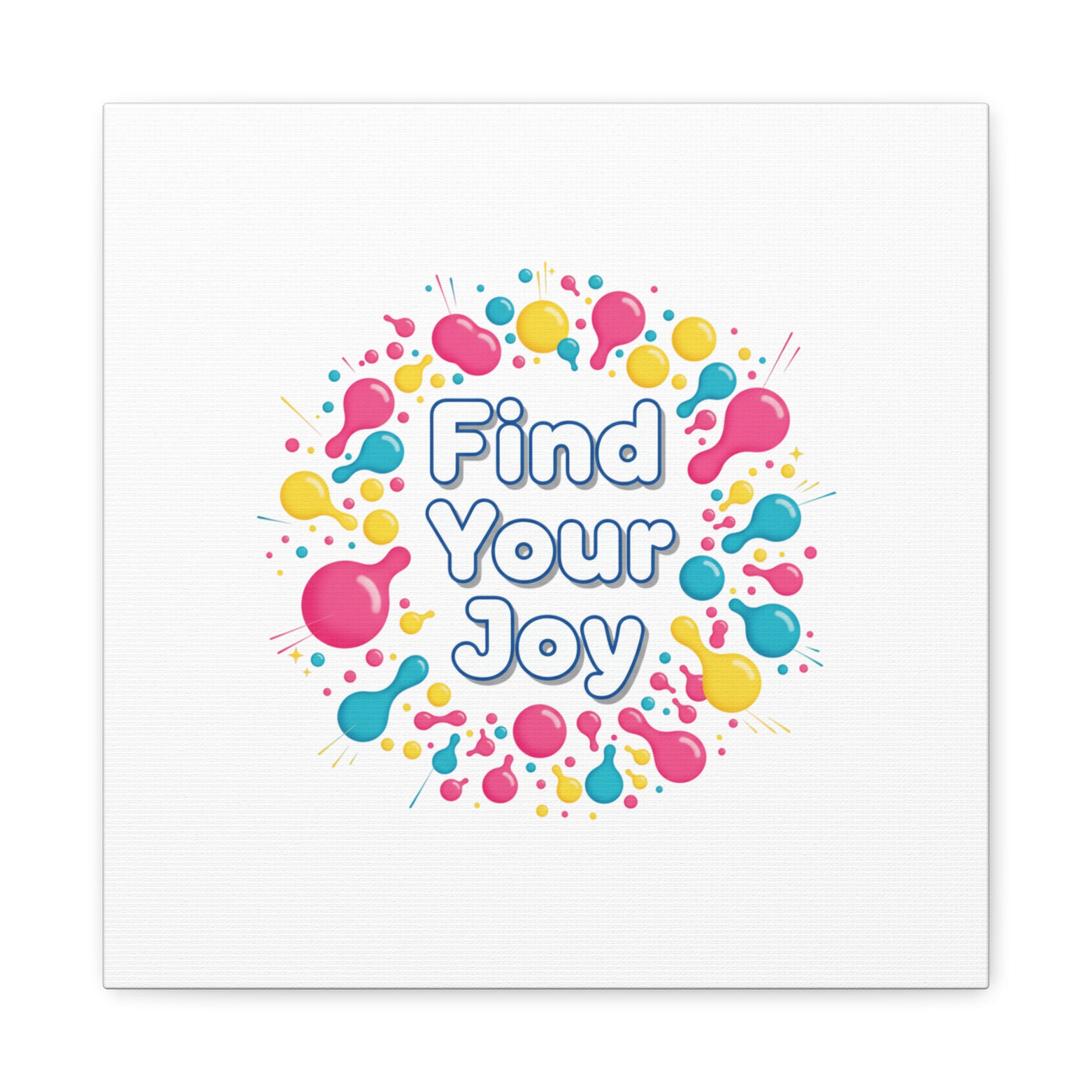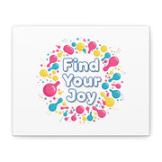 Find Your Joy matte stretched canvas featuring a neon-inspired squiggle wreath and playful rounded typography. Bright, high-saturation pinks, lemon yellow...