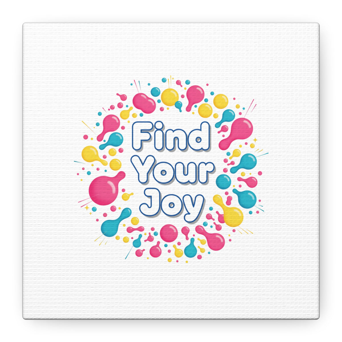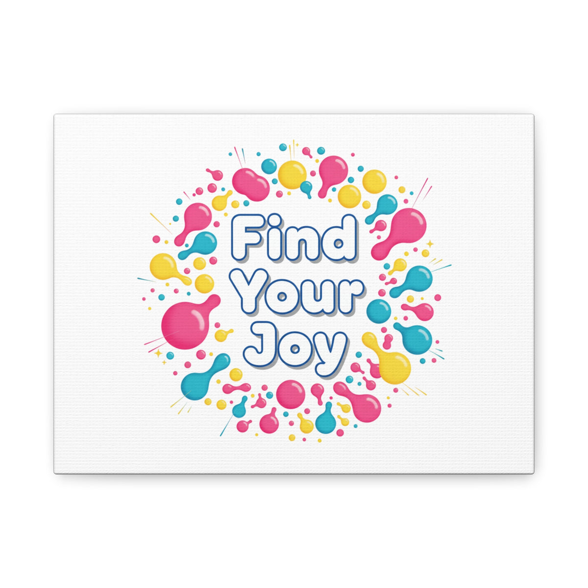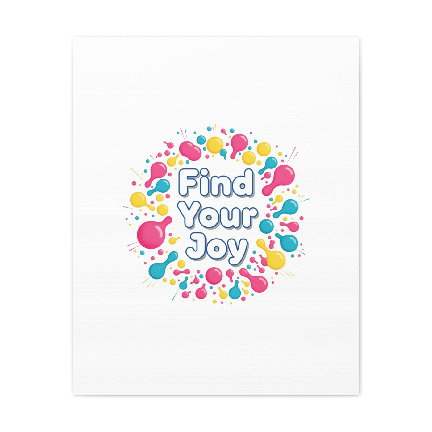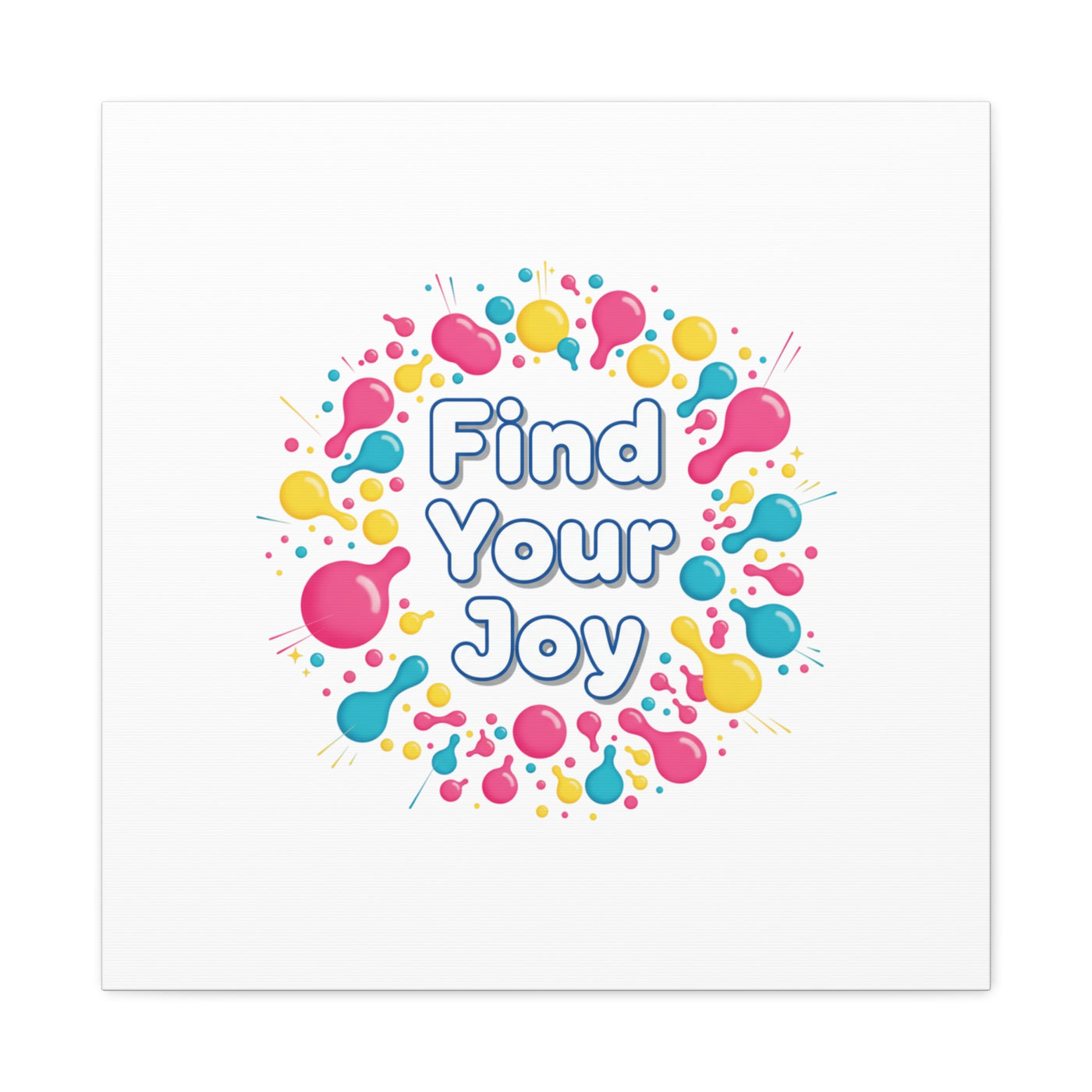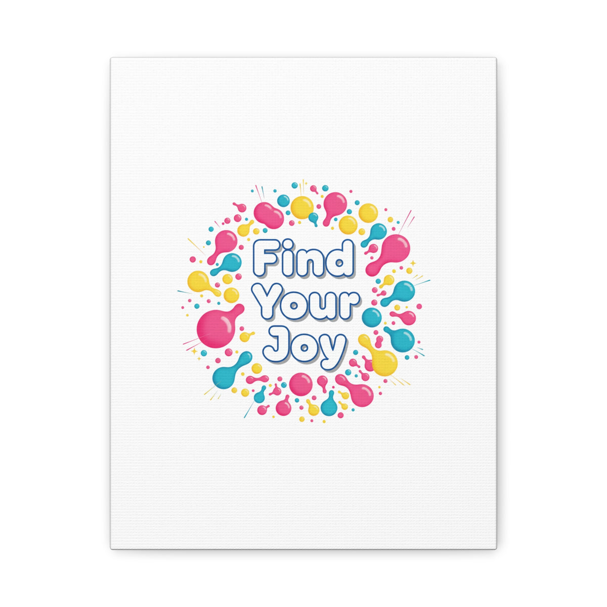 Find Your Joy matte stretched canvas featuring a neon-inspired squiggle wreath and playful rounded typography. Bright, high-saturation pinks, lemon yellow...