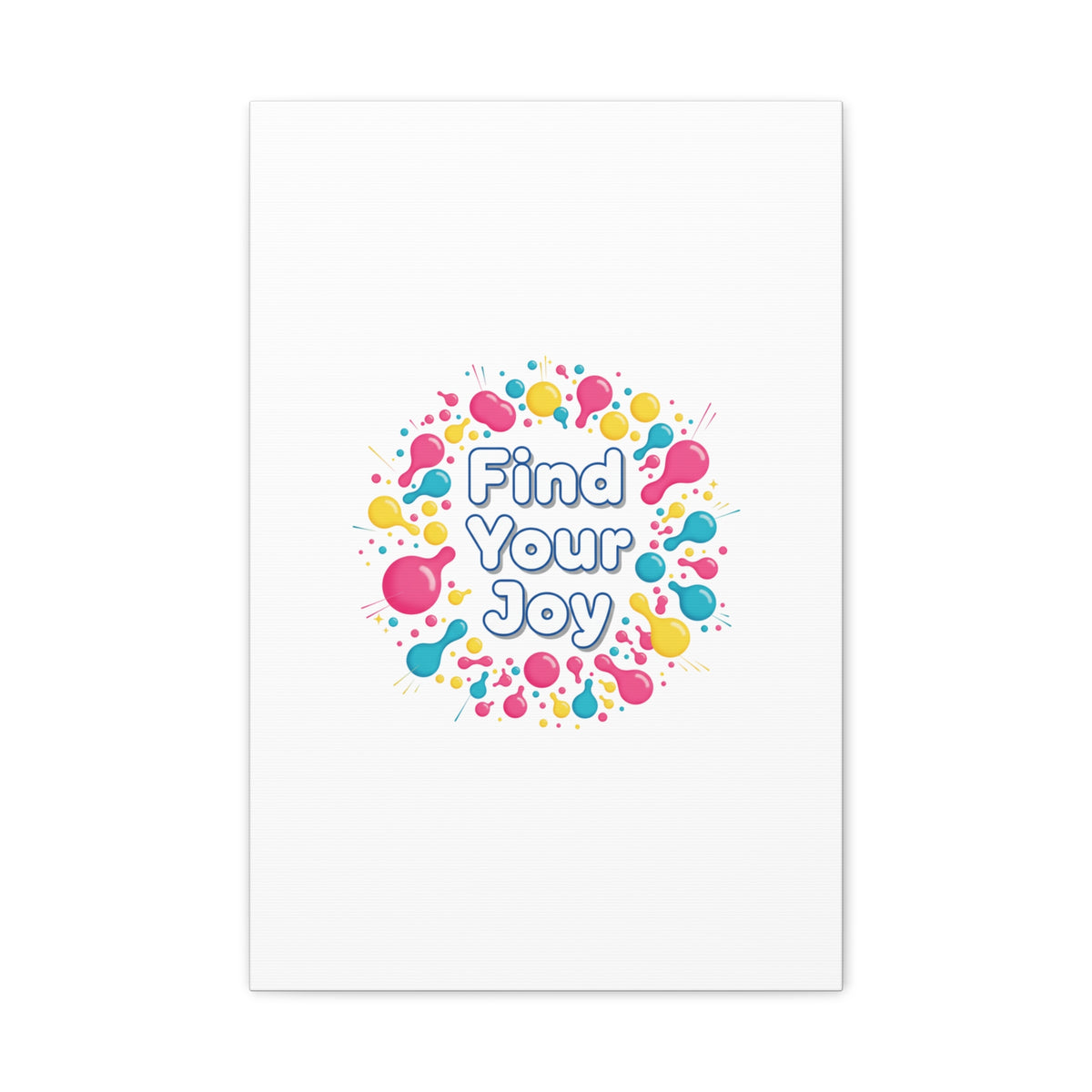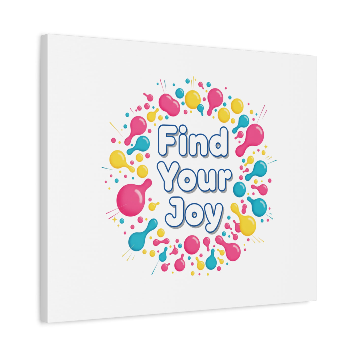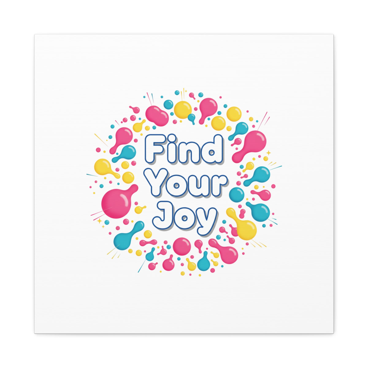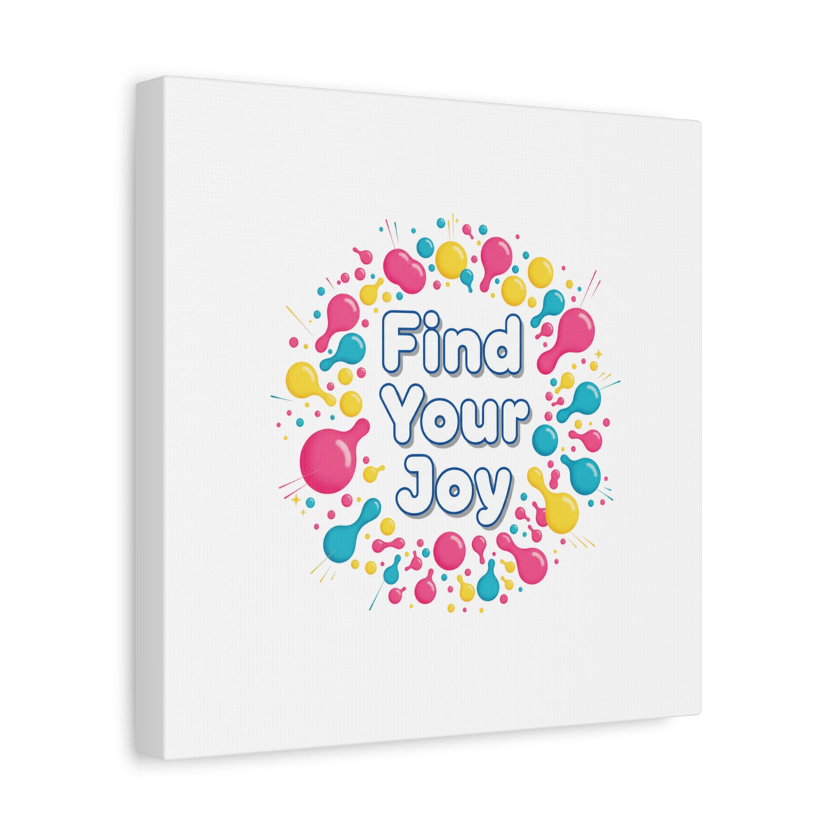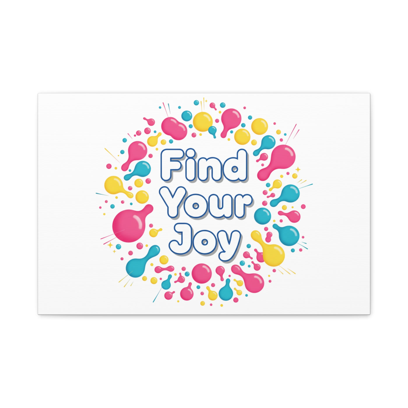 Find Your Joy matte stretched canvas featuring a neon-inspired squiggle wreath and playful rounded typography. Bright, high-saturation pinks, lemon yellow...