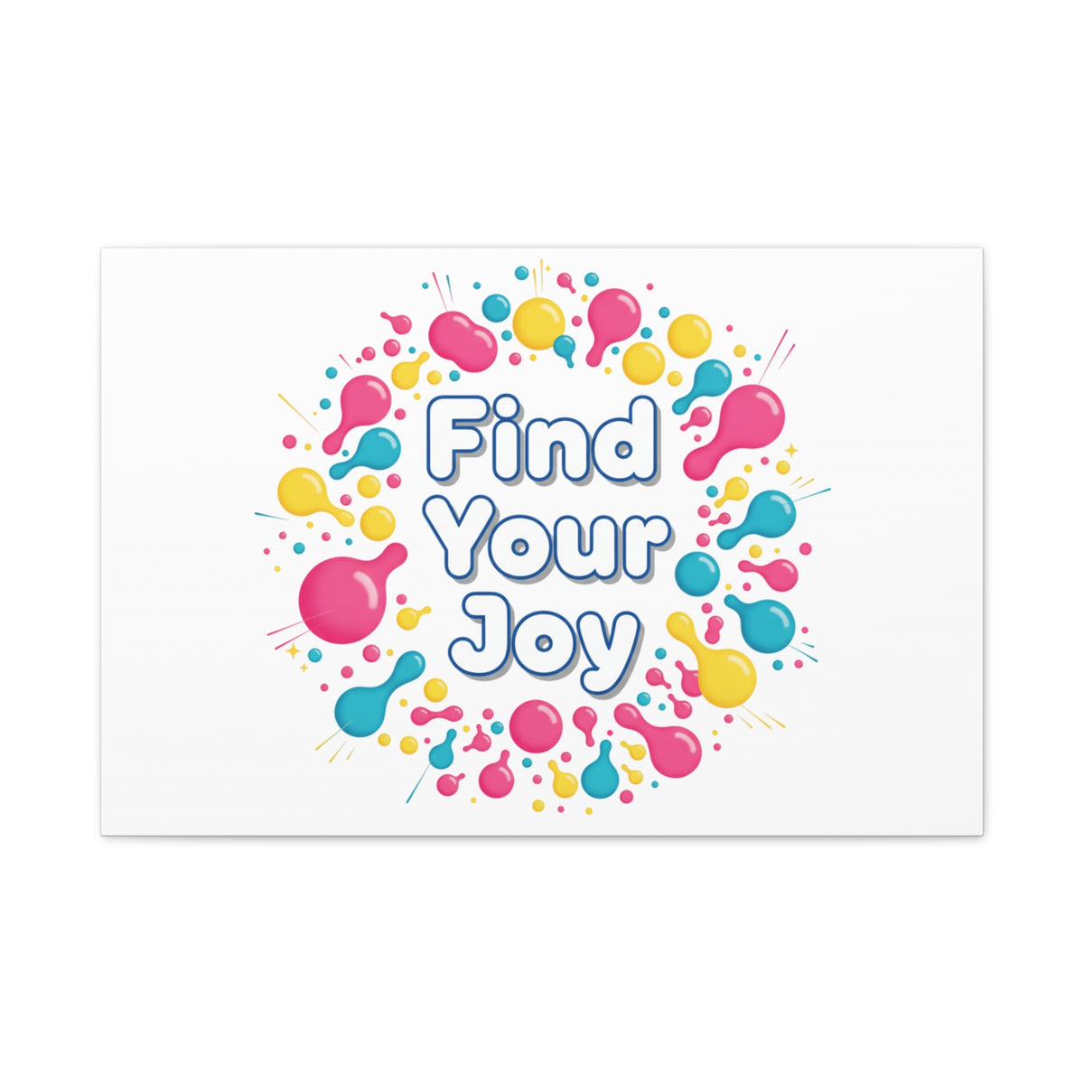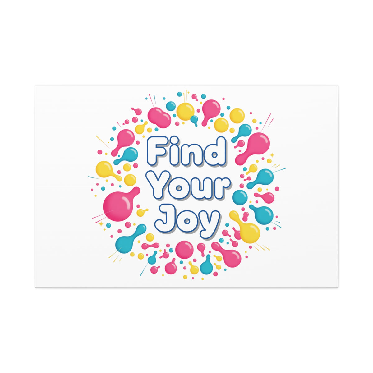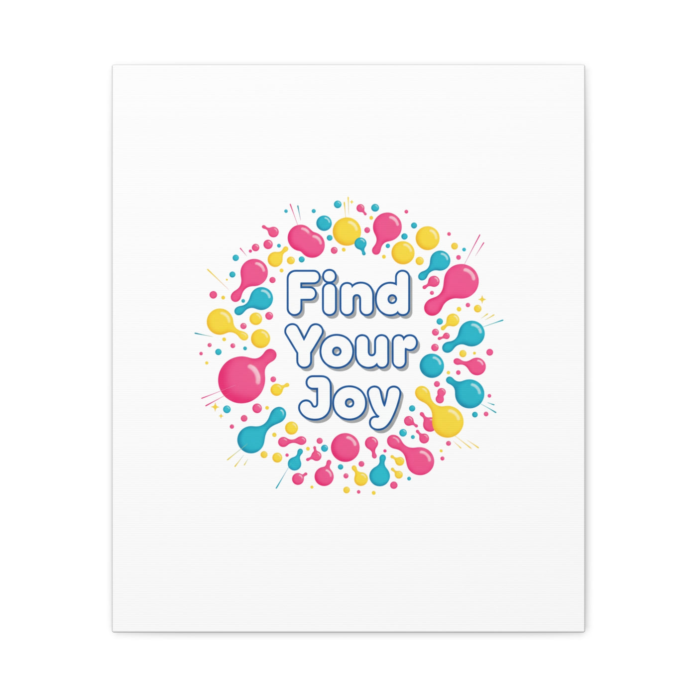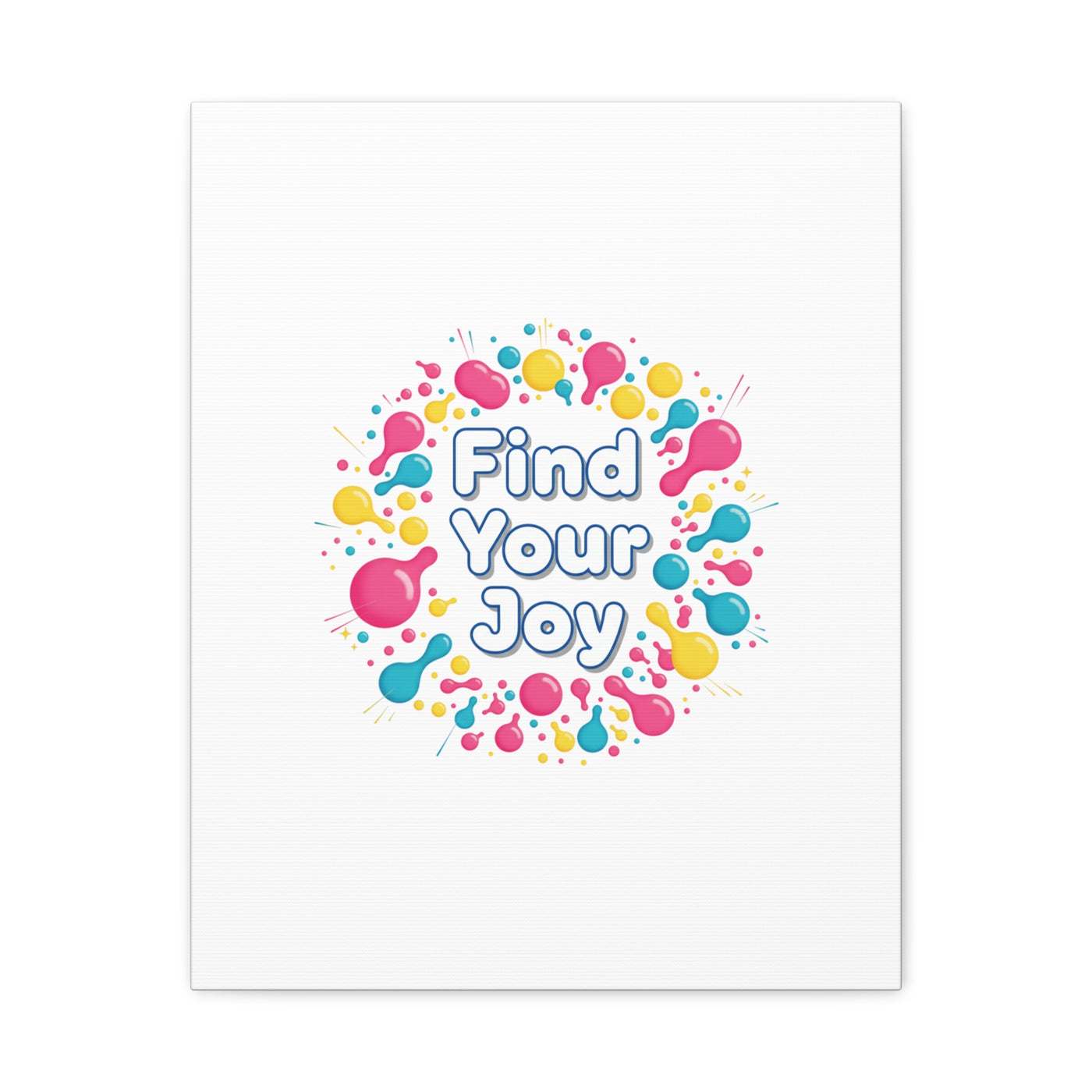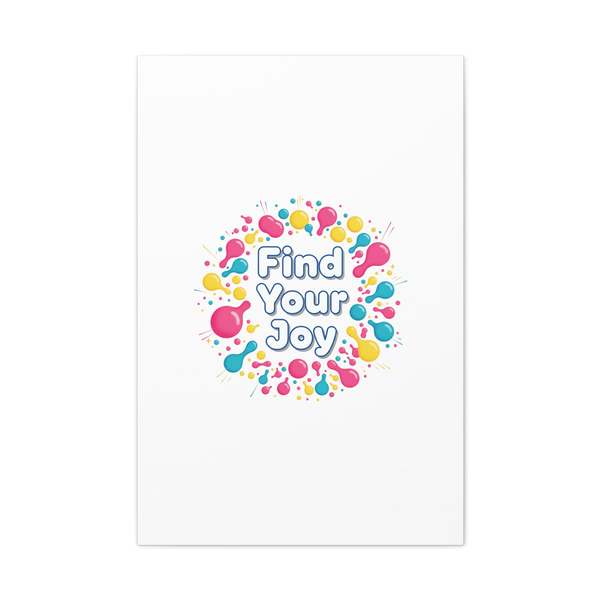 Find Your Joy matte stretched canvas featuring a neon-inspired squiggle wreath and playful rounded typography. Bright, high-saturation pinks, lemon yellow...