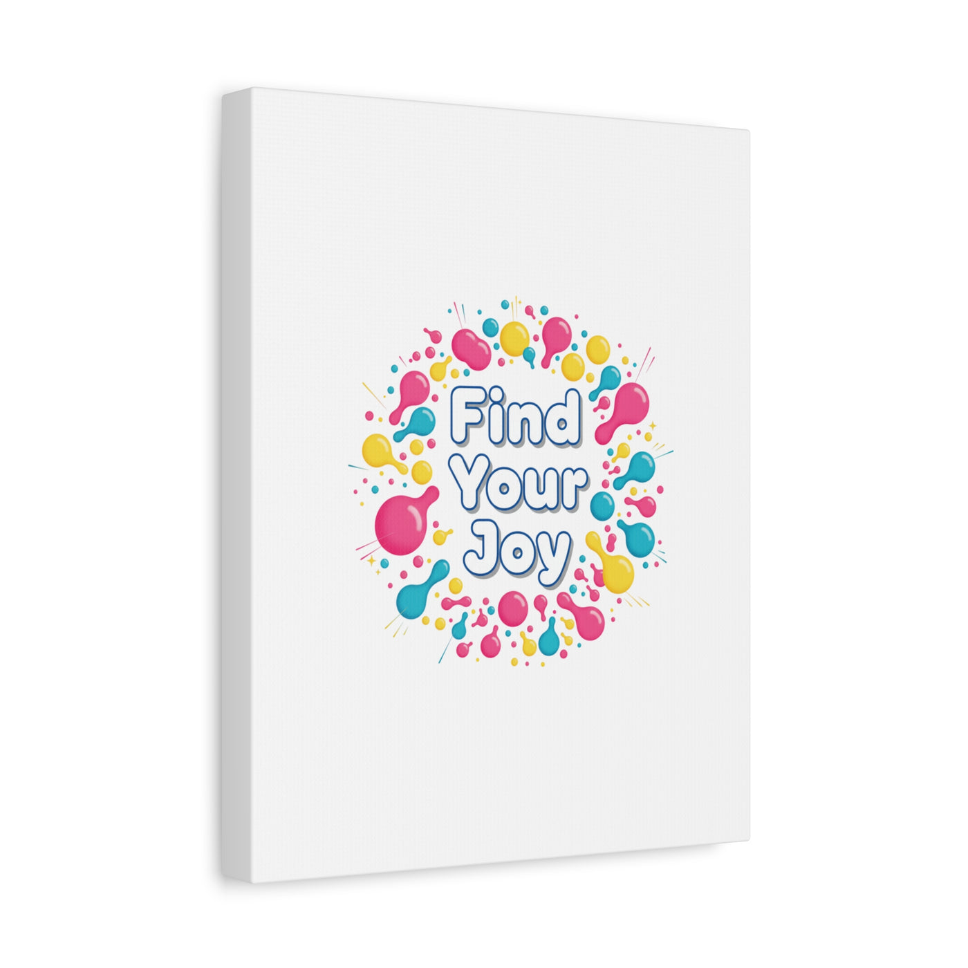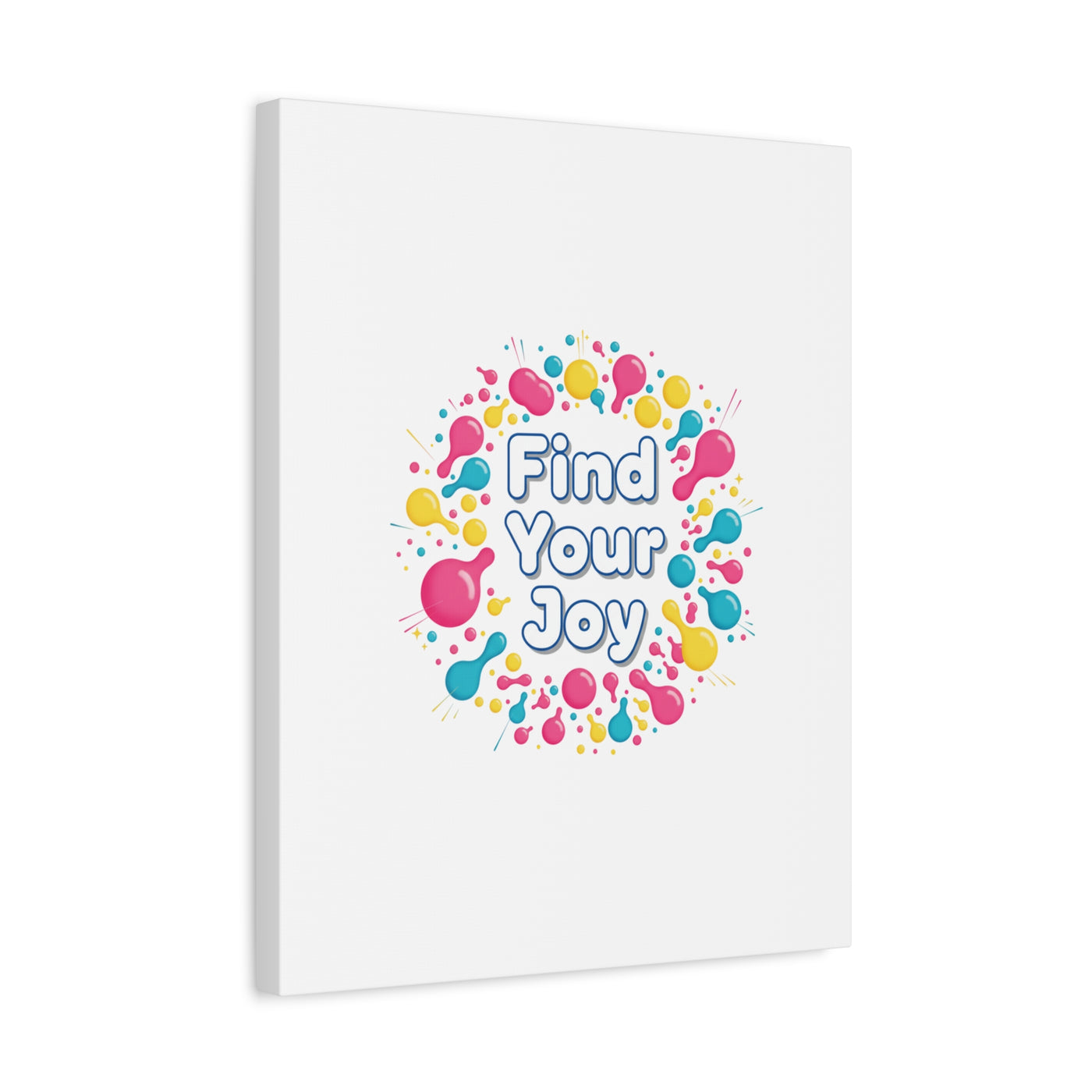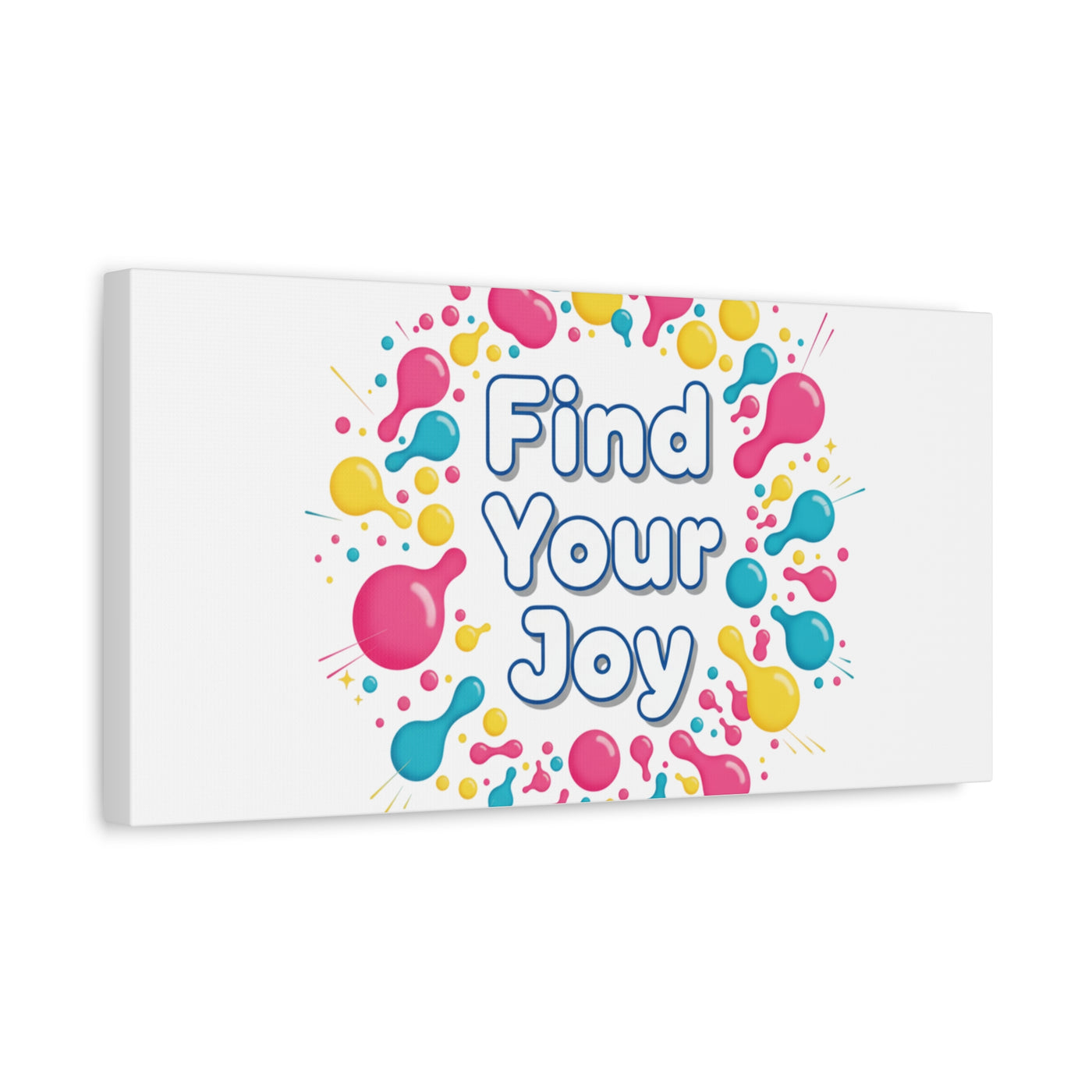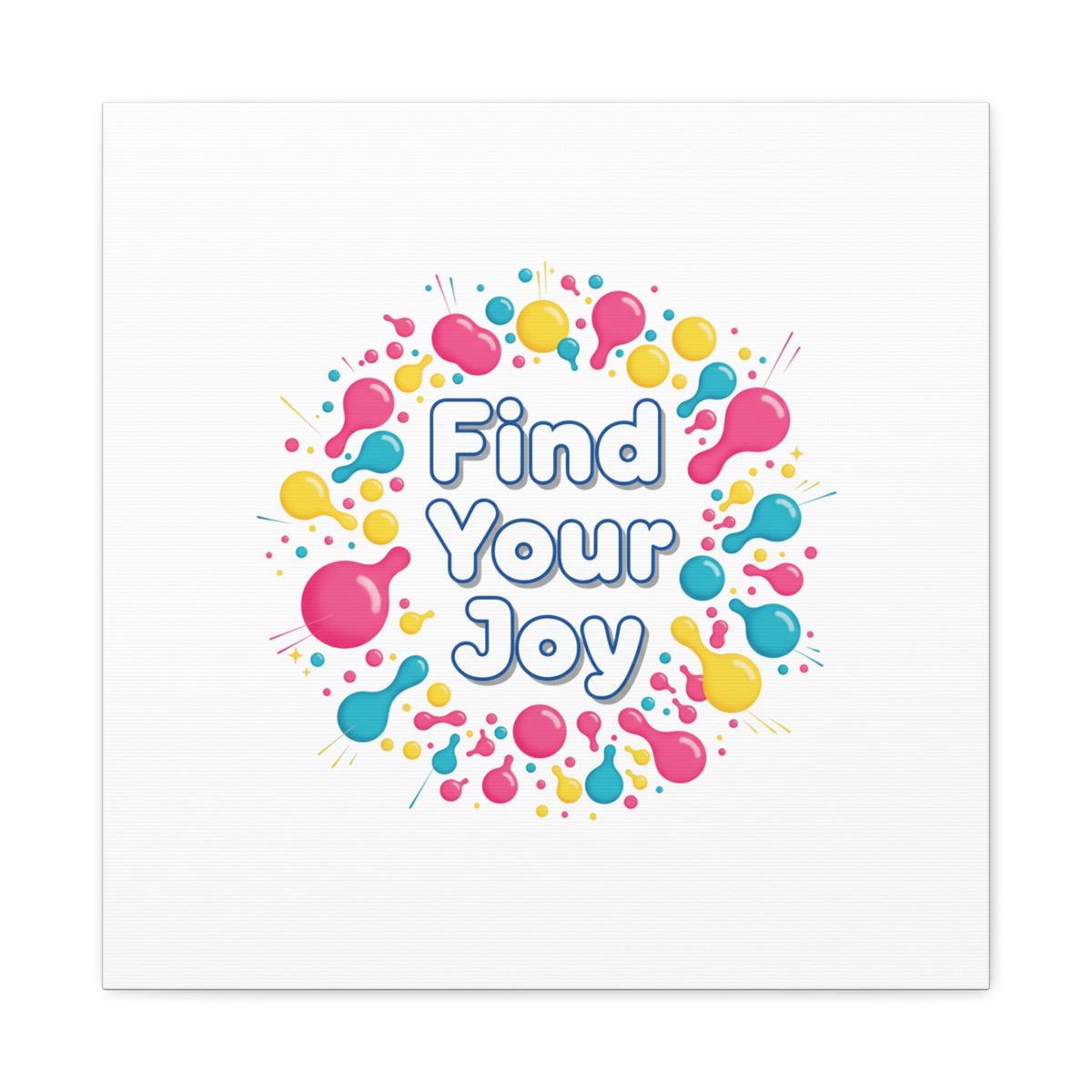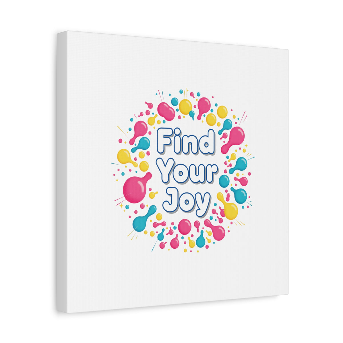 Find Your Joy matte stretched canvas featuring a neon-inspired squiggle wreath and playful rounded typography. Bright, high-saturation pinks, lemon yellow...