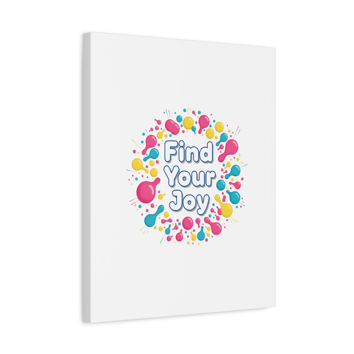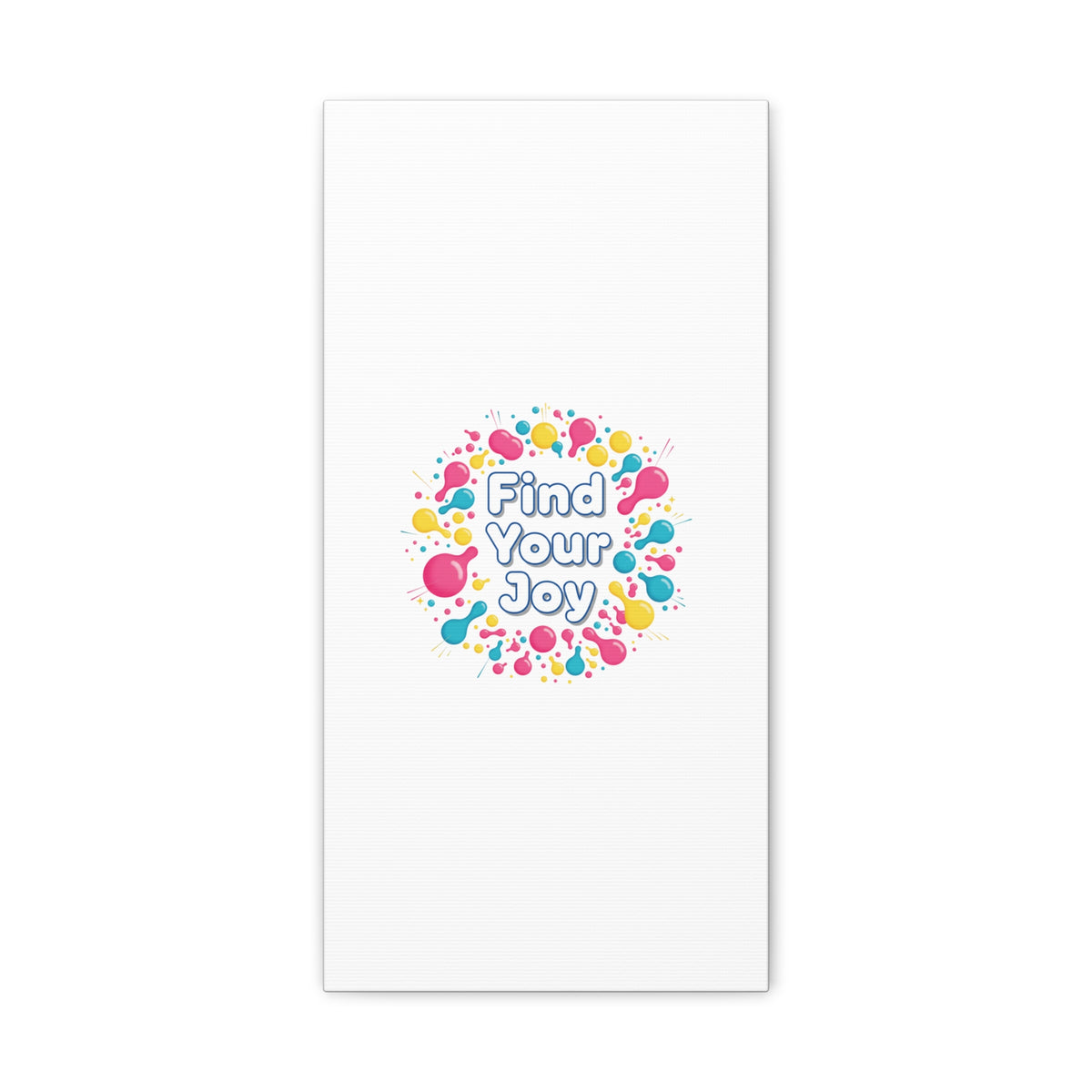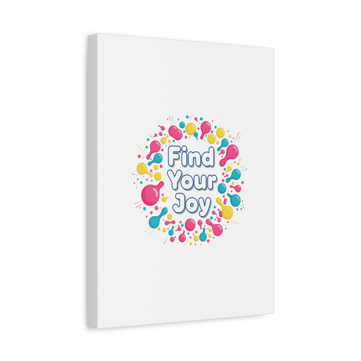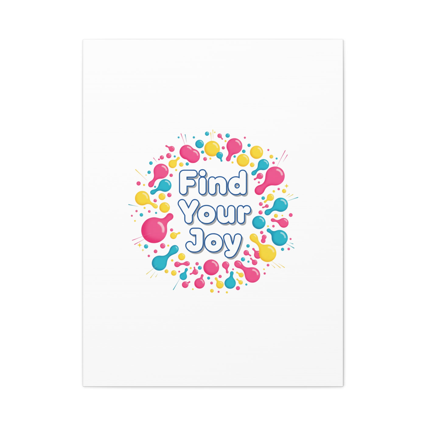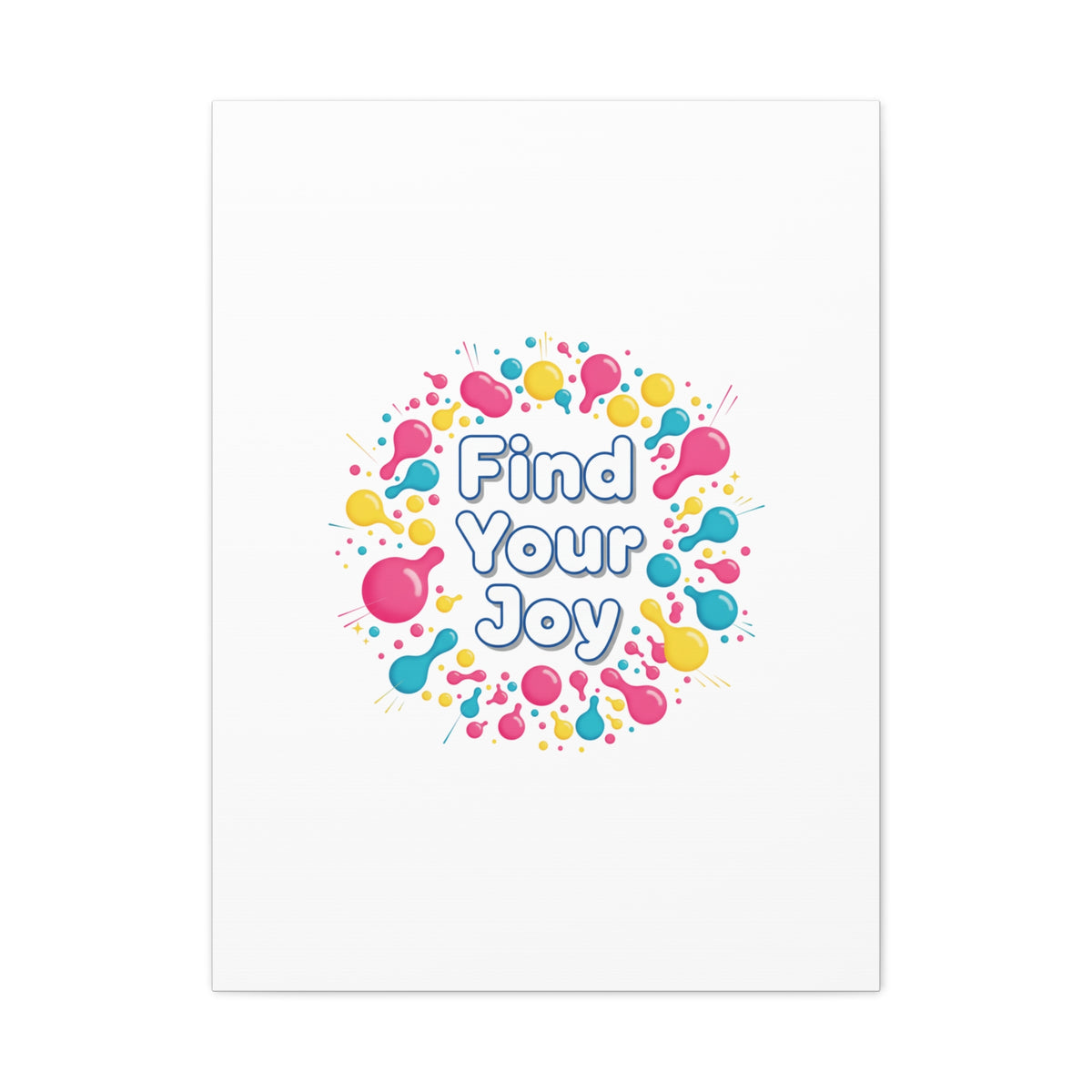 Find Your Joy matte stretched canvas featuring a neon-inspired squiggle wreath and playful rounded typography. Bright, high-saturation pinks, lemon yellow...