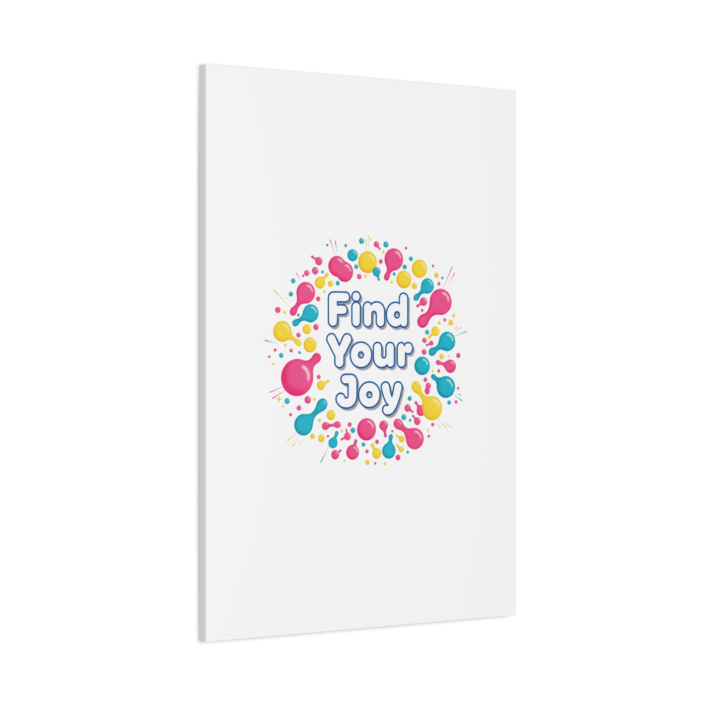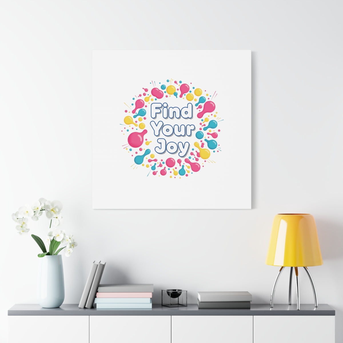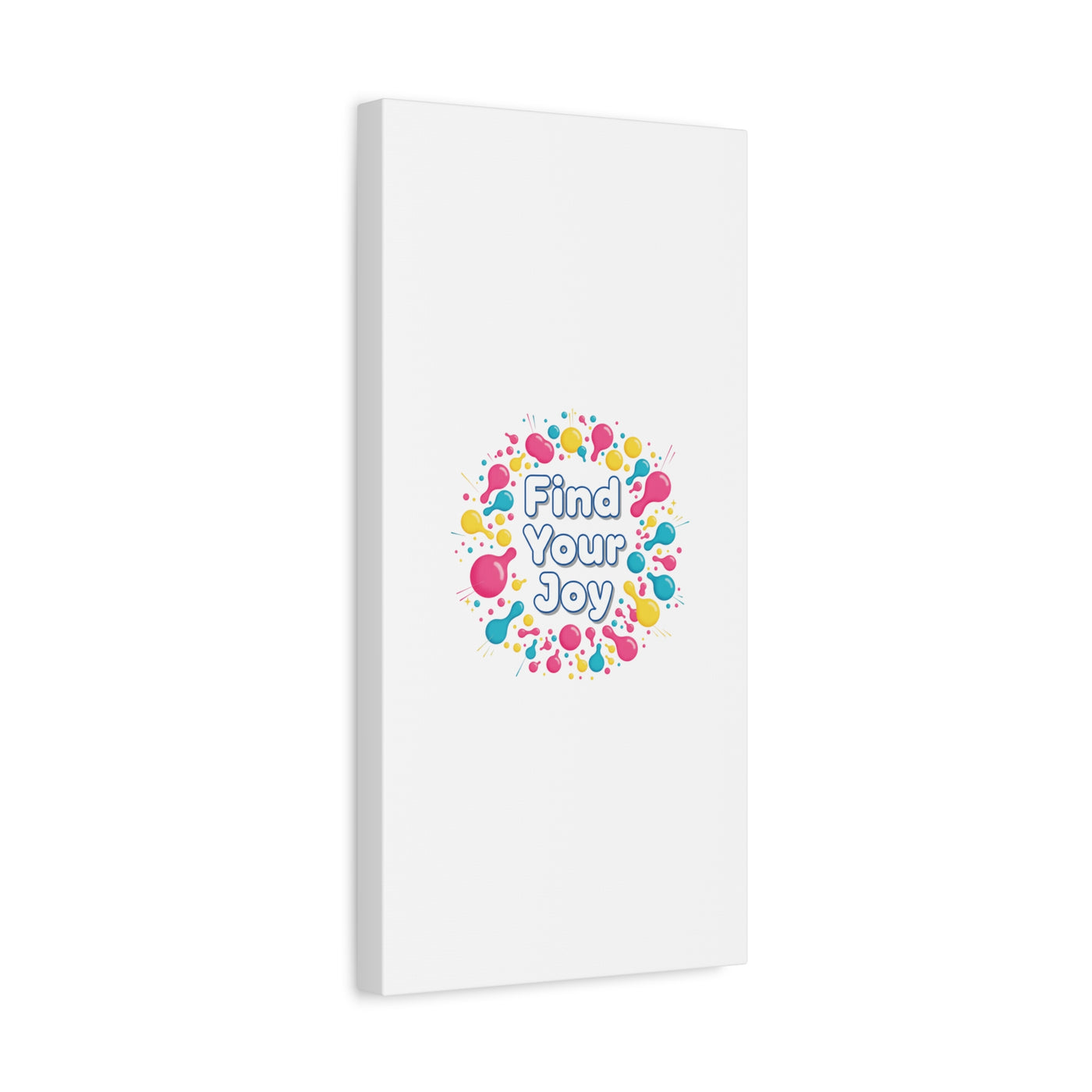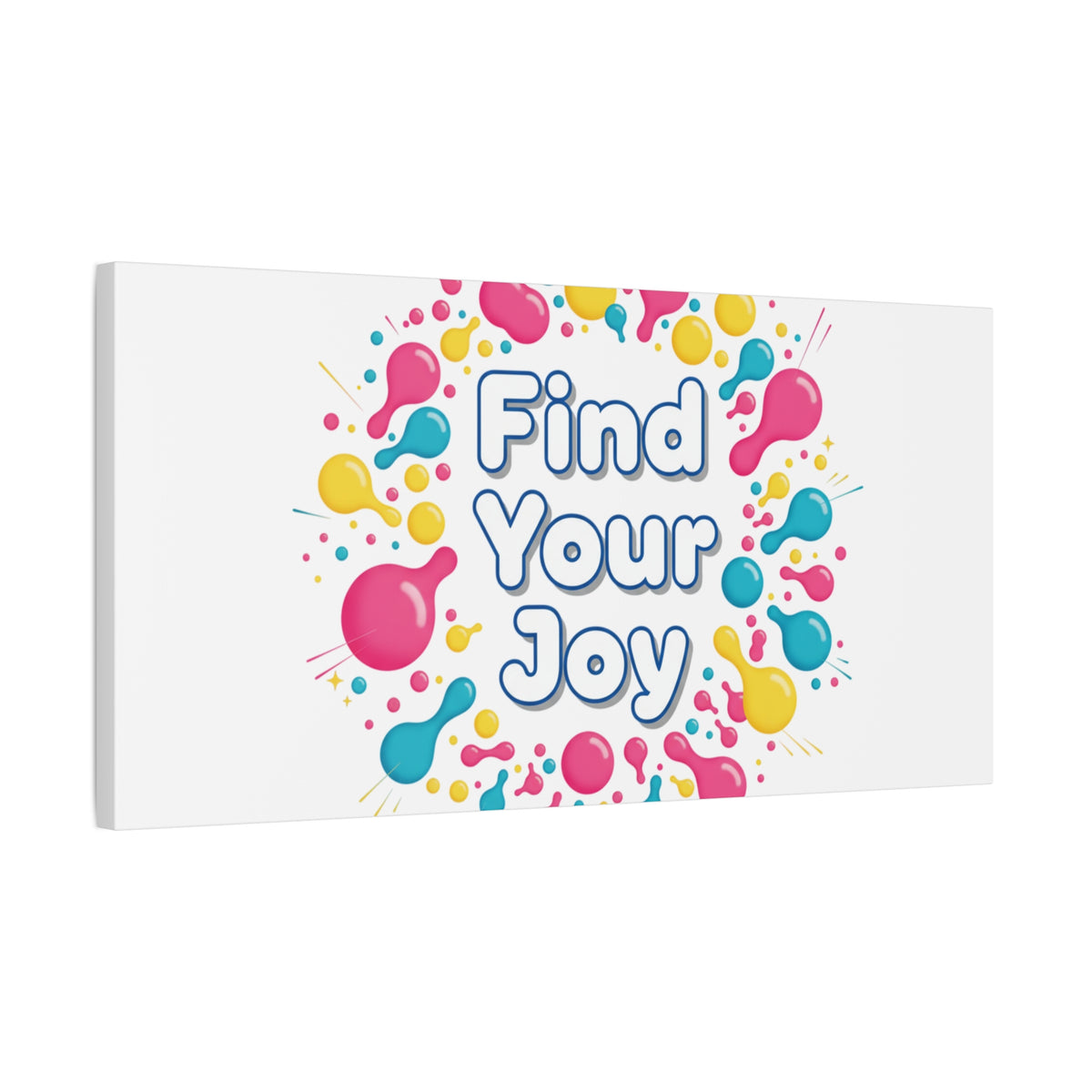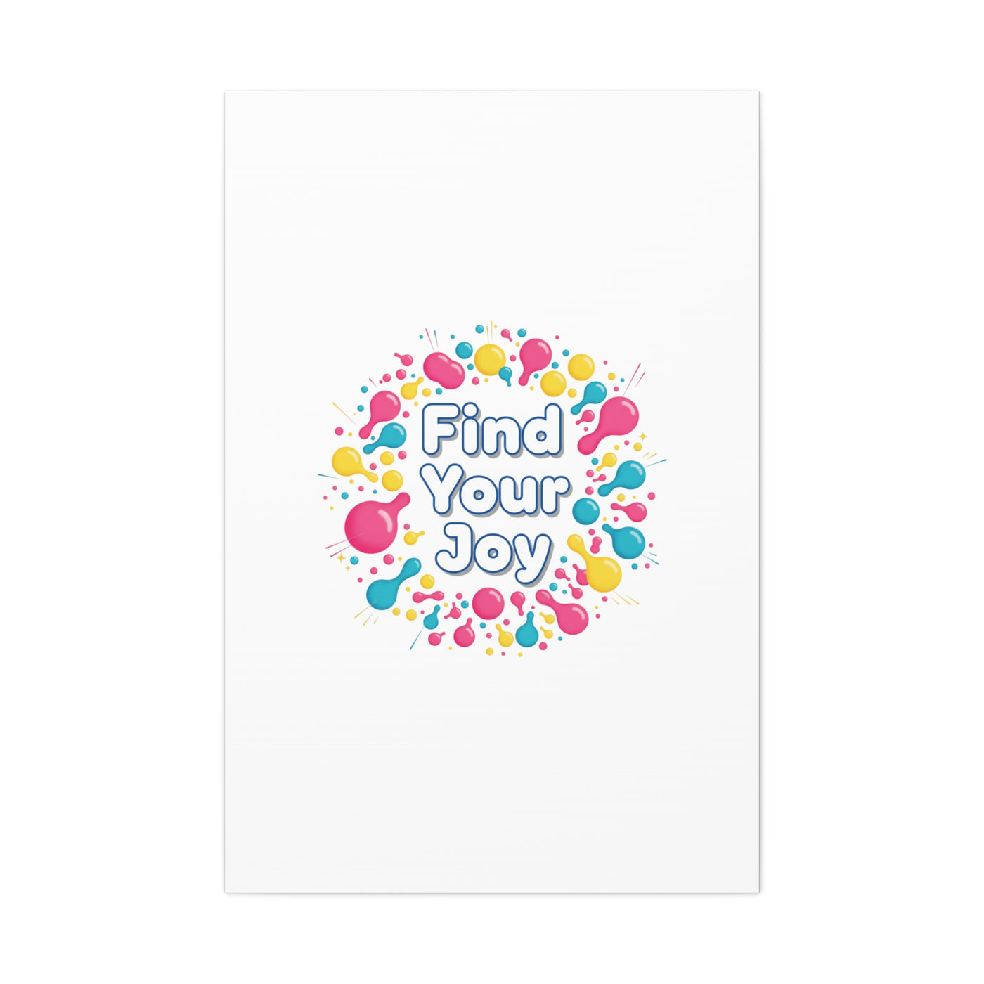 Find Your Joy matte stretched canvas featuring a neon-inspired squiggle wreath and playful rounded typography. Bright, high-saturation pinks, lemon yellow...