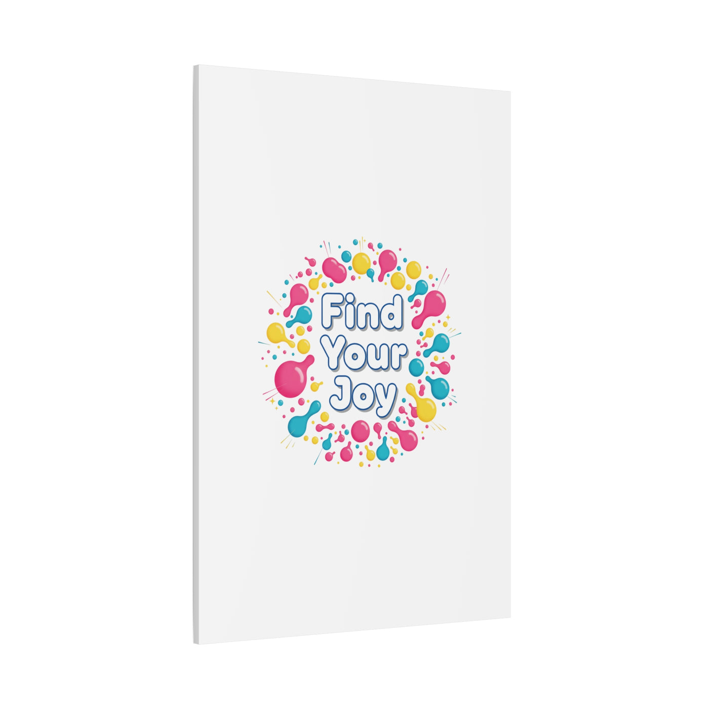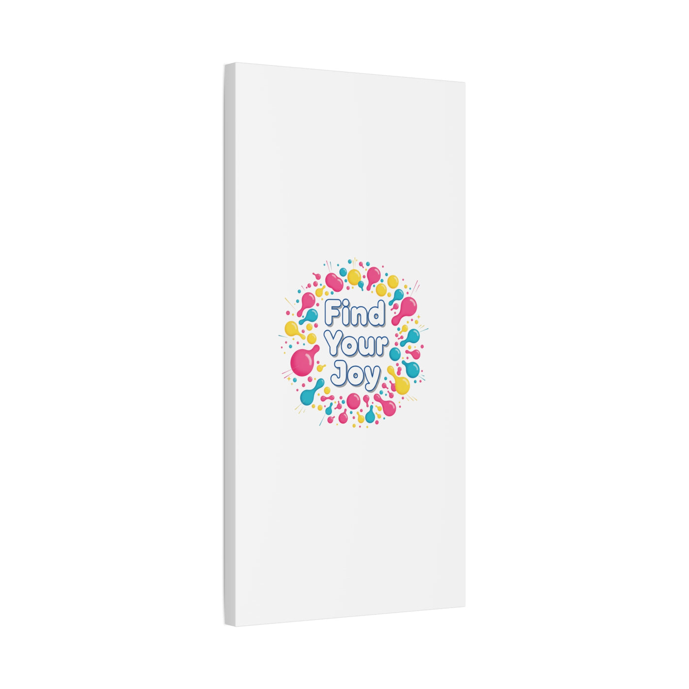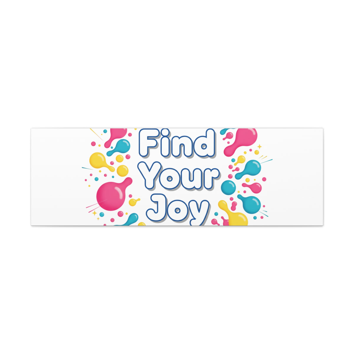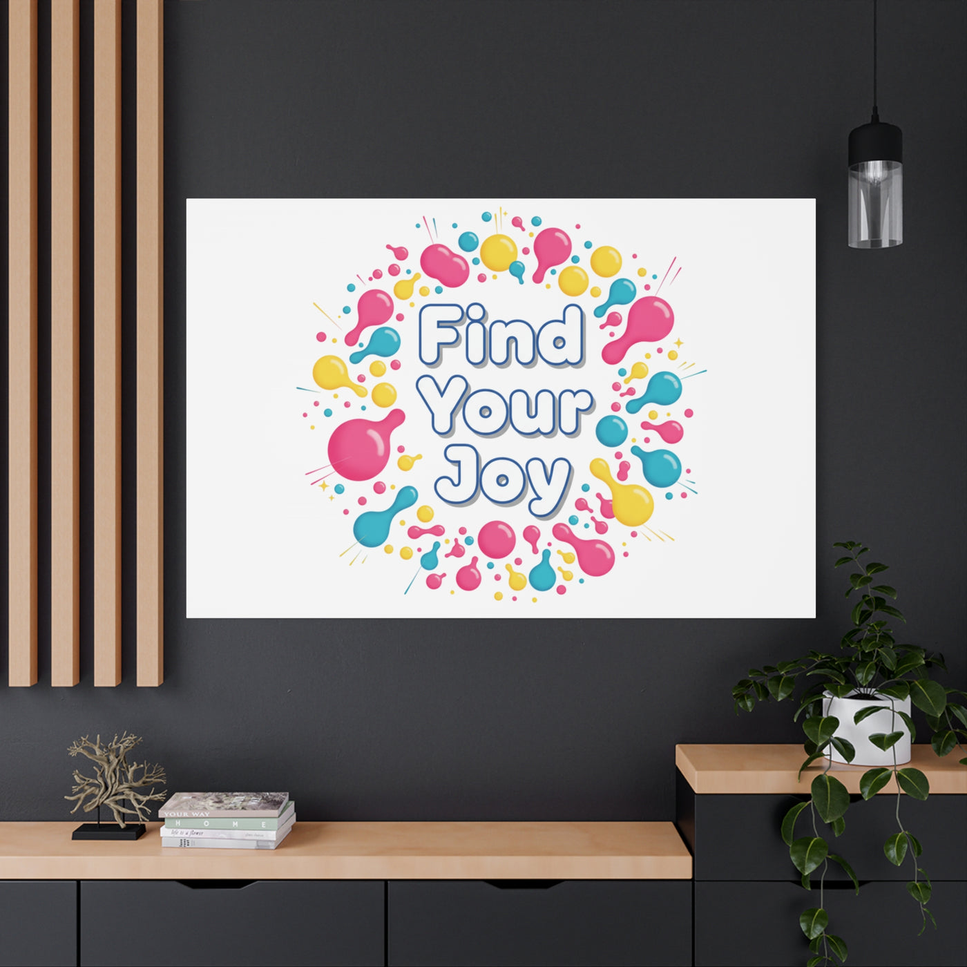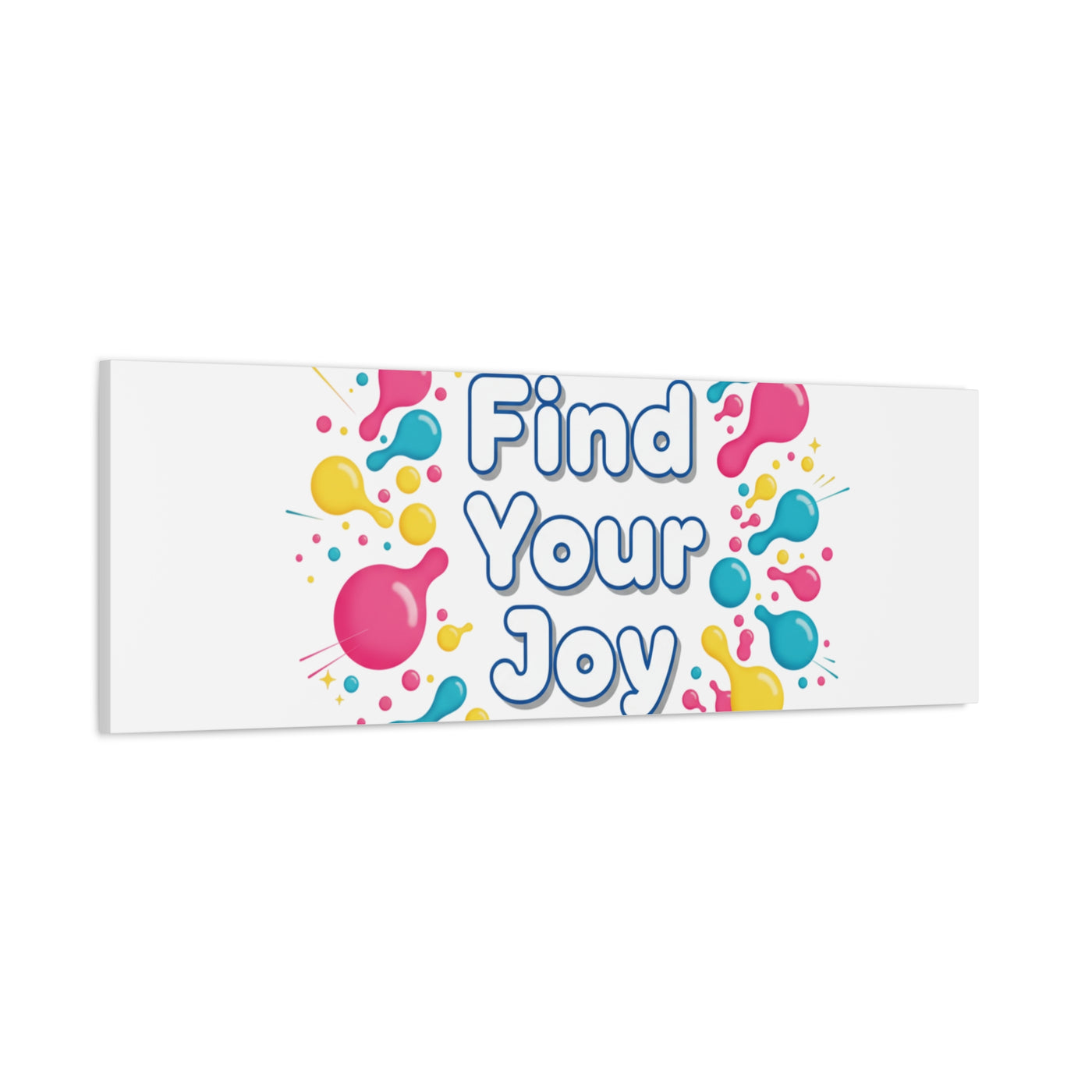 Find Your Joy matte stretched canvas featuring a neon-inspired squiggle wreath and playful rounded typography. Bright, high-saturation pinks, lemon yellow...