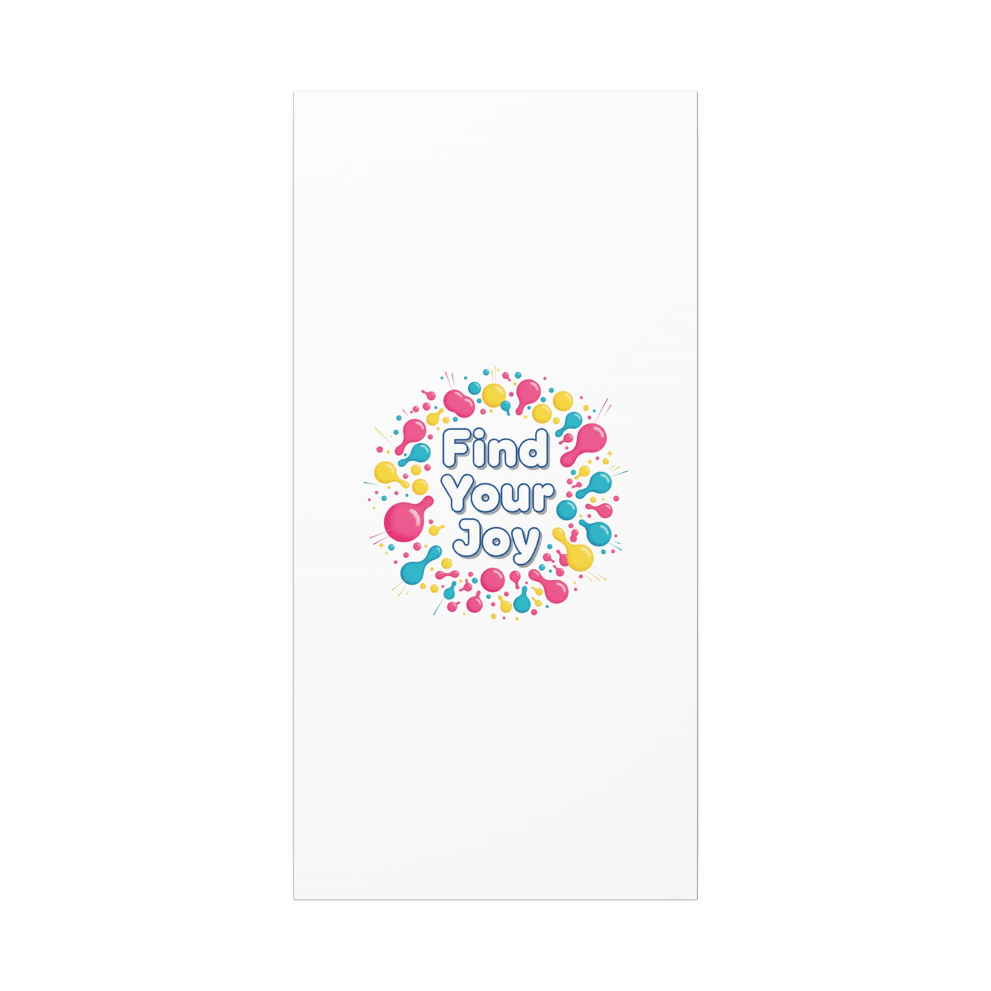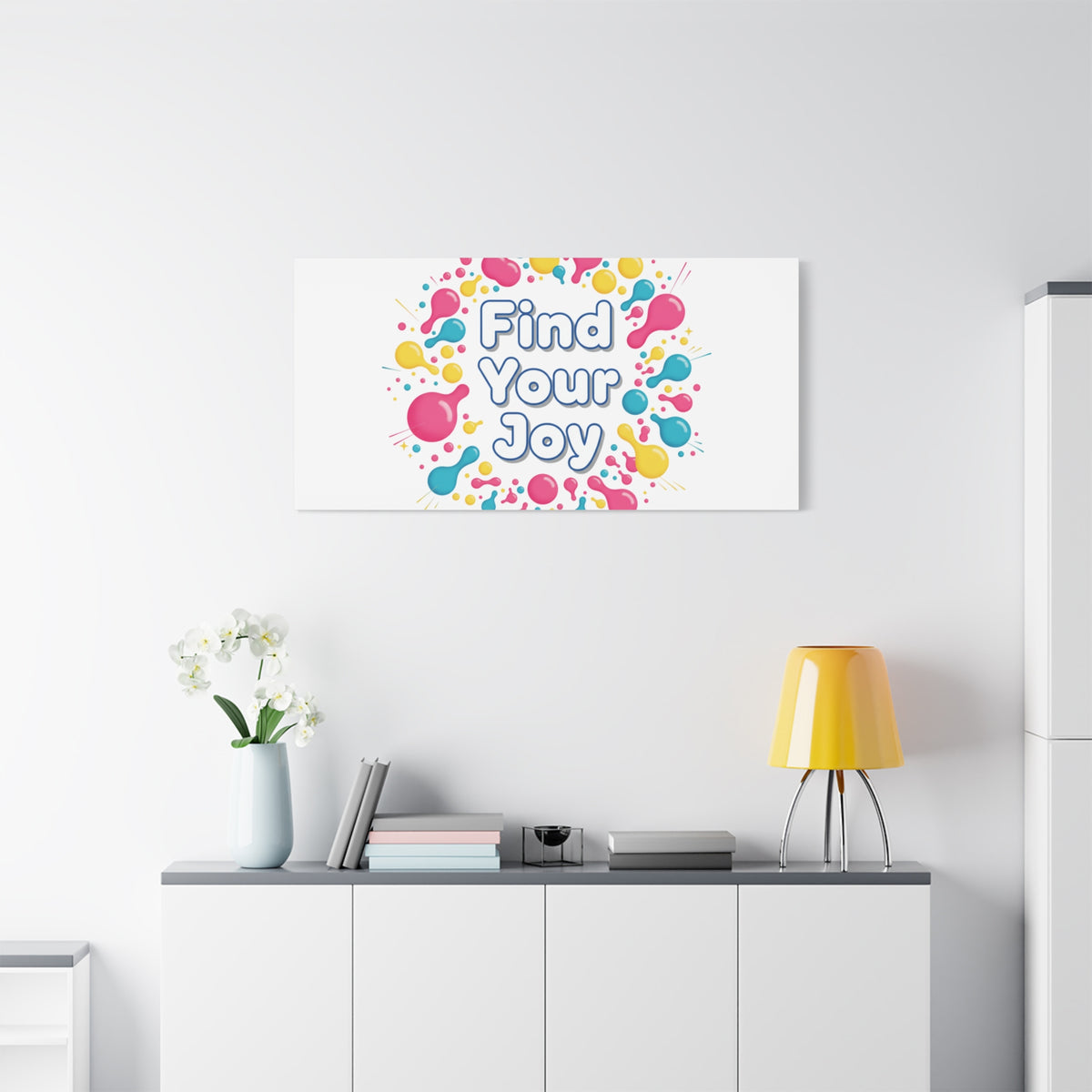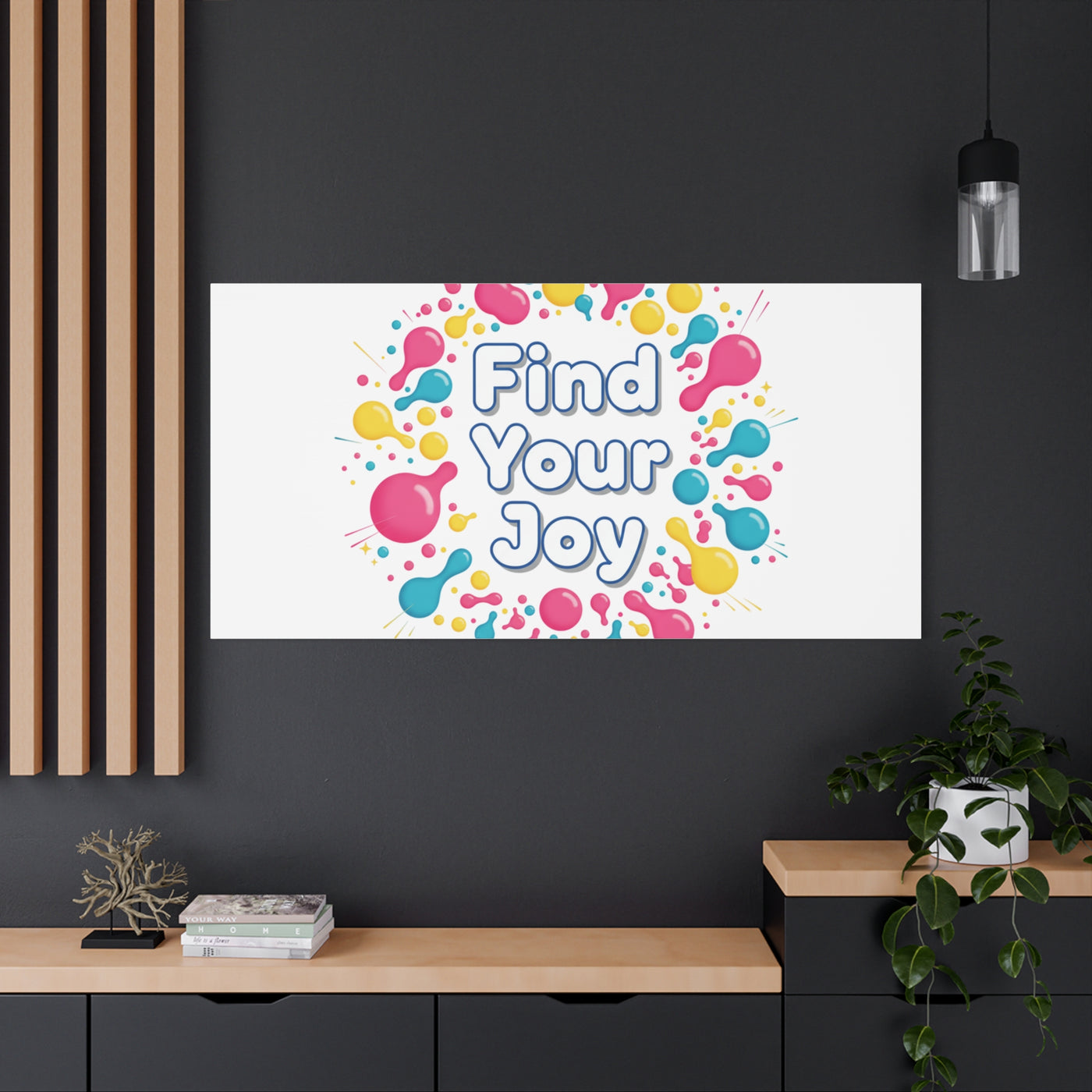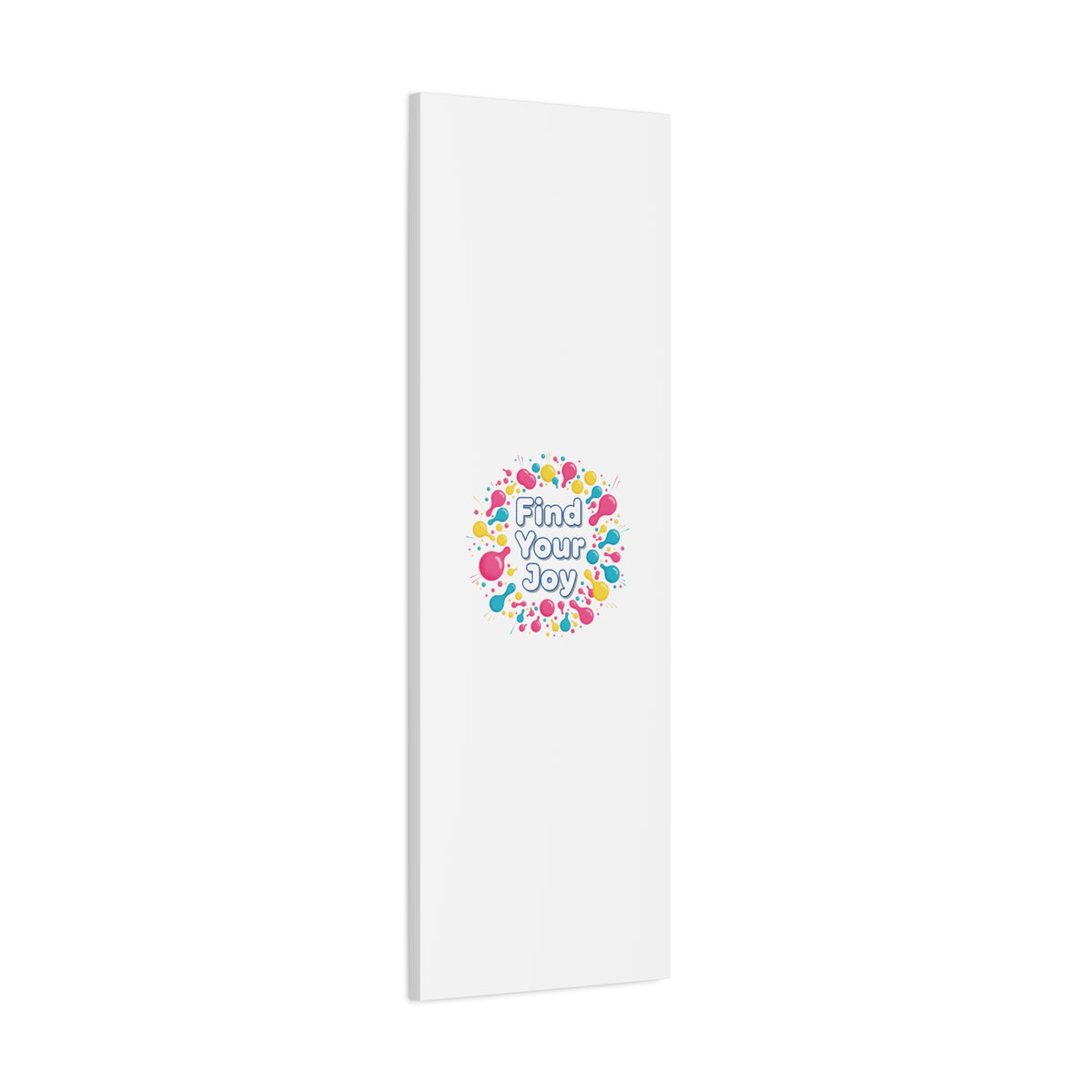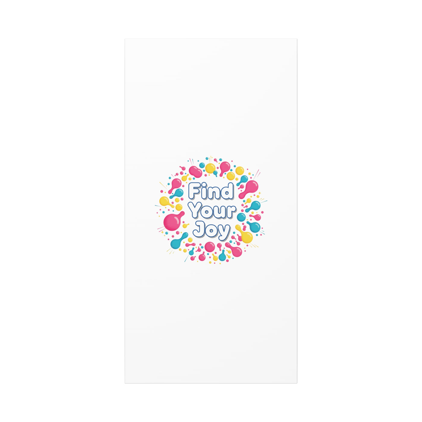 Find Your Joy matte stretched canvas featuring a neon-inspired squiggle wreath and playful rounded typography. Bright, high-saturation pinks, lemon yellow...