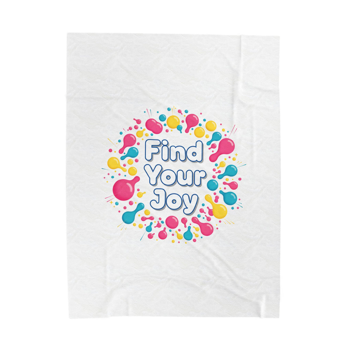 Find Your Joy — a neon-splashed, dopamine-decor plush blanket that turns color therapy into a cozy moment. The design centers on playful rounded typography reading “Find Your Joy” surrounded by glossy, squishy droplet shapes in hot pink, lemon yellow and teal, forming a cheerful burst. The bright gradient-like palette and bulbous motifs echo Y2K-inspired, sensory-comfort aesthetics so it reads as a mood-boosting accent on a bed or sofa and looks lively in social-feed styling.
