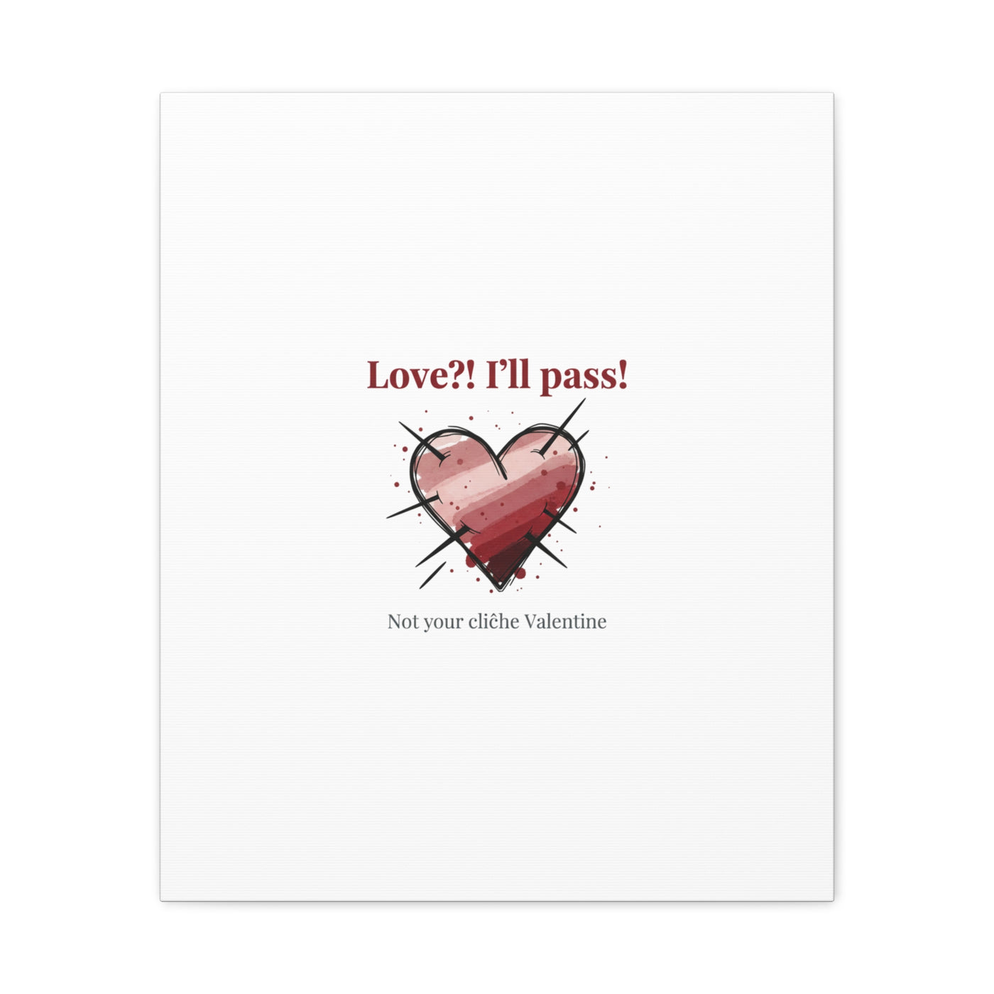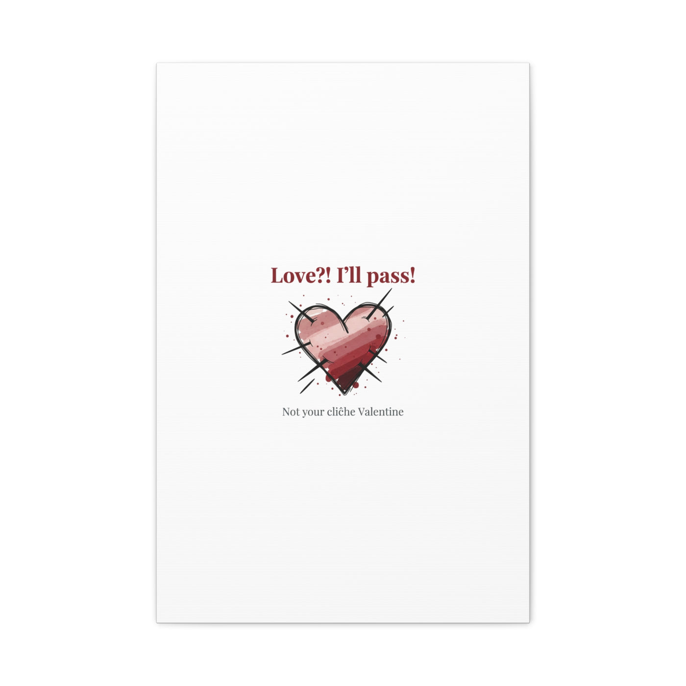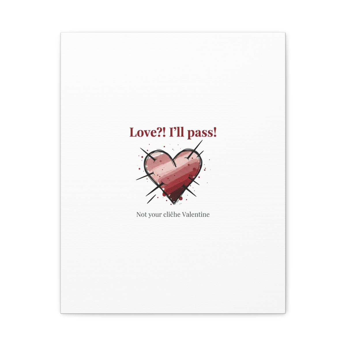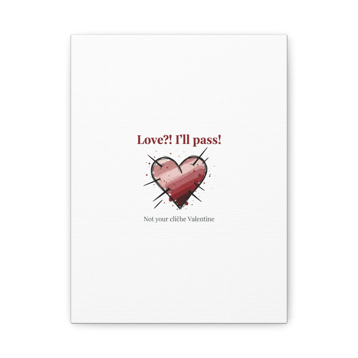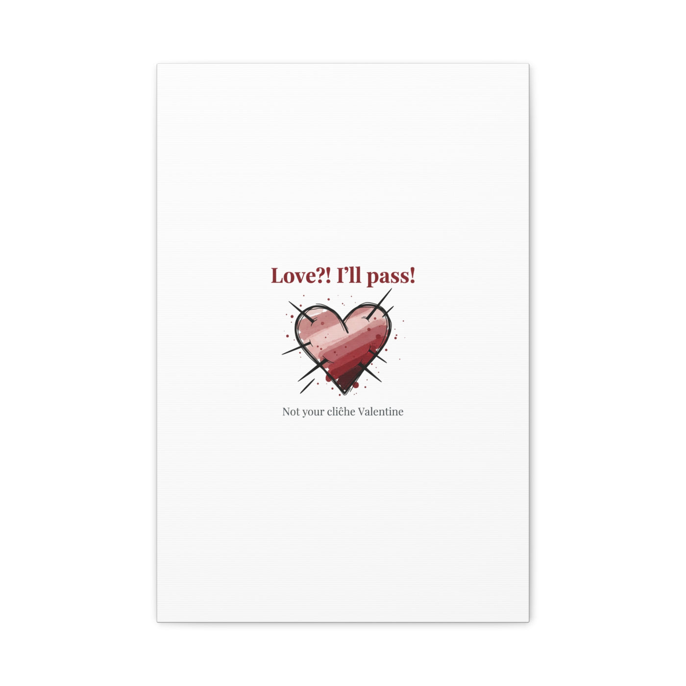 Matte stretched canvas print featuring a tongue‑in‑cheek heart illustration and snarky line that leans into the Hearts‑with‑a‑Twist anti‑Valentine trend. The artwork pairs softened pink/red heart tones with bold black sketch marks and a crisp serif headline to create a contrast of sweet and guarded. Designed as a wall conversation piece, it fits into spaces where ironic, boundary‑setting decor and bookish or punk Valentine aesthetics mix.