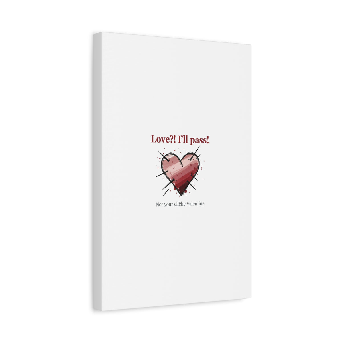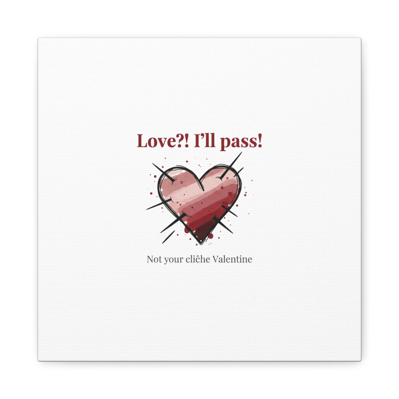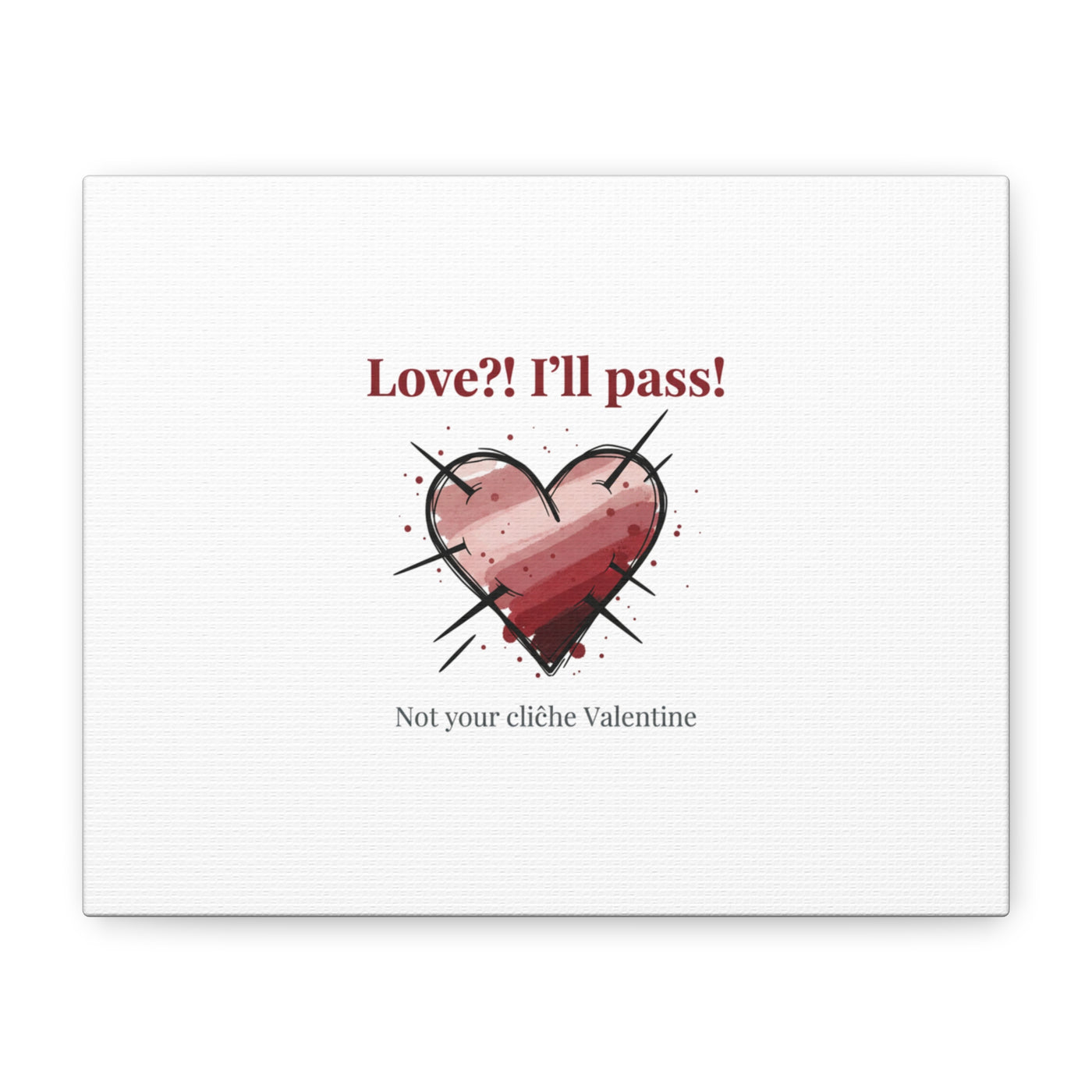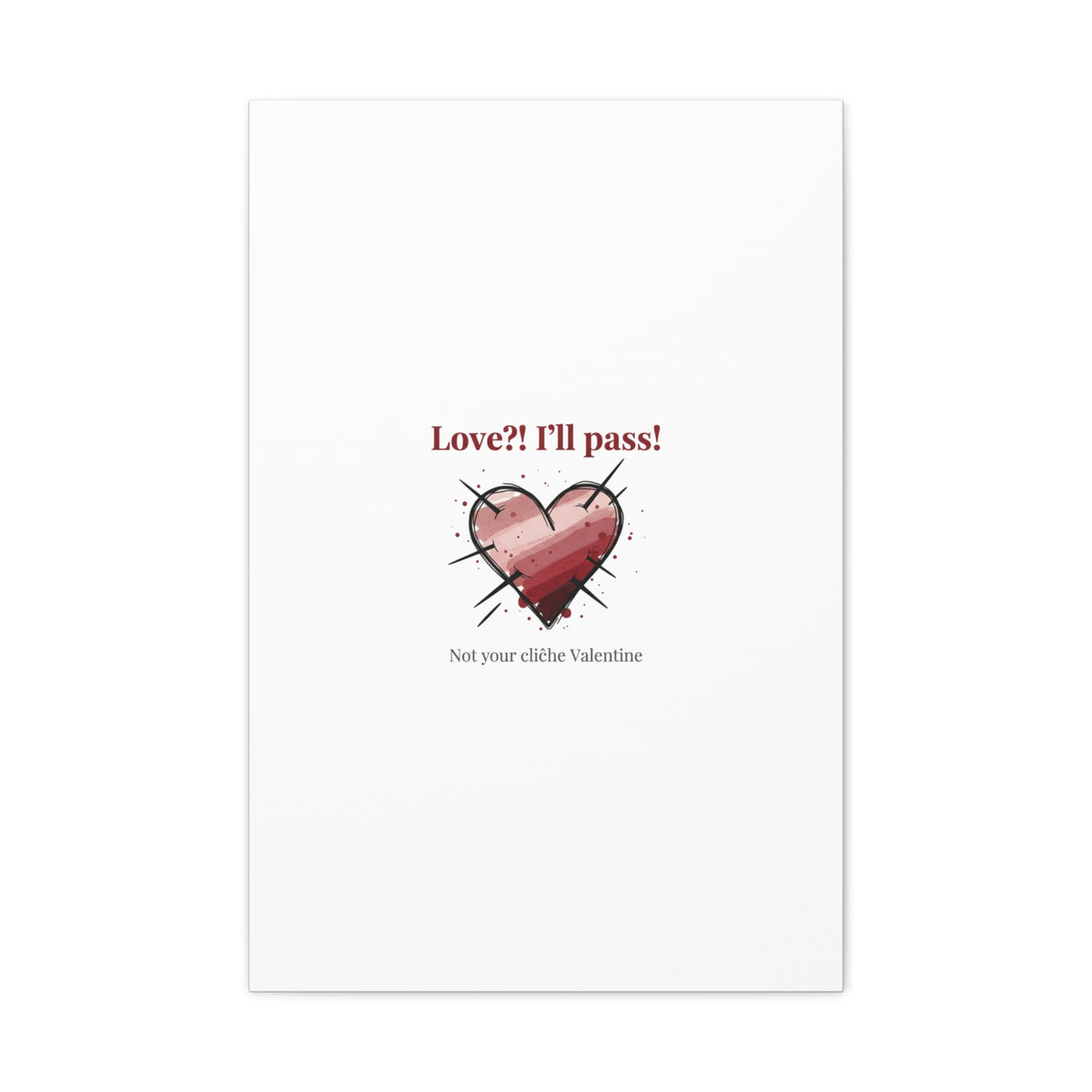 Matte stretched canvas print featuring a tongue‑in‑cheek heart illustration and snarky line that leans into the Hearts‑with‑a‑Twist anti‑Valentine trend. The artwork pairs softened pink/red heart tones with bold black sketch marks and a crisp serif headline to create a contrast of sweet and guarded. Designed as a wall conversation piece, it fits into spaces where ironic, boundary‑setting decor and bookish or punk Valentine aesthetics mix.