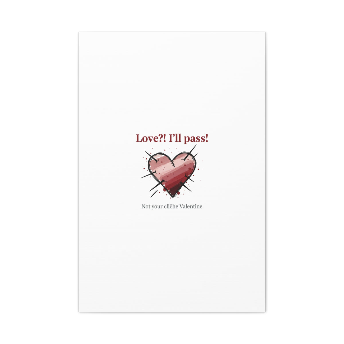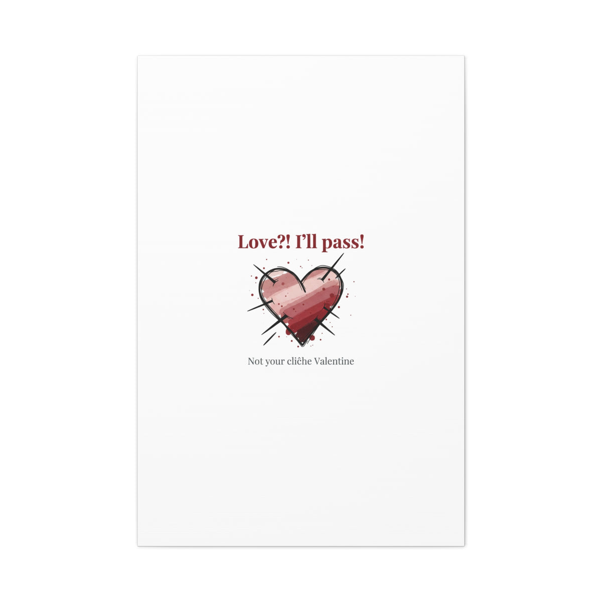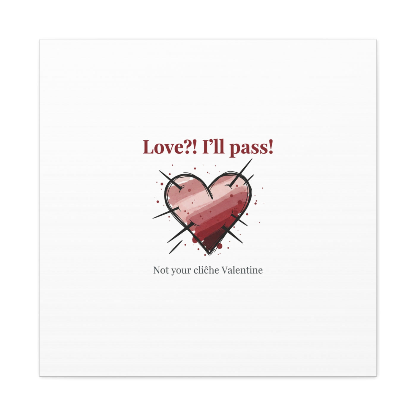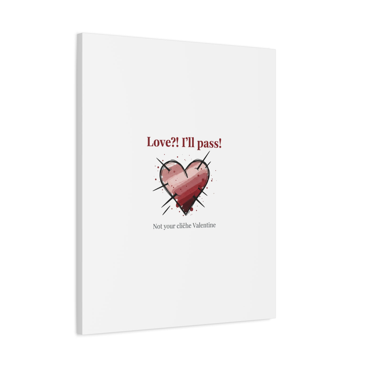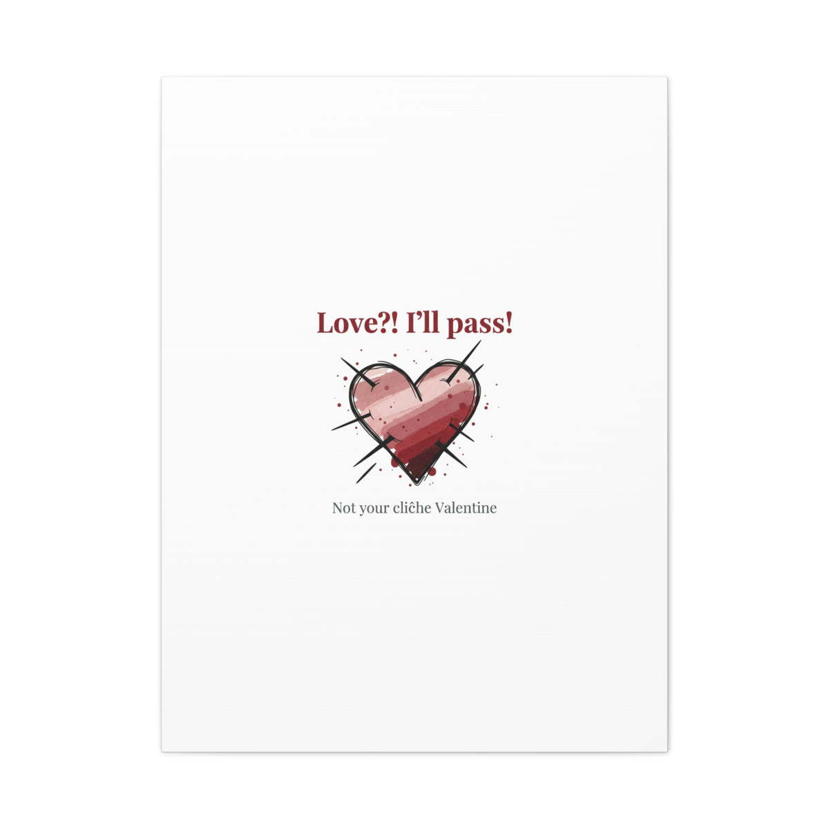 Matte stretched canvas print featuring a tongue‑in‑cheek heart illustration and snarky line that leans into the Hearts‑with‑a‑Twist anti‑Valentine trend. The artwork pairs softened pink/red heart tones with bold black sketch marks and a crisp serif headline to create a contrast of sweet and guarded. Designed as a wall conversation piece, it fits into spaces where ironic, boundary‑setting decor and bookish or punk Valentine aesthetics mix.