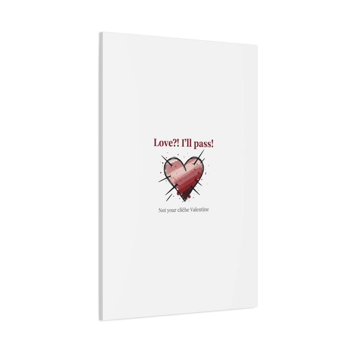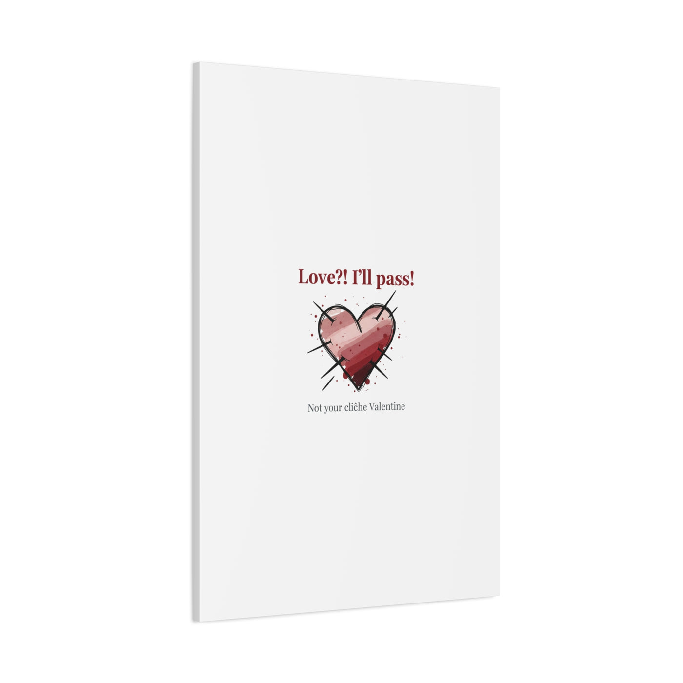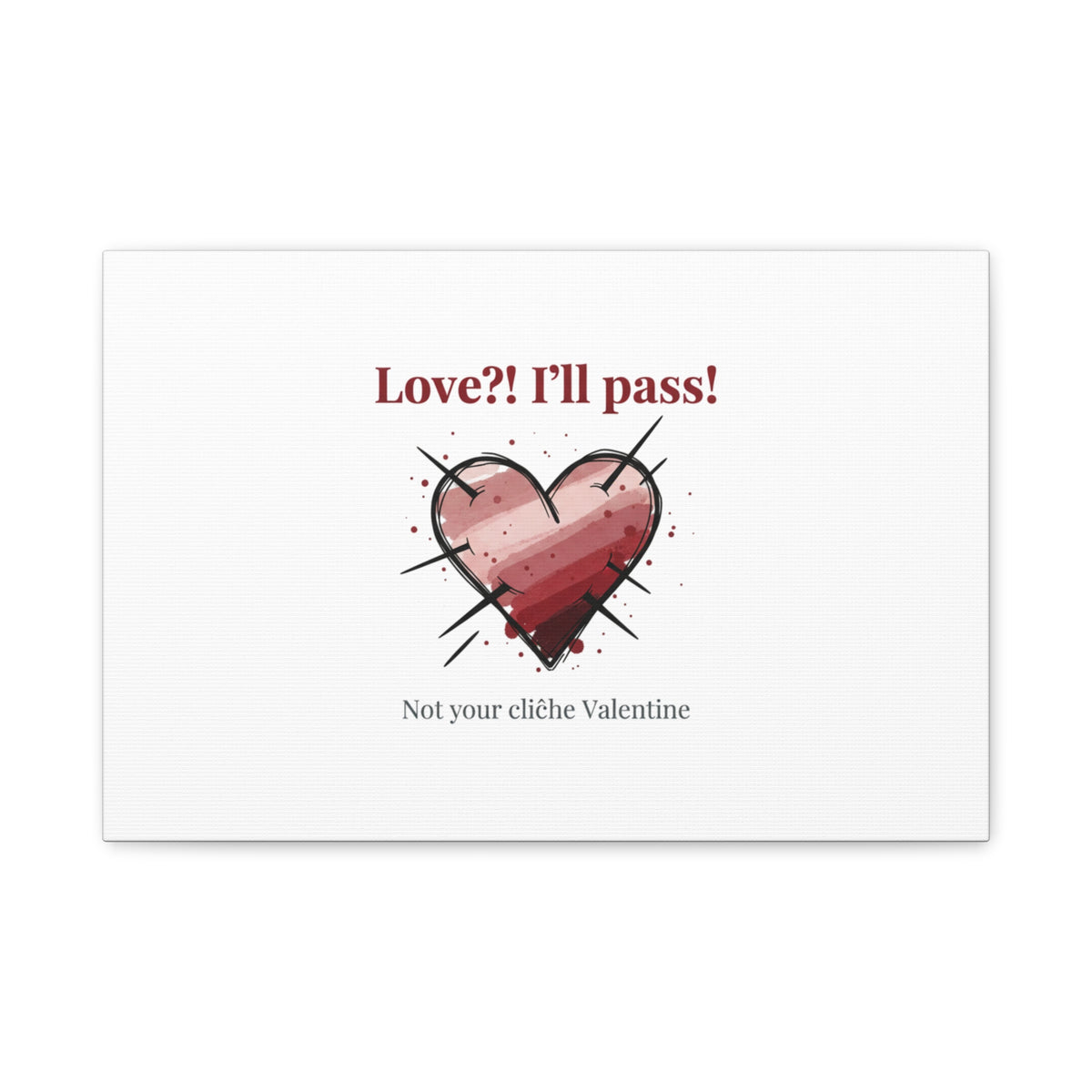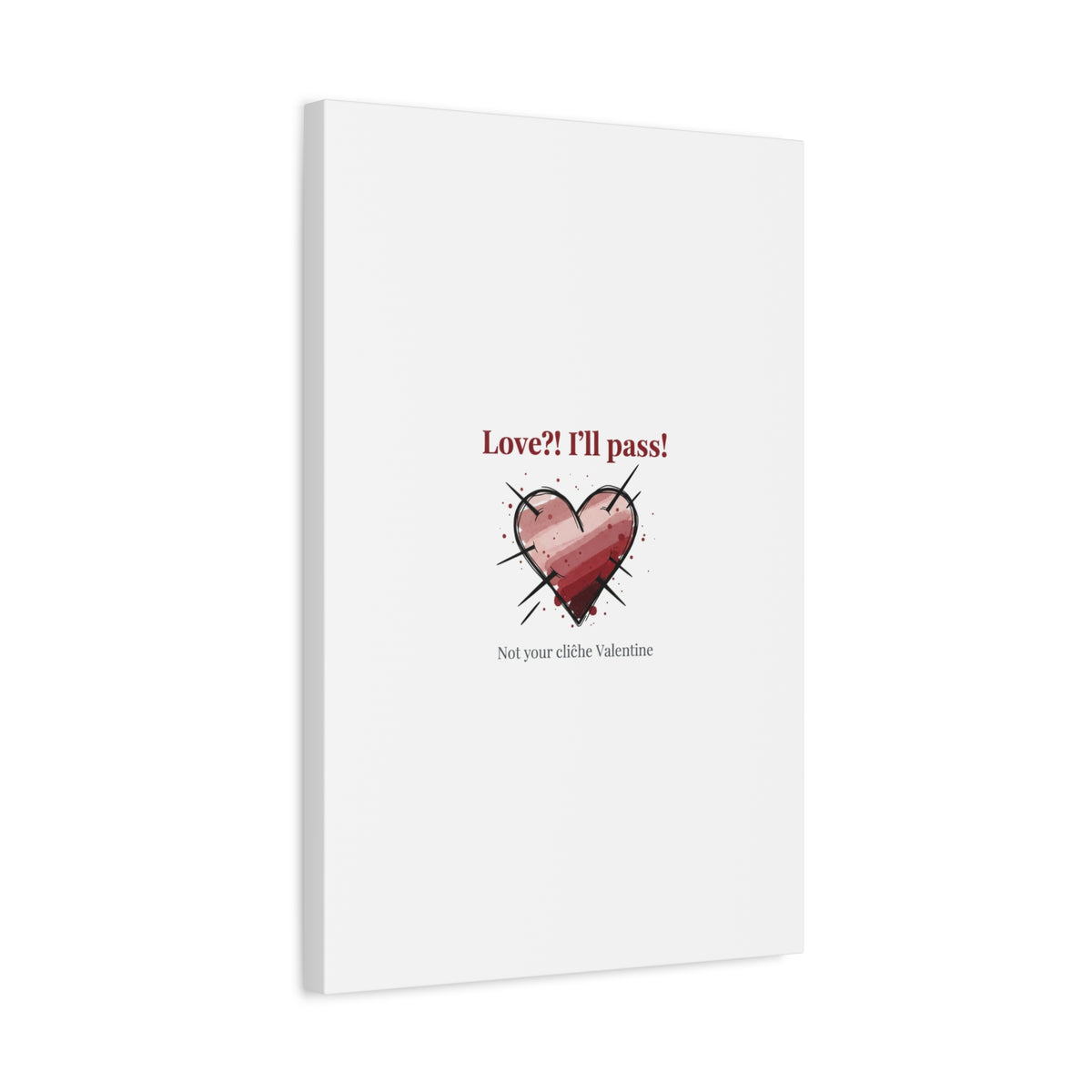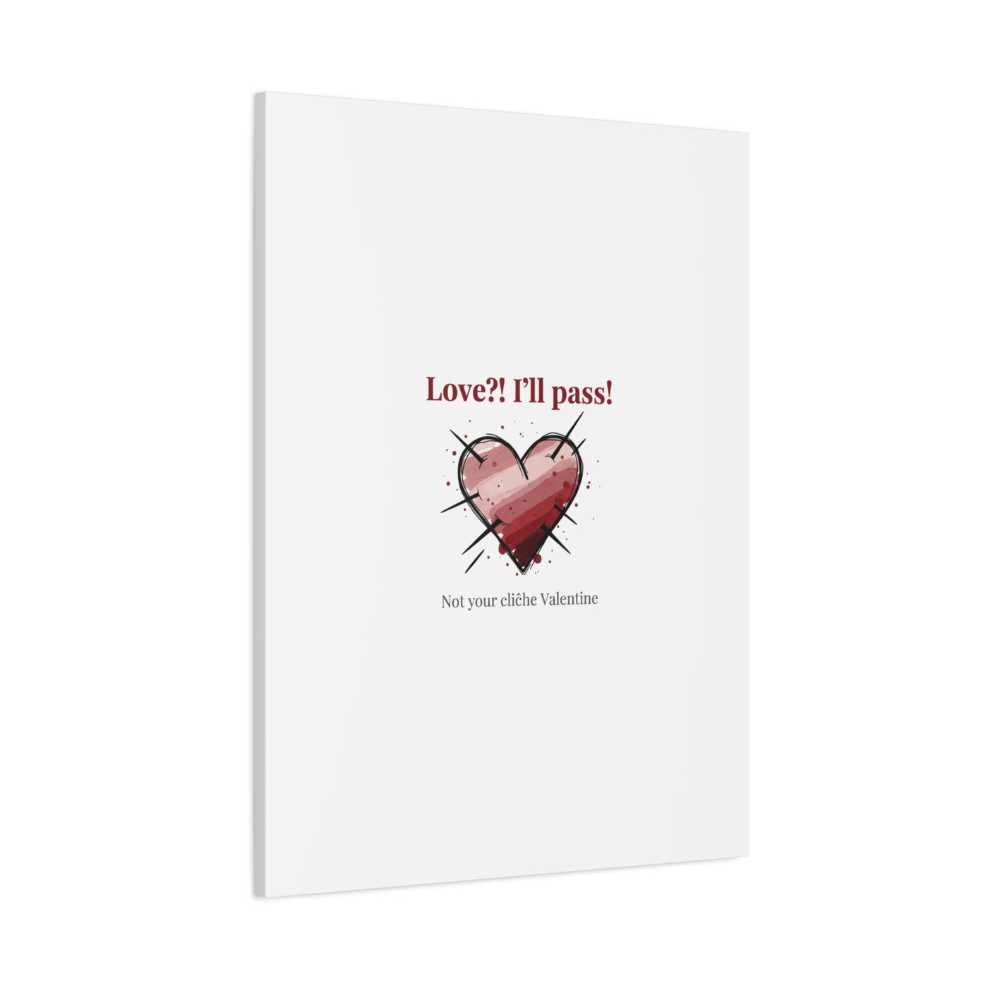 Matte stretched canvas print featuring a tongue‑in‑cheek heart illustration and snarky line that leans into the Hearts‑with‑a‑Twist anti‑Valentine trend. The artwork pairs softened pink/red heart tones with bold black sketch marks and a crisp serif headline to create a contrast of sweet and guarded. Designed as a wall conversation piece, it fits into spaces where ironic, boundary‑setting decor and bookish or punk Valentine aesthetics mix.