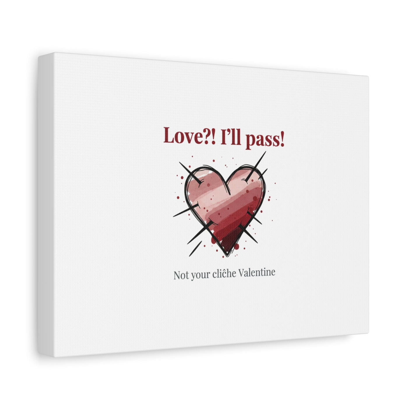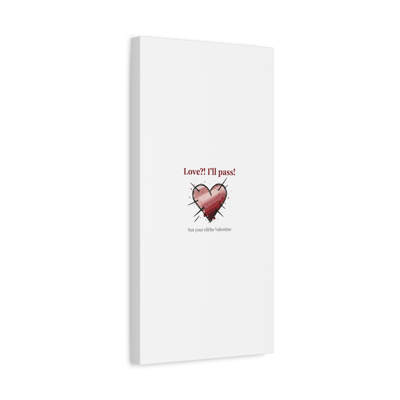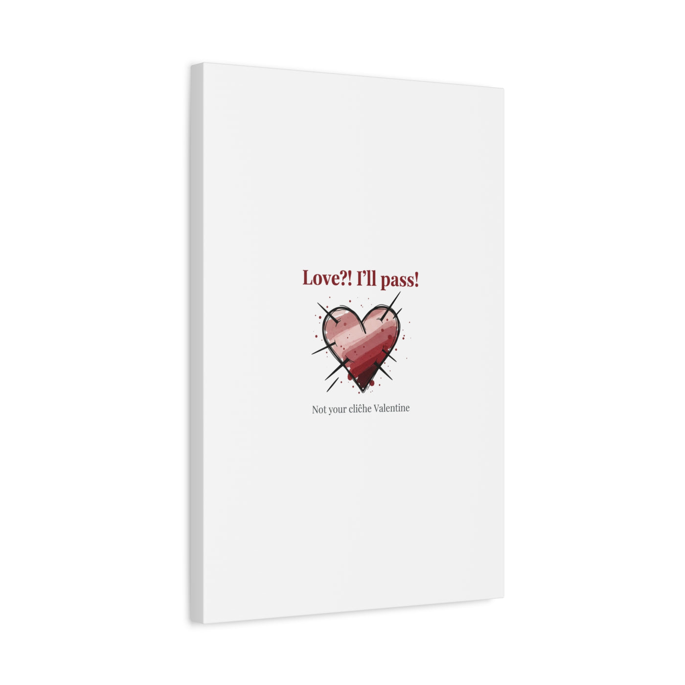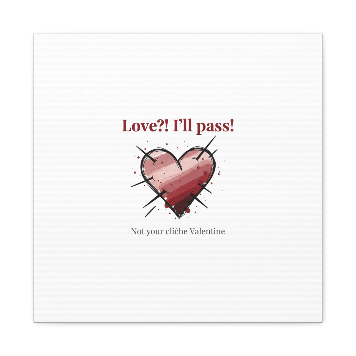 Matte stretched canvas print featuring a tongue‑in‑cheek heart illustration and snarky line that leans into the Hearts‑with‑a‑Twist anti‑Valentine trend. The artwork pairs softened pink/red heart tones with bold black sketch marks and a crisp serif headline to create a contrast of sweet and guarded. Designed as a wall conversation piece, it fits into spaces where ironic, boundary‑setting decor and bookish or punk Valentine aesthetics mix.