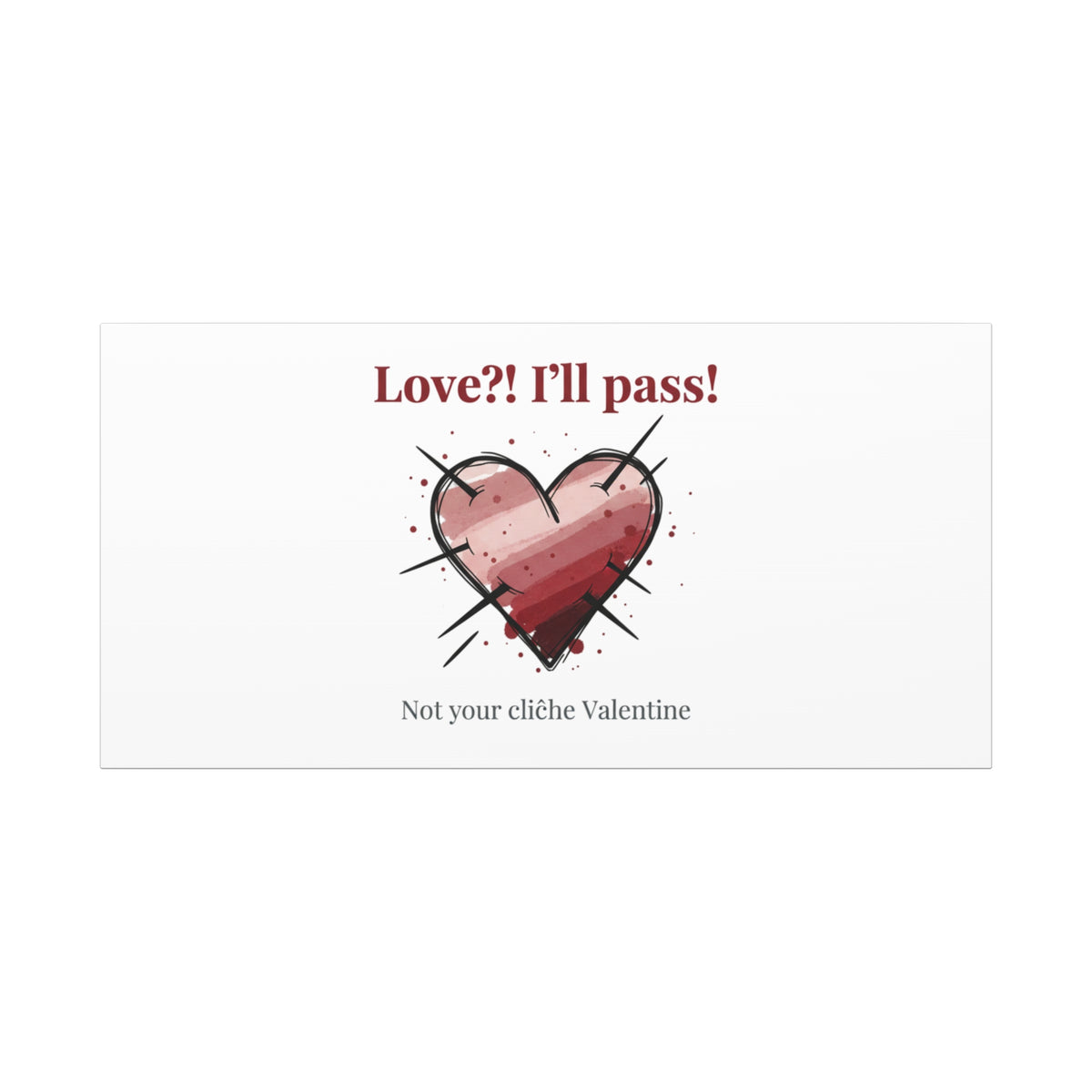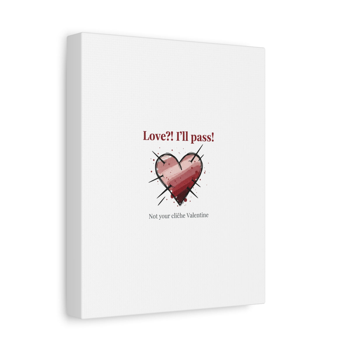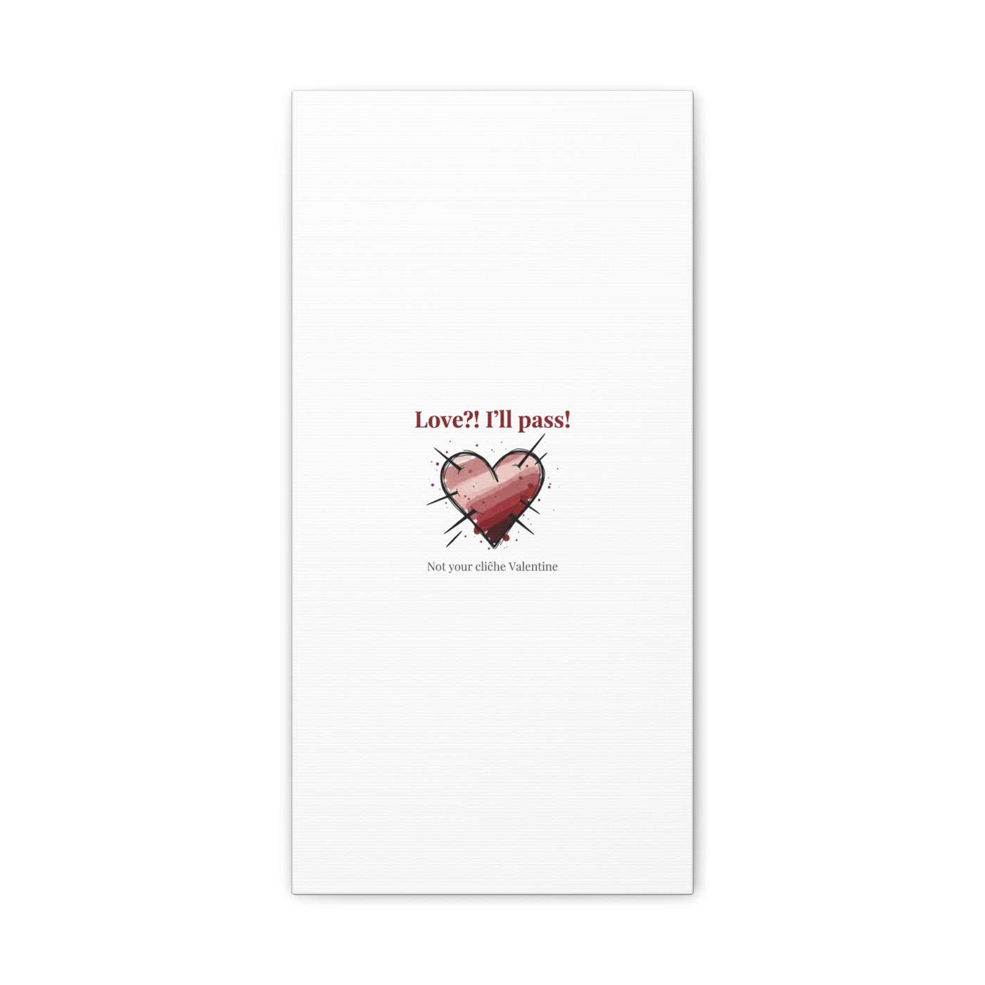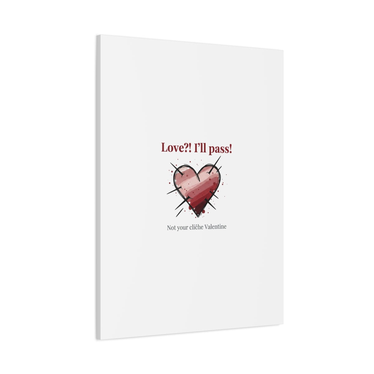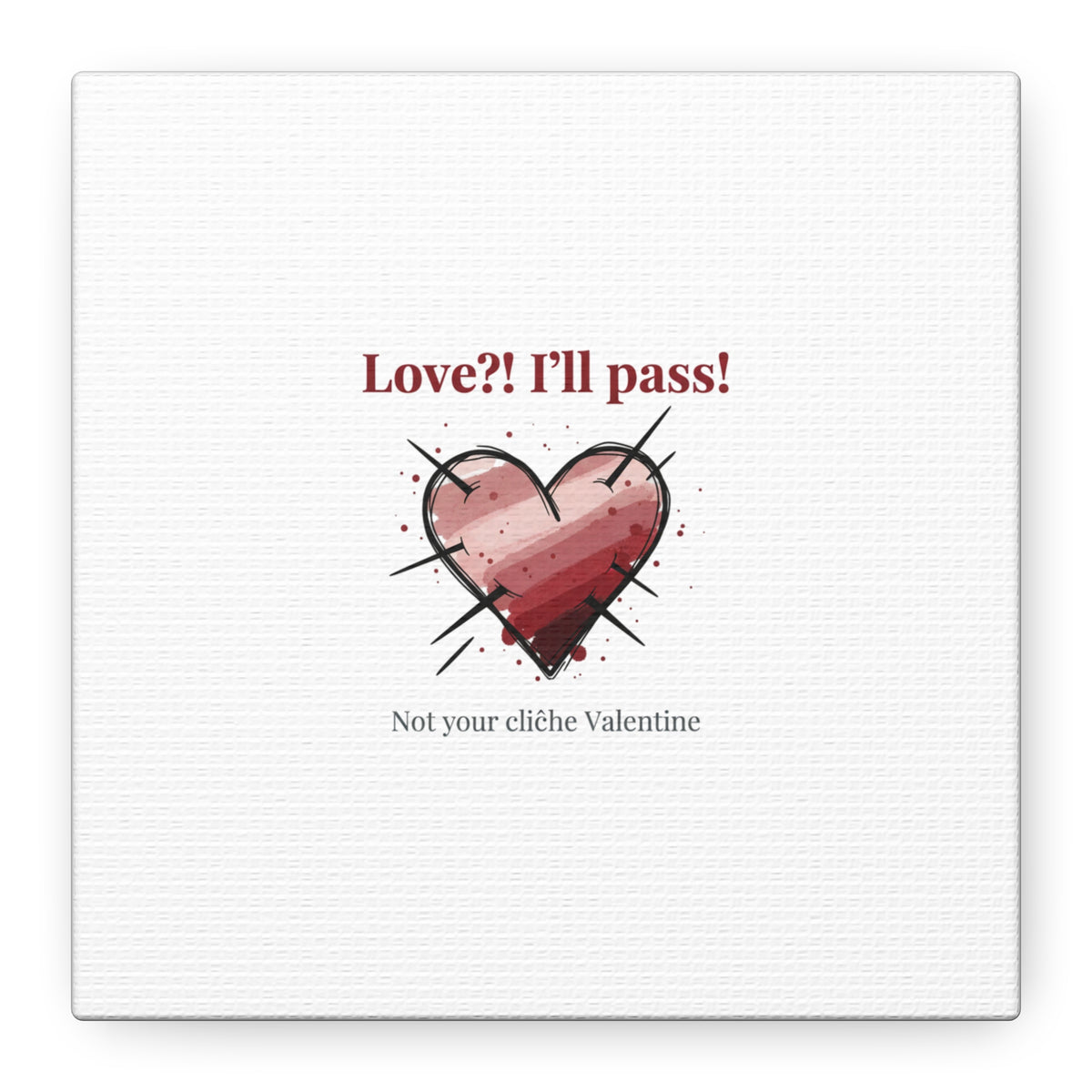 Matte stretched canvas print featuring a tongue‑in‑cheek heart illustration and snarky line that leans into the Hearts‑with‑a‑Twist anti‑Valentine trend. The artwork pairs softened pink/red heart tones with bold black sketch marks and a crisp serif headline to create a contrast of sweet and guarded. Designed as a wall conversation piece, it fits into spaces where ironic, boundary‑setting decor and bookish or punk Valentine aesthetics mix.