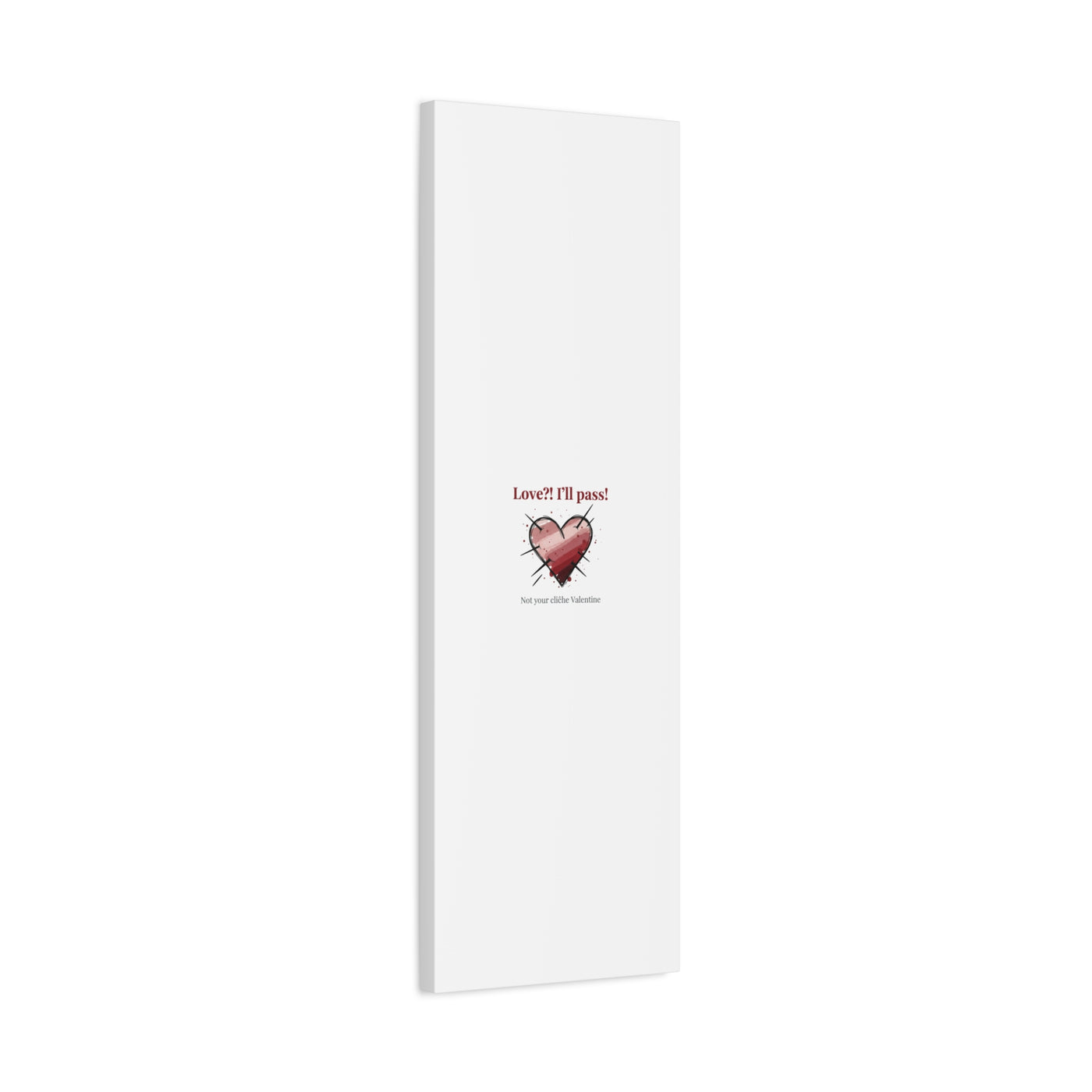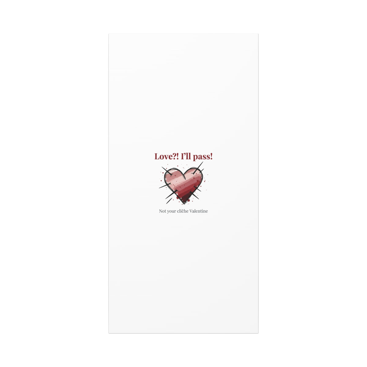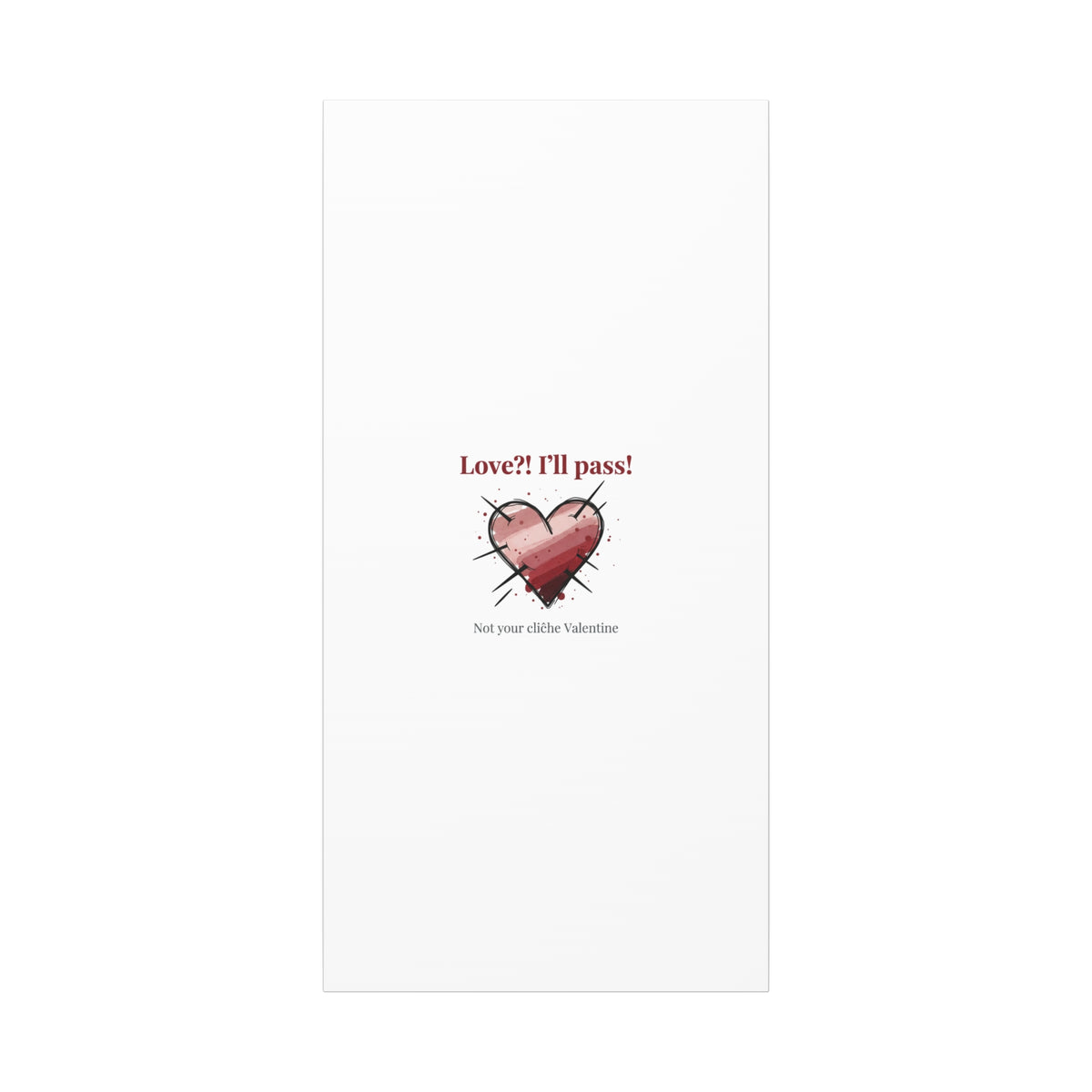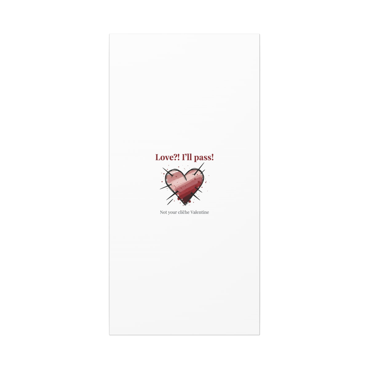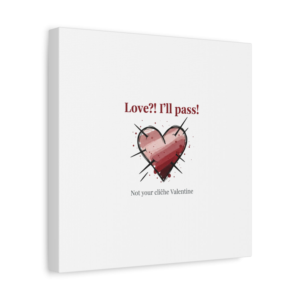 Matte stretched canvas print featuring a tongue‑in‑cheek heart illustration and snarky line that leans into the Hearts‑with‑a‑Twist anti‑Valentine trend. The artwork pairs softened pink/red heart tones with bold black sketch marks and a crisp serif headline to create a contrast of sweet and guarded. Designed as a wall conversation piece, it fits into spaces where ironic, boundary‑setting decor and bookish or punk Valentine aesthetics mix.