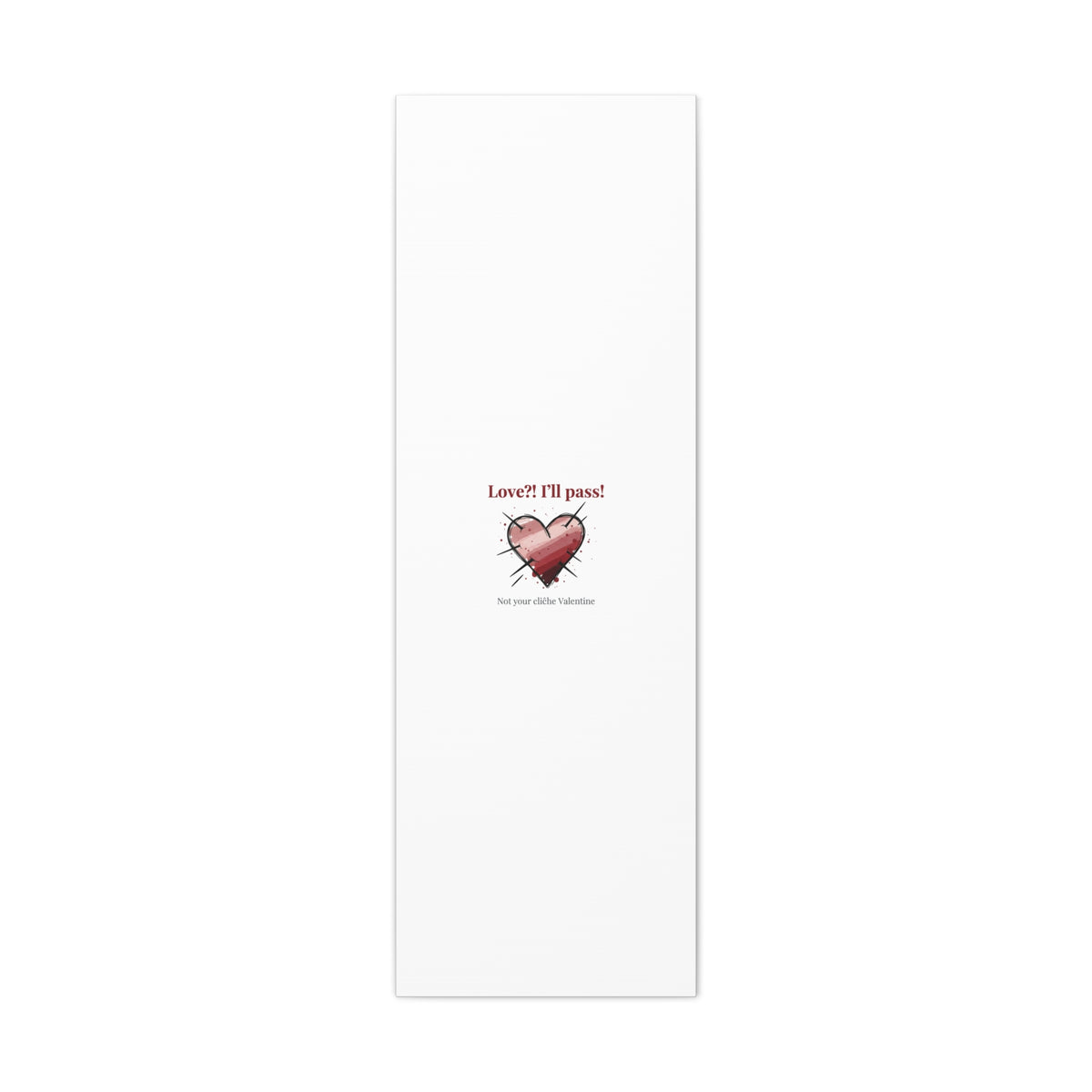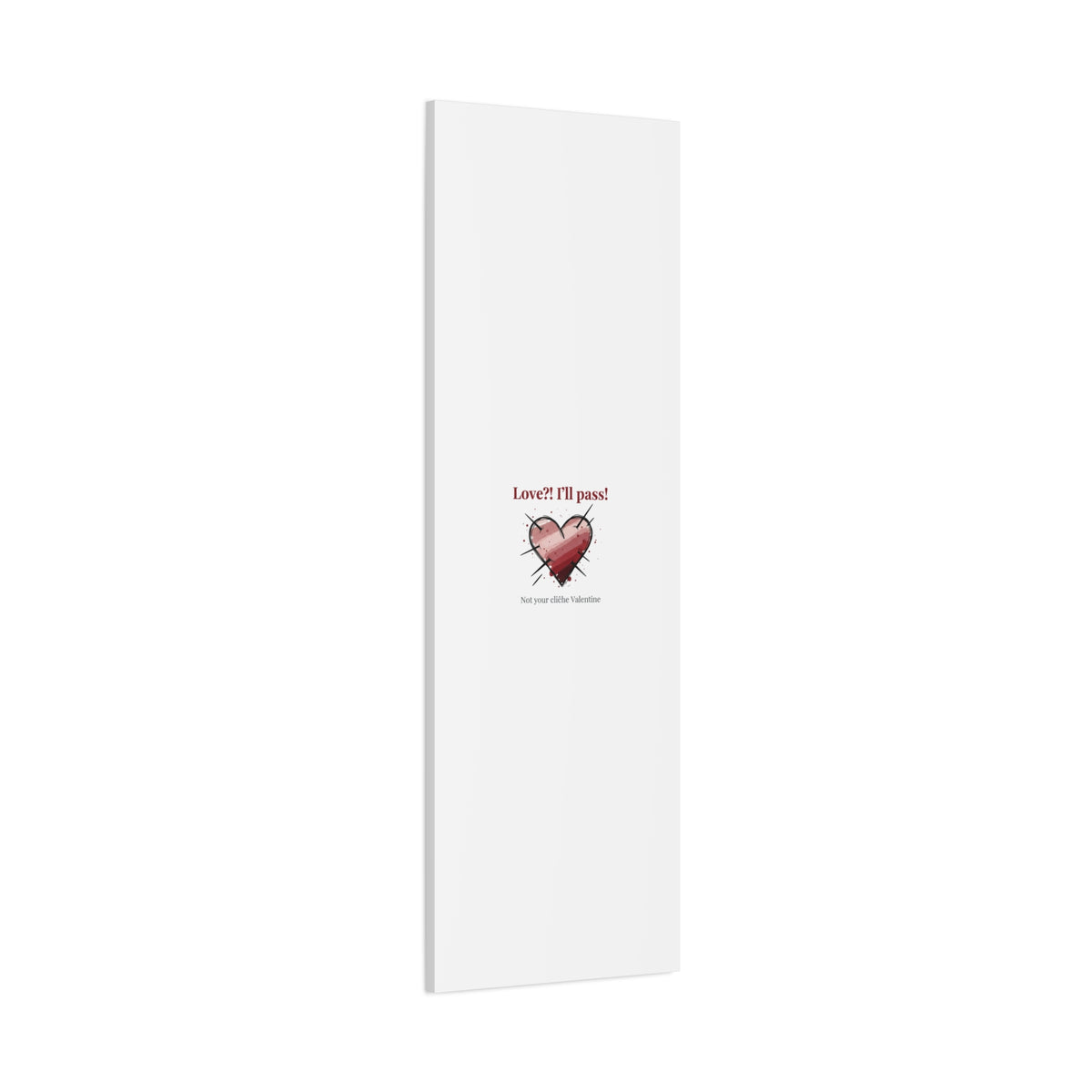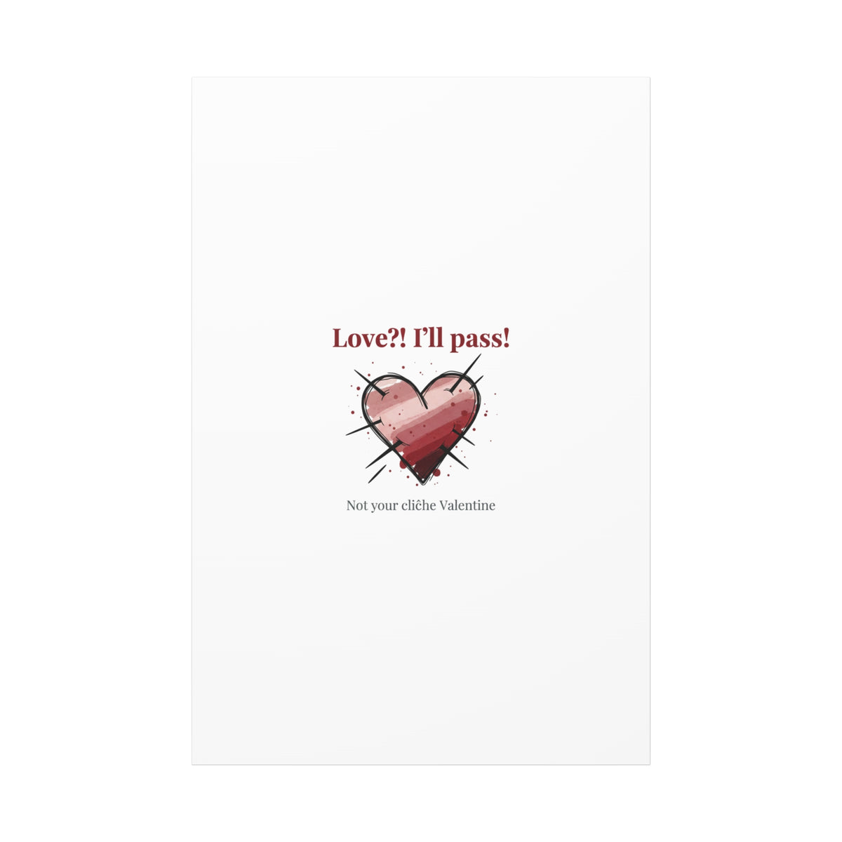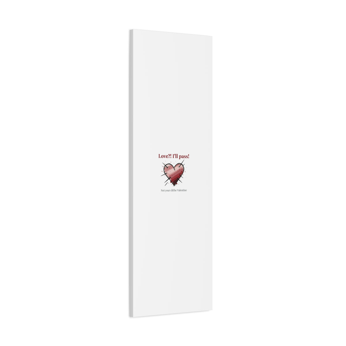 Matte stretched canvas print featuring a tongue‑in‑cheek heart illustration and snarky line that leans into the Hearts‑with‑a‑Twist anti‑Valentine trend. The artwork pairs softened pink/red heart tones with bold black sketch marks and a crisp serif headline to create a contrast of sweet and guarded. Designed as a wall conversation piece, it fits into spaces where ironic, boundary‑setting decor and bookish or punk Valentine aesthetics mix.