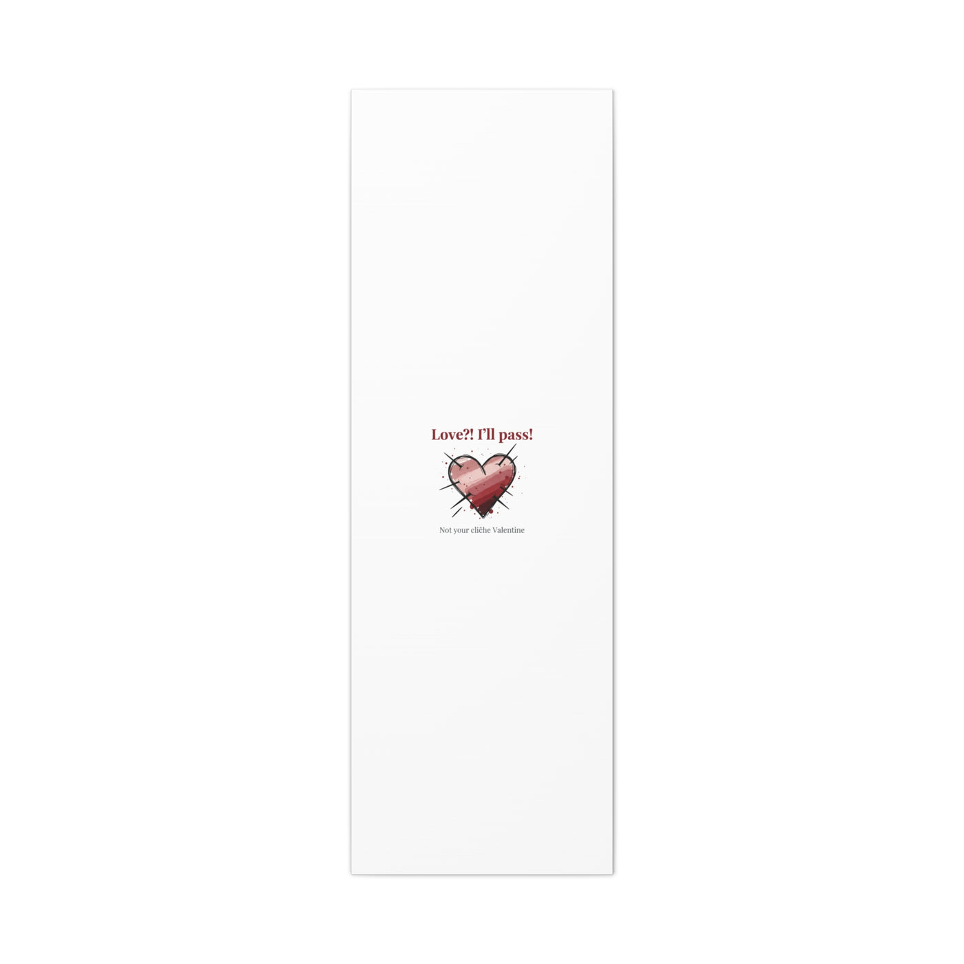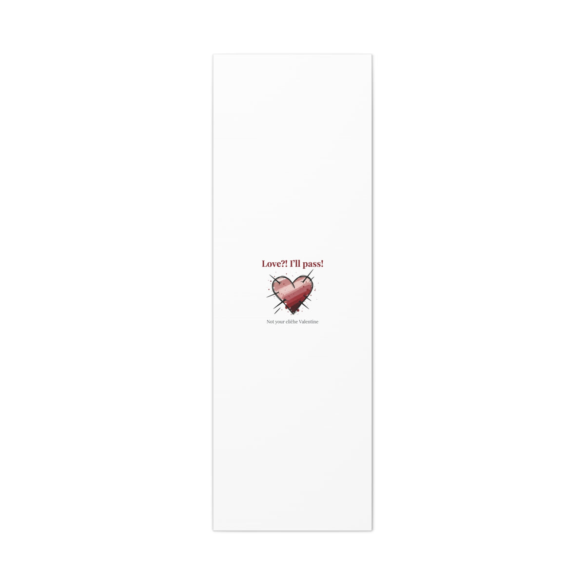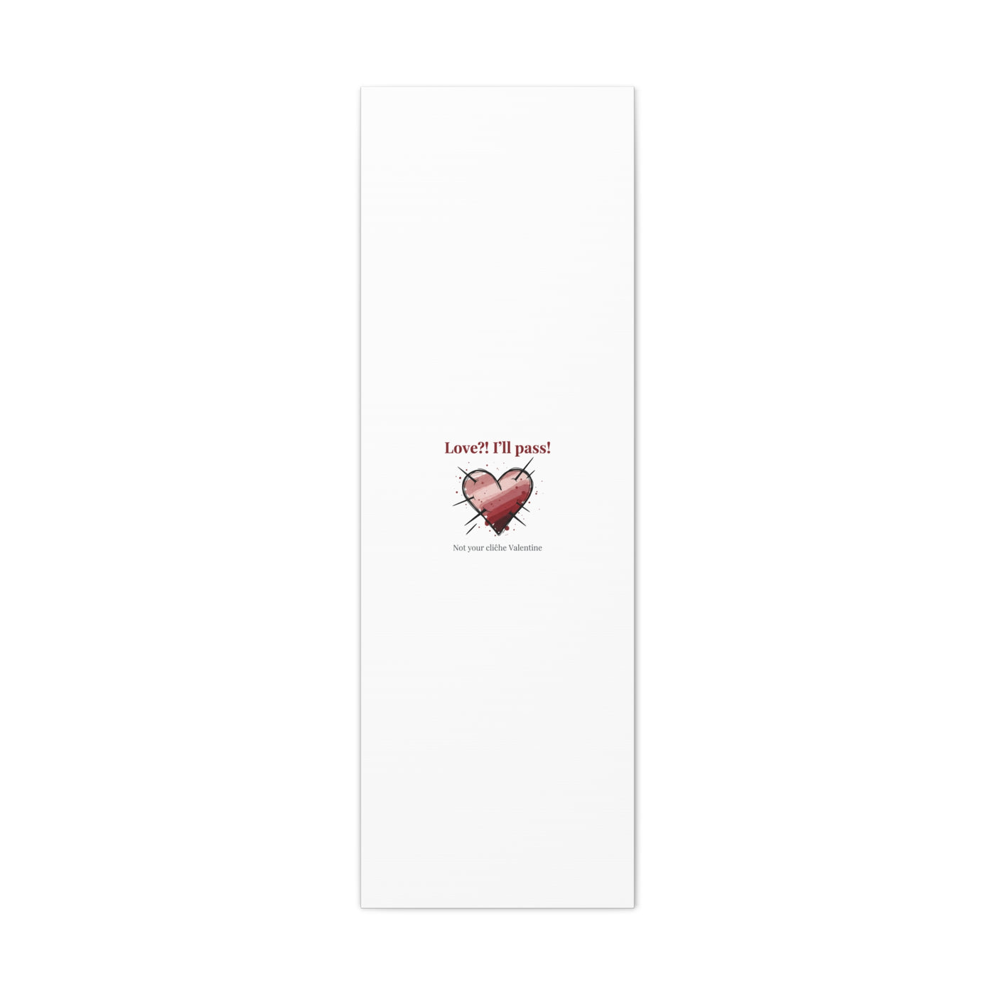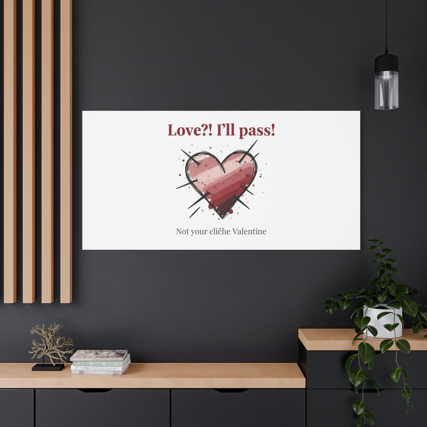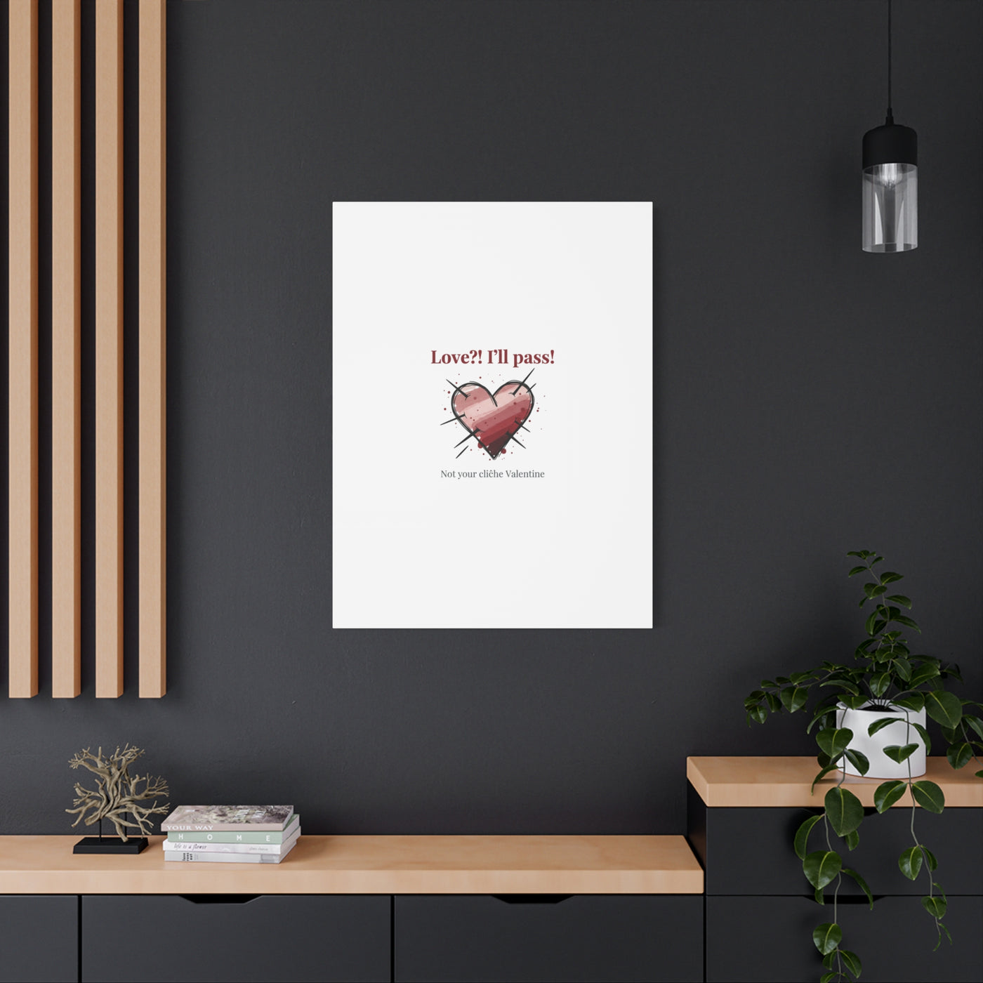 Matte stretched canvas print featuring a tongue‑in‑cheek heart illustration and snarky line that leans into the Hearts‑with‑a‑Twist anti‑Valentine trend. The artwork pairs softened pink/red heart tones with bold black sketch marks and a crisp serif headline to create a contrast of sweet and guarded. Designed as a wall conversation piece, it fits into spaces where ironic, boundary‑setting decor and bookish or punk Valentine aesthetics mix.