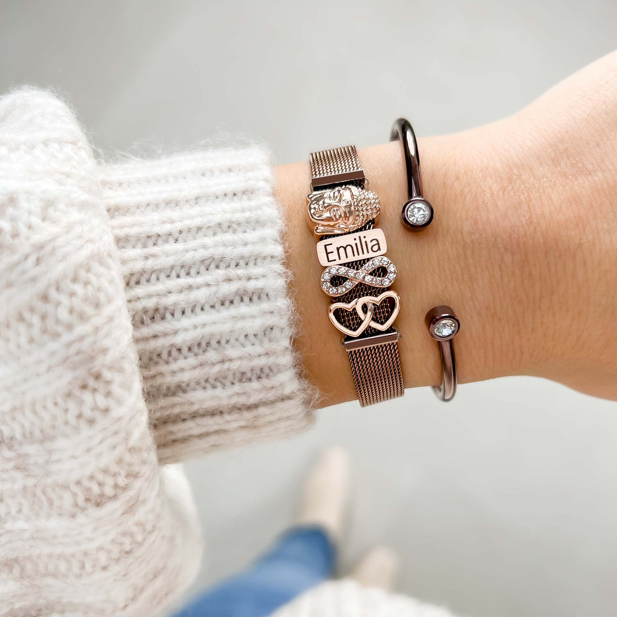 The updated and more luxurious version of the popular Mesh bracelet. The bracelet is easy to fasten with the buckle and is delivered with 2 stoppers for holding the charms in place and a small screwdriver to adjust the bracelet. The bracelet is slightly thicker and is therefore stronger. Easy to fasten and the charms are easily interchangeable. The bracelet is presented in a luxury box.