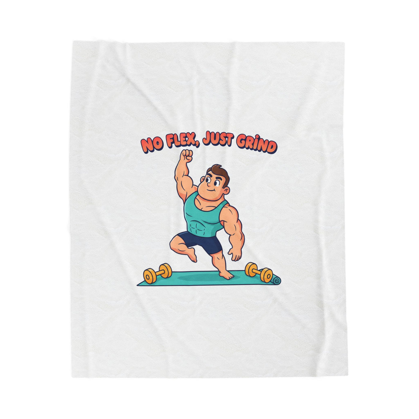 A cozy velveteen blanket printed with a playful gym-motivational illustration and low-pressure mantra. Bright, cartoon-style artwork shows a friendly, muscular character mid-lunge beside small dumbbells with the phrase “No Flex, Just Grind,” matching the Gym Comeback/Gymtimidation vibe that celebrates showing up. The soft, medium-weight velveteen surface keeps colors vibrant on one side while providing a comforting layer for post-workout cool-downs or relaxed mornings of renewed routine.
