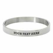 The bangle is oval-shaped and maintains a nice fit around the wrist whereby the engraved text is always visible. It is made of stainless-steel and is therefore not prone to discoloration. Thanks to the beautiful snap clasp, the bangle maintains its perfect shape. The bracelet can be personalized with up to 30 characters. The engraving is performed with a laser which gives a beautiful black engravement and will never fade.