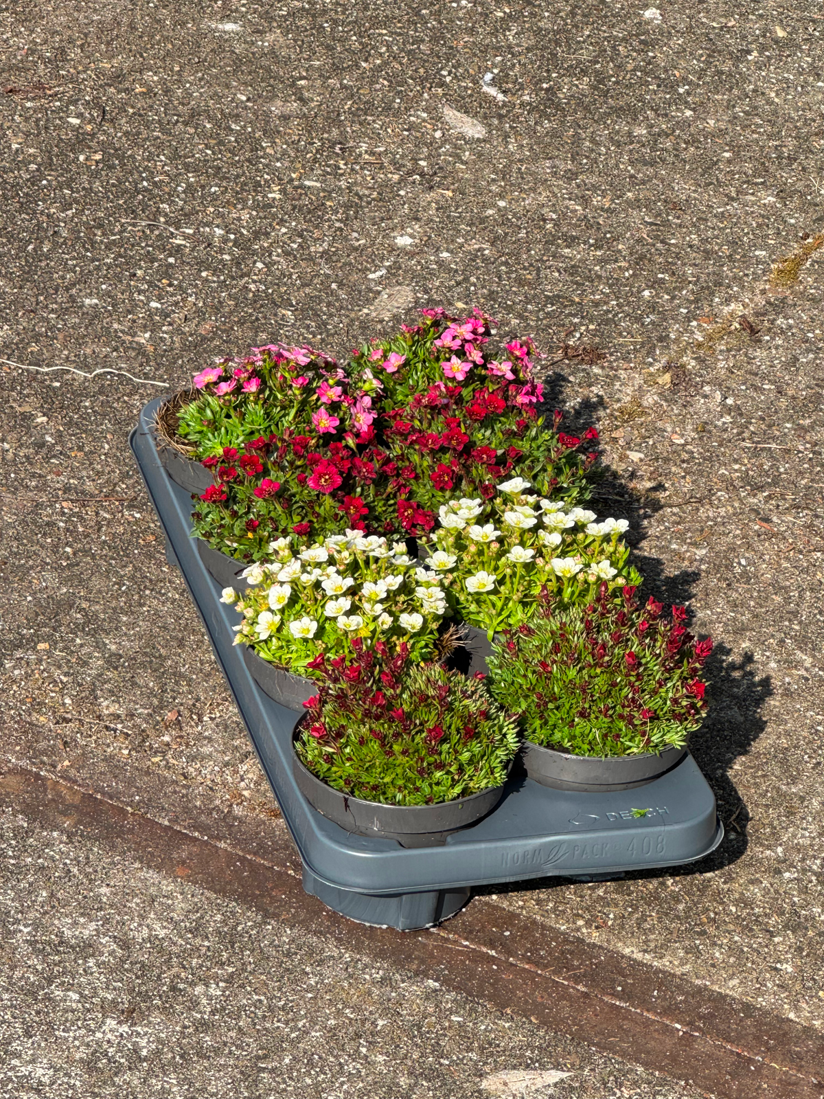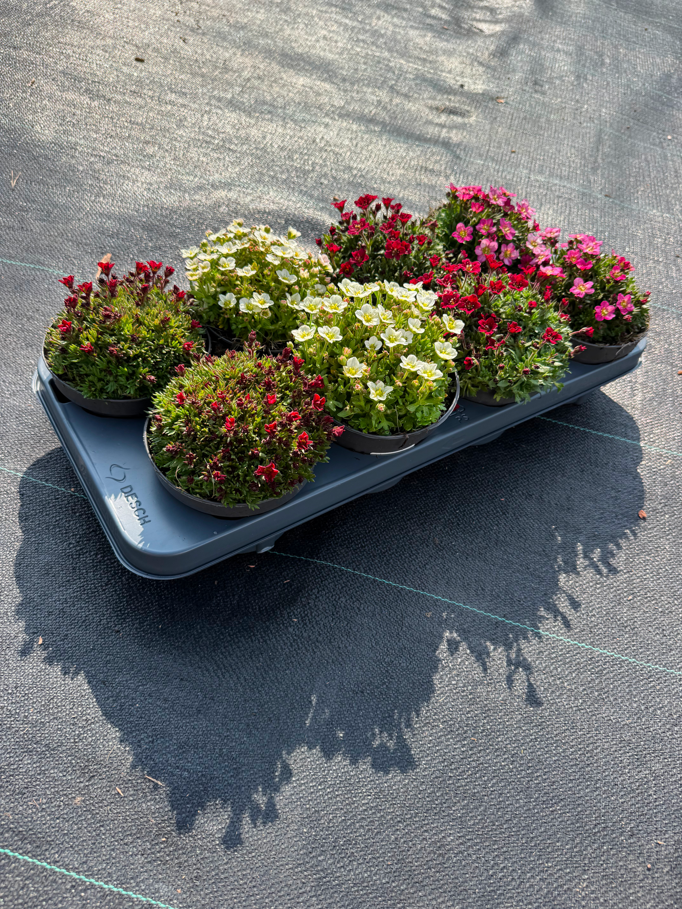Wil je een laagblijvend, kleurrijk tapijt in je tuin? Dit saxifragapakket biedt een schitterende mix van vier soorten: De Saxifraga (A) 'Alpino Early Pink', met haar delicate roze bloemen, de Saxifraga (A) 'Touran Deep Red', die zorgt voor een opvallend dieprood accent, de Saxifraga (A) 'Touran Large White', die friswitte bloemen toevoegt, en de Saxifraga (A) 'Touran Pink', een charmante roze bloeier die het geheel afmaakt. Samen vormen ze een prachtig contrast en brengen ze kleur in borders, rotstuinen en randen. De plantjes hebben bij levering een hoogte van tussen de 0 en 20 centimeter, afhankelijk van de periode van het jaar.
